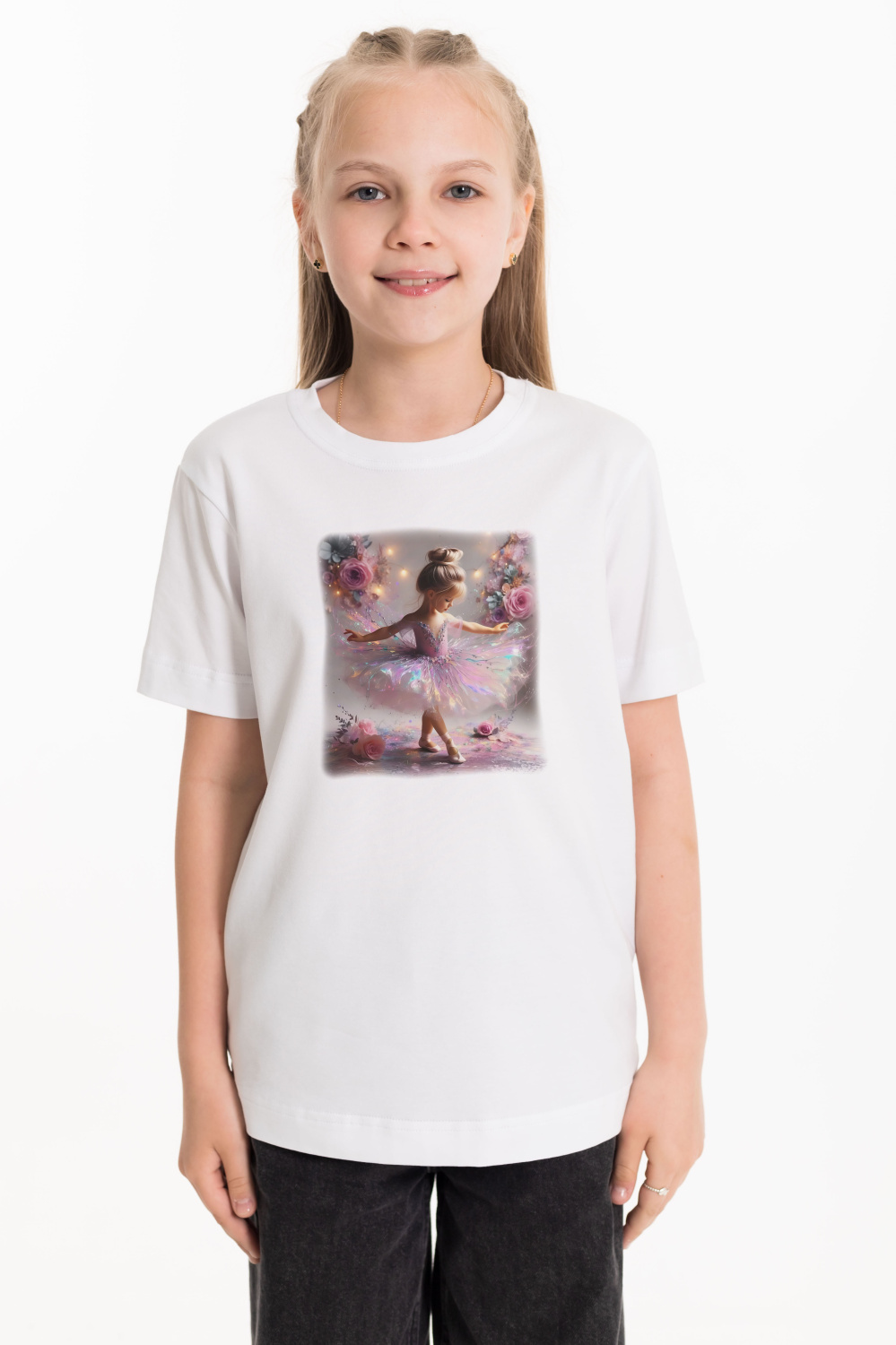 Круглый вырез горловины, втачной рукав, на полочке принт.