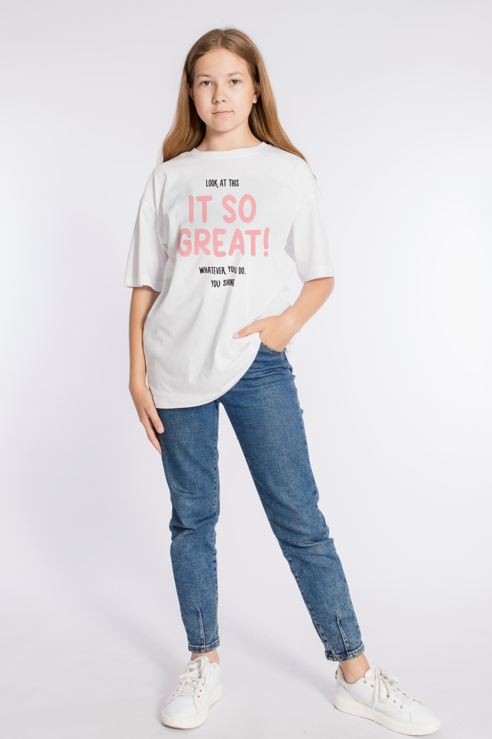 Футболка оверсайз из однотонной кулирки, 100% хлопок. С коротким рукавом и круглым вырезом горловины, оформленным планкой. Спереди нанесён принт.