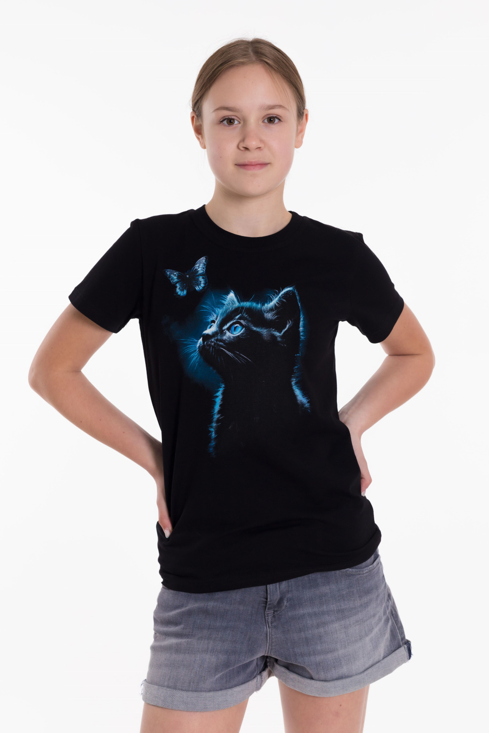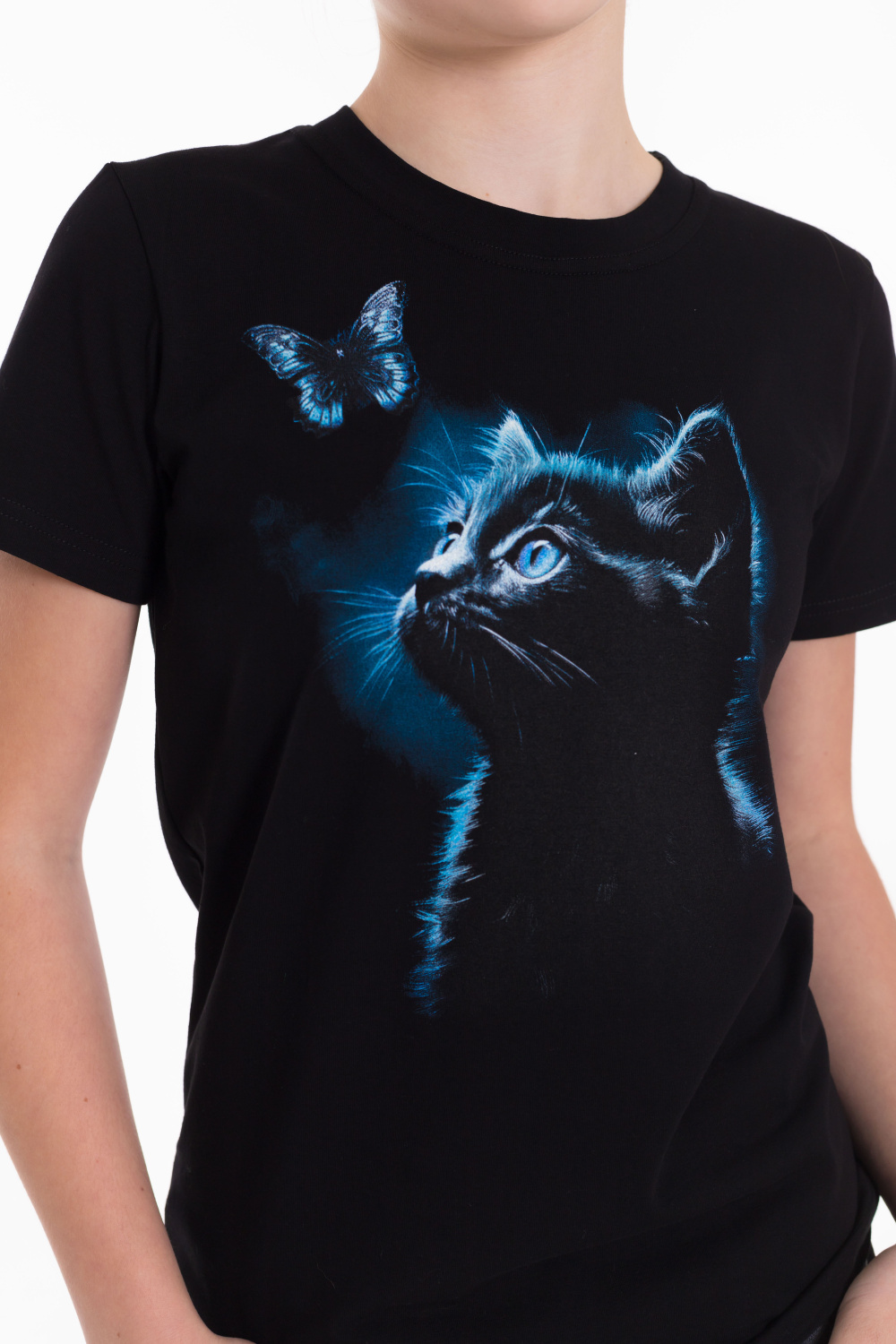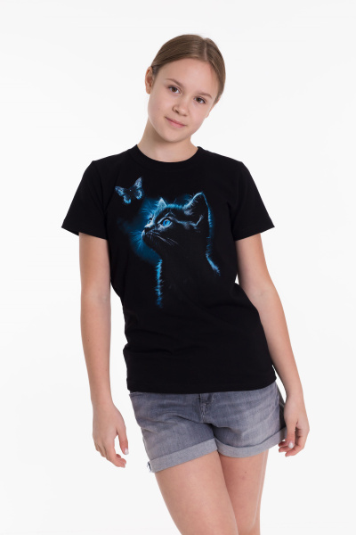 Круглый вырез горловины, втачной рукав, на полочке принт.