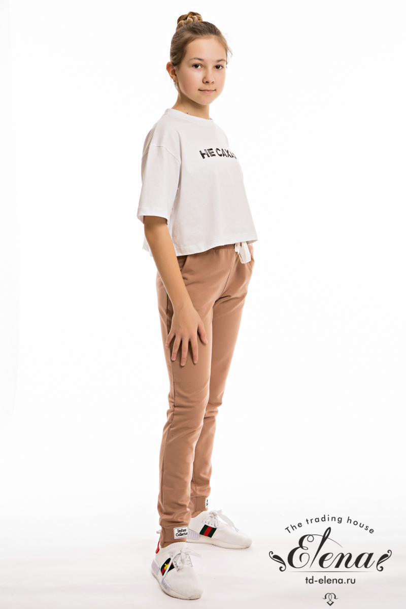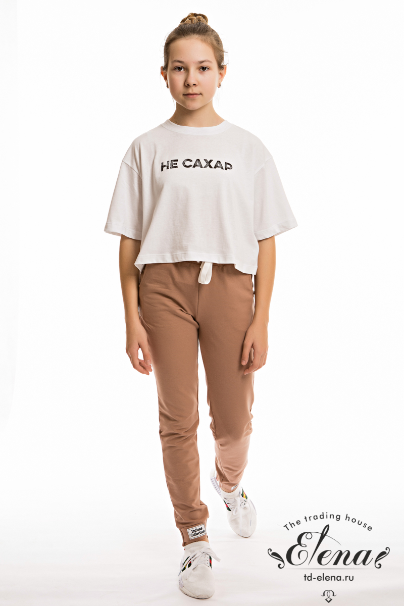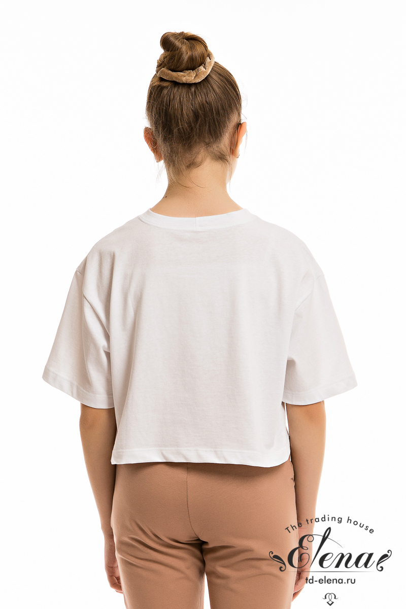 Модная футболка для девочек выполнена из однотонной кулирки. Футболка короткая, свободная, со спущенной линией плеча и рукавом длиной до локтя. Спереди нанесён принт.