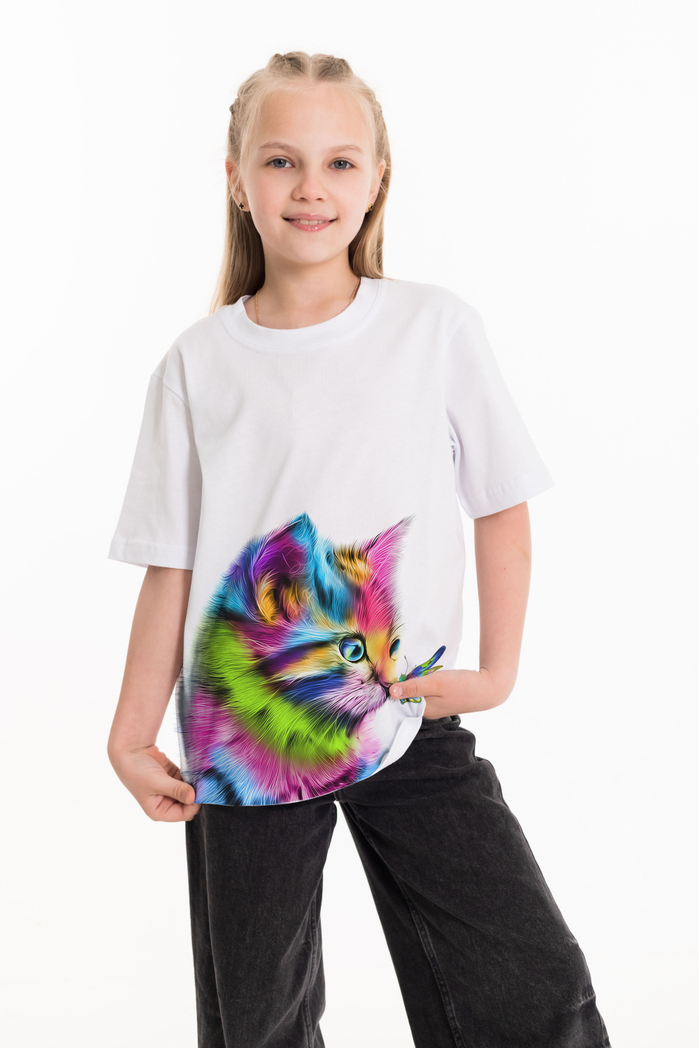 Футболка выполнена из однотонной кулирки, 100% хлопок. С коротким рукавом и круглым вырезом горловины, оформленным планкой. Спереди нанесён принт.