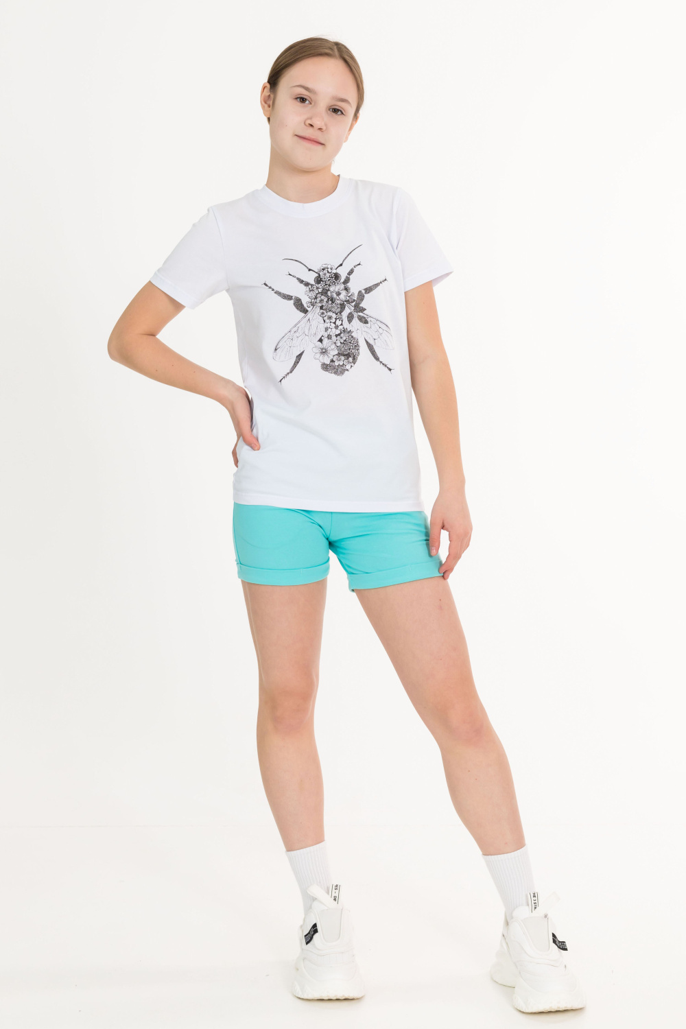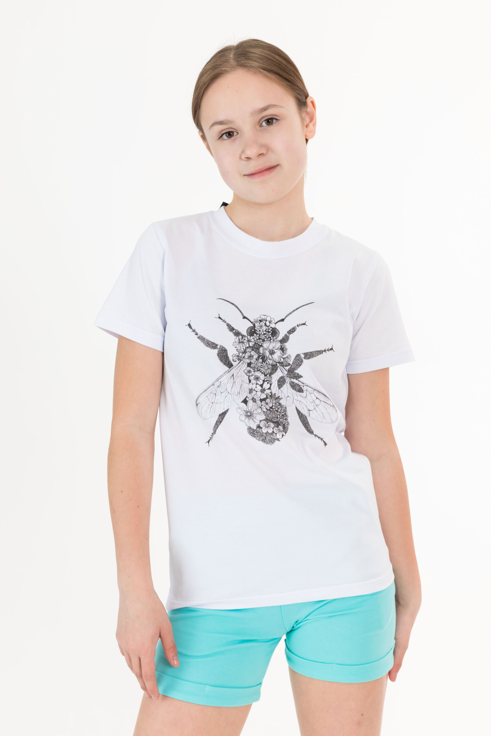 Футболка выполнена из х/б полотна с лайкрой, с коротким рукавом и круглым вырезом горловины. Спереди нанесён оригинальный принт.