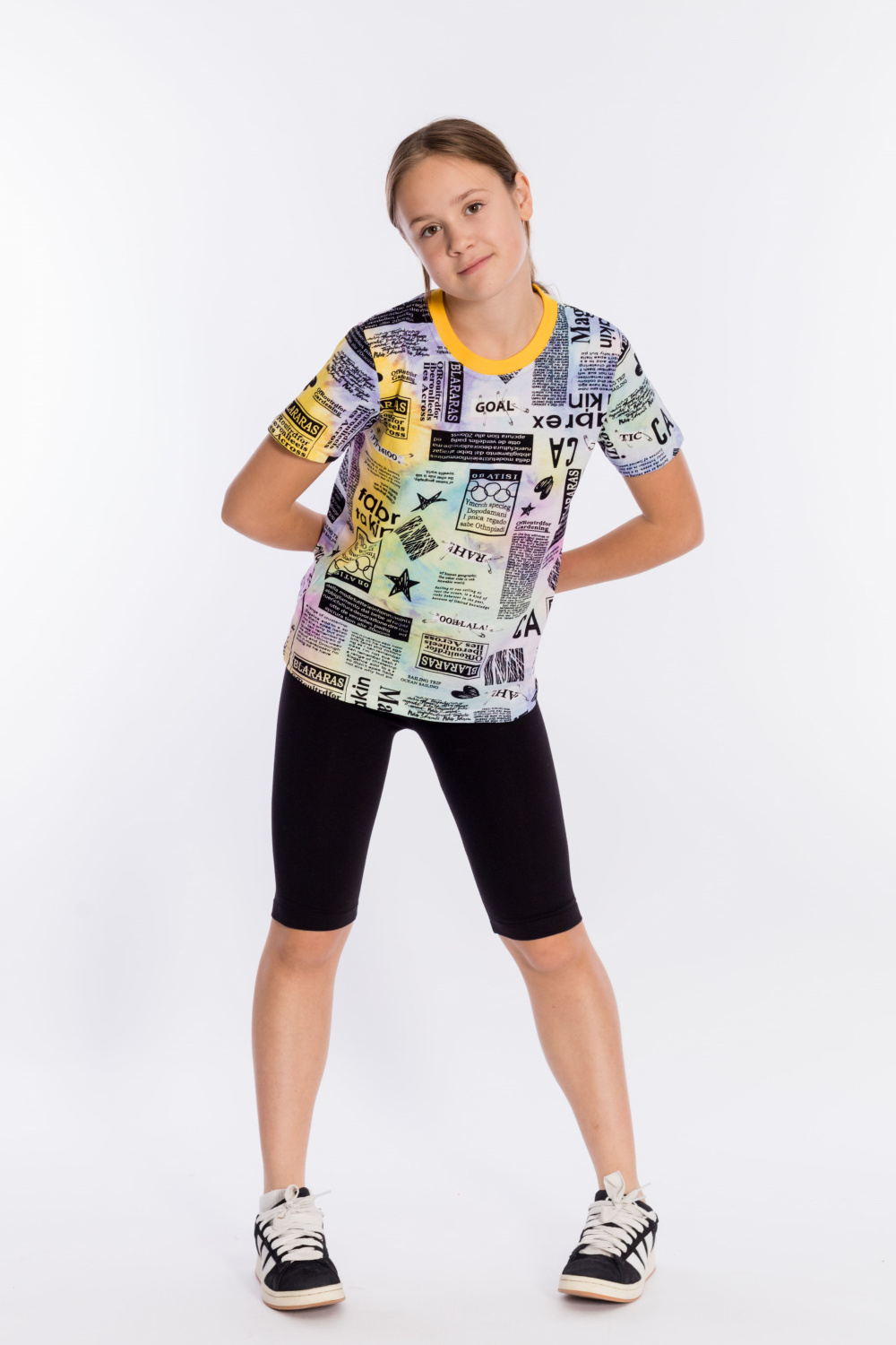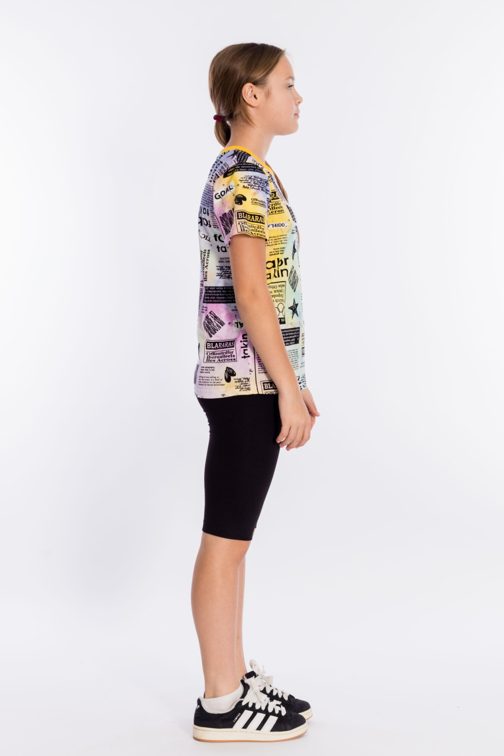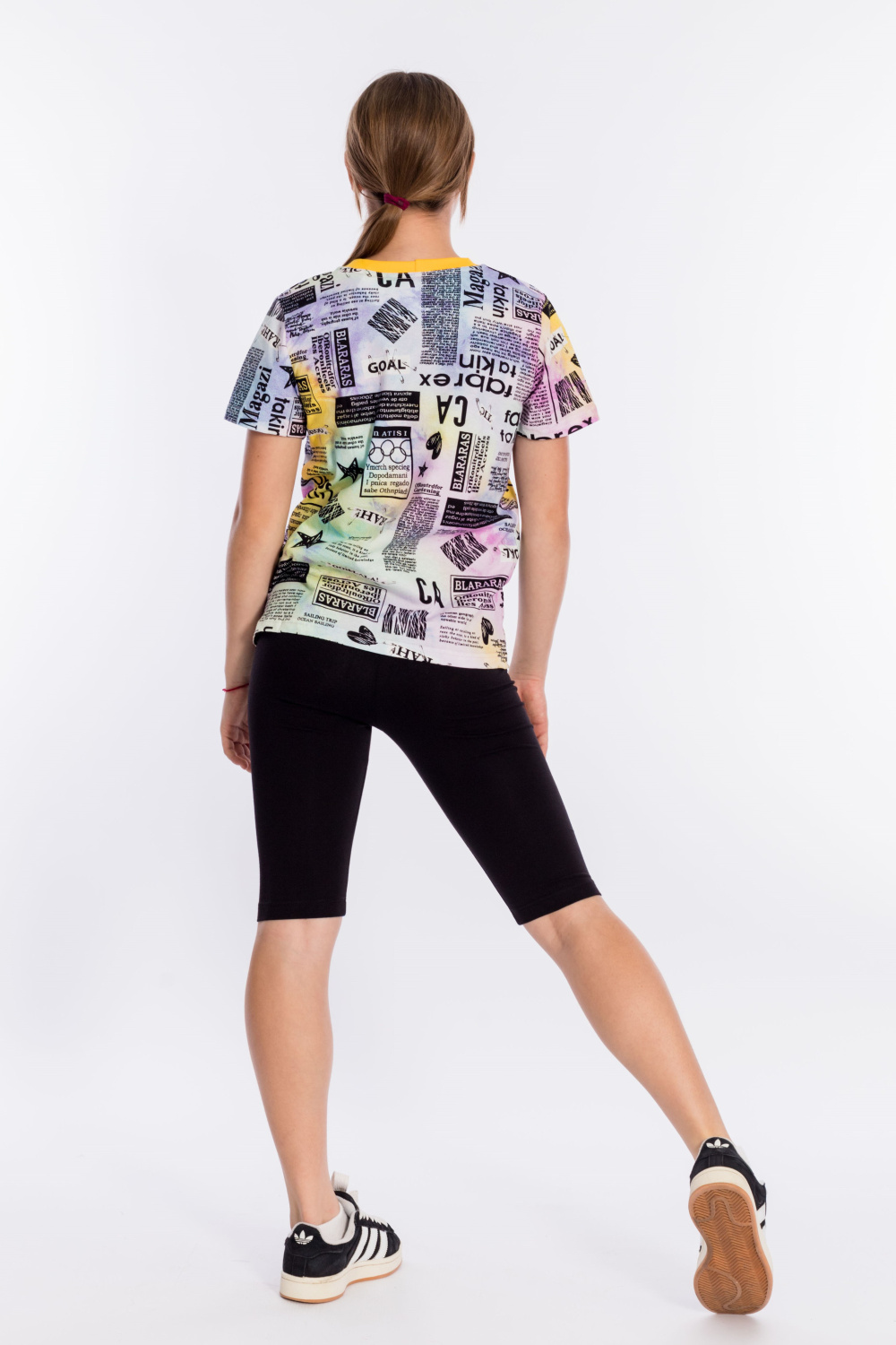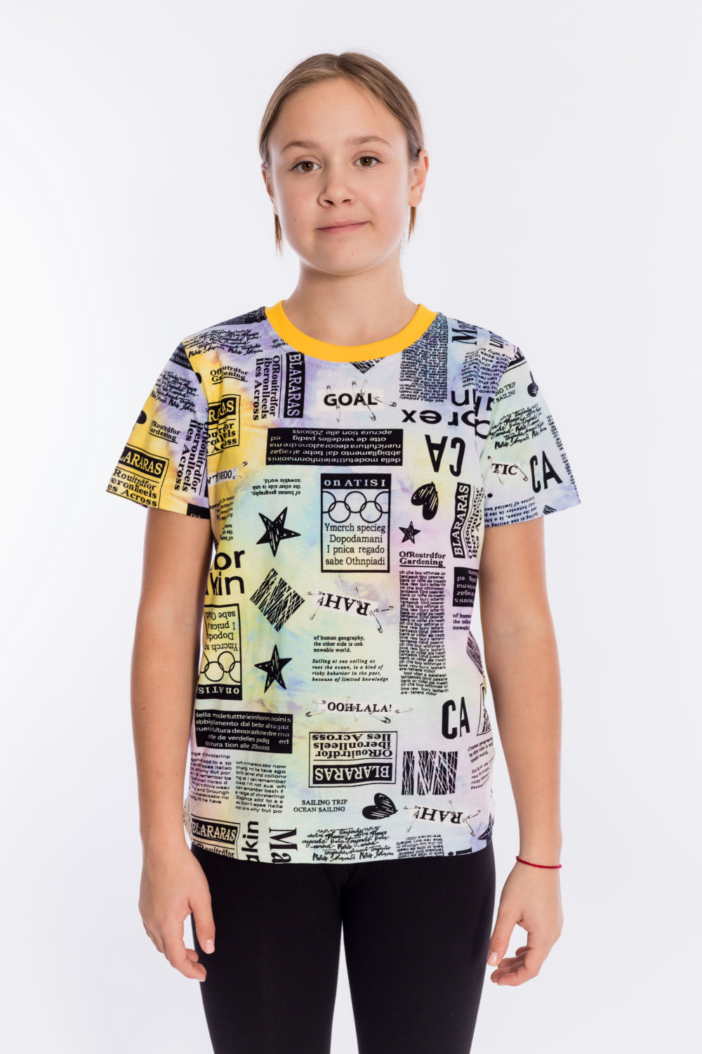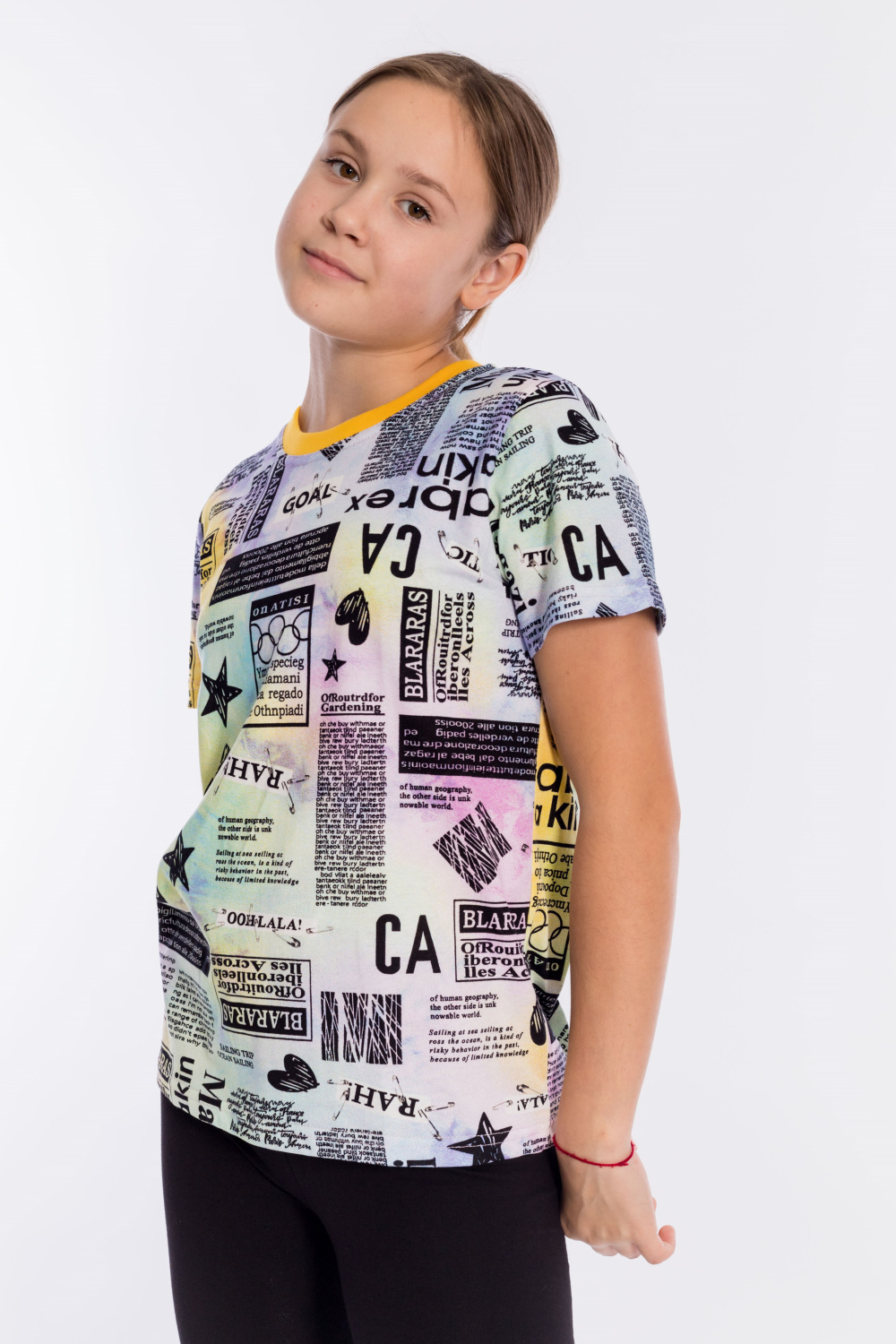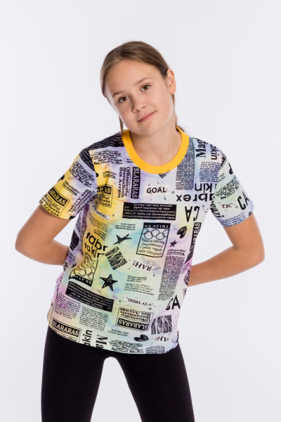 Футболка выполнена из хлопкового полотна c набивным рисунком, с коротким рукавом и круглым вырезом горловины.