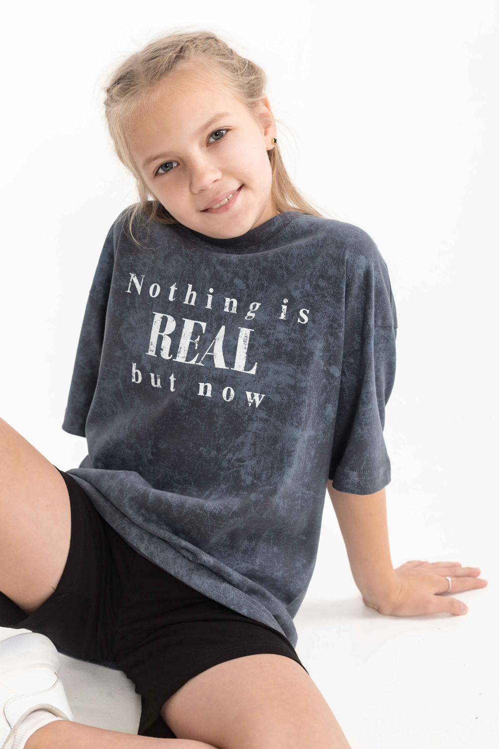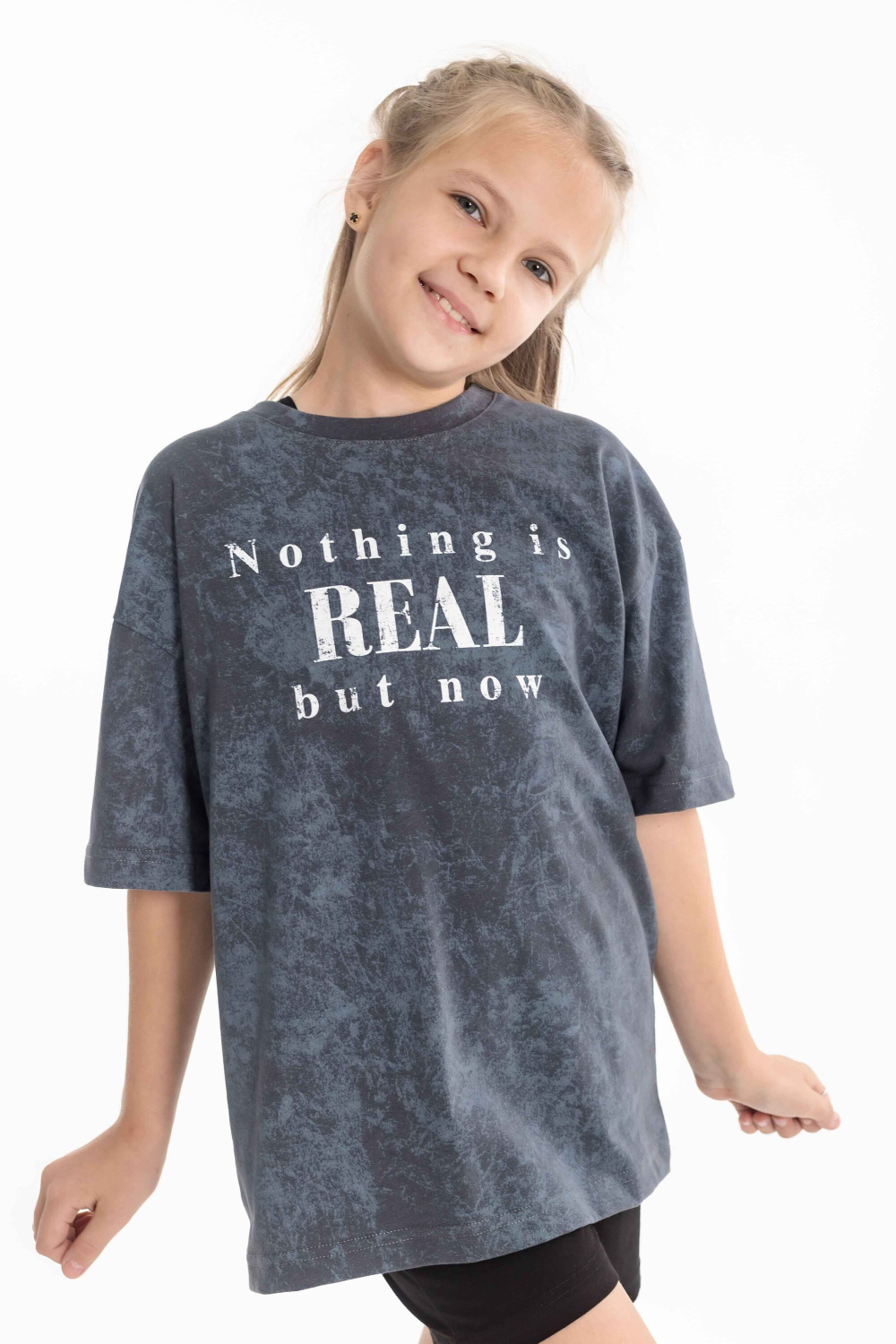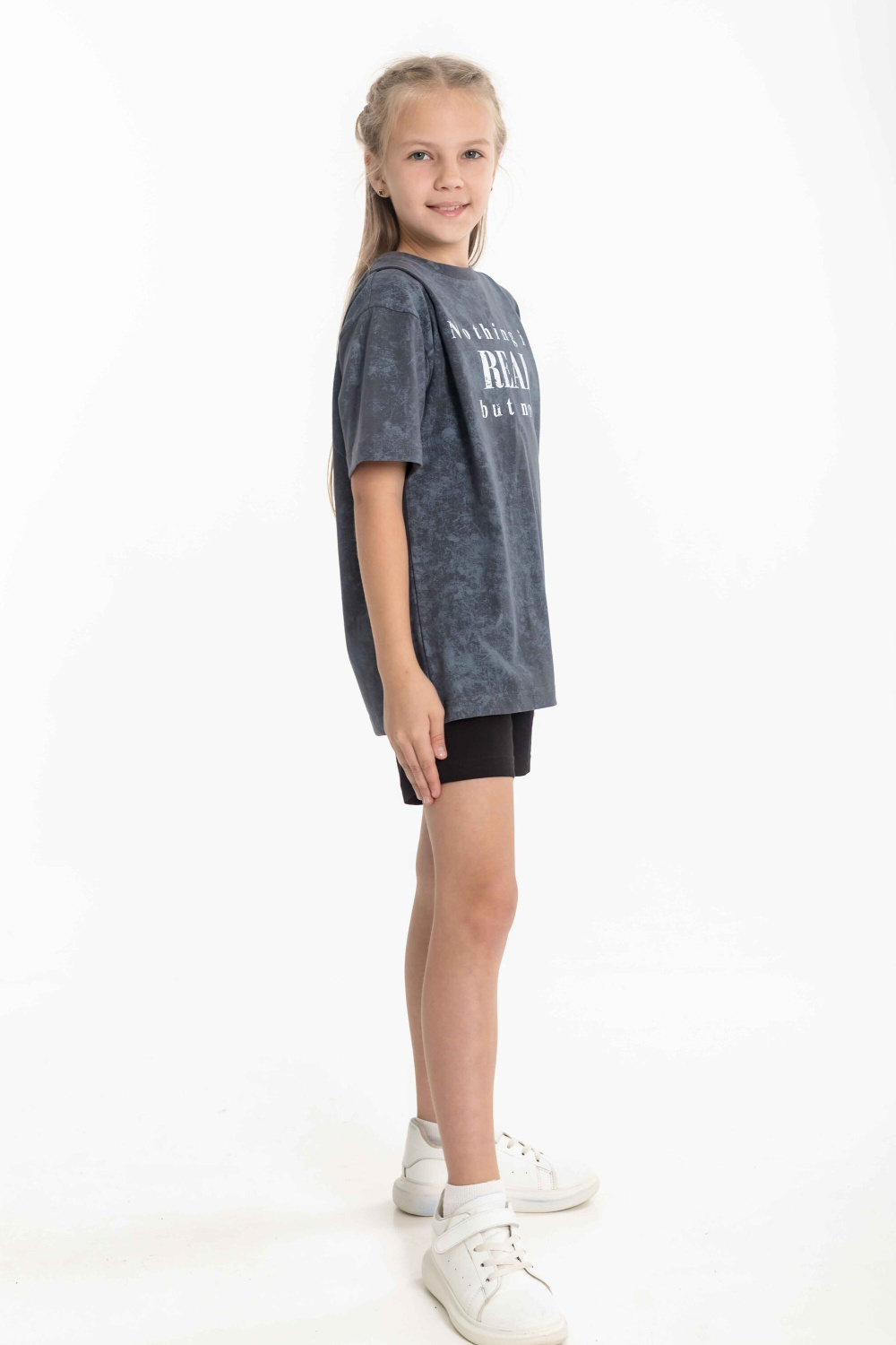Футболка свободного кроя с круглым вырезом горловины и рукавом до локтя. Футболка выполнена из хлопкового полотна, особенностью модели является спущенная линия плеча и интересный принт спереди.