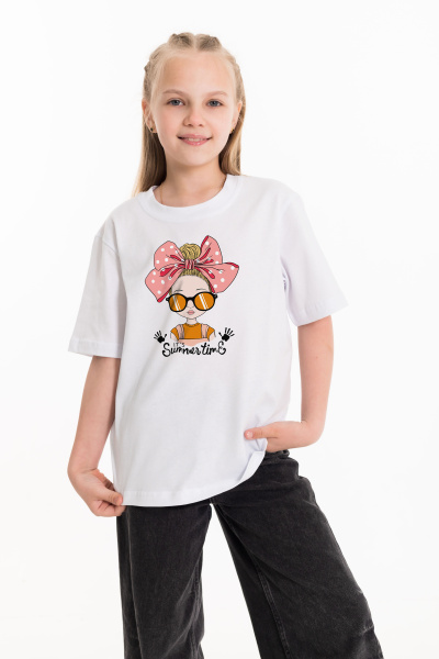 Футболка выполнена из однотонной кулирки, 100% хлопок. С коротким рукавом и круглым вырезом горловины, оформленным планкой. Спереди нанесён принт.