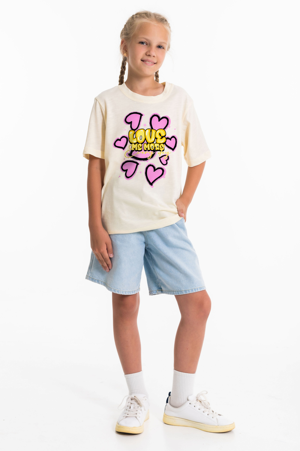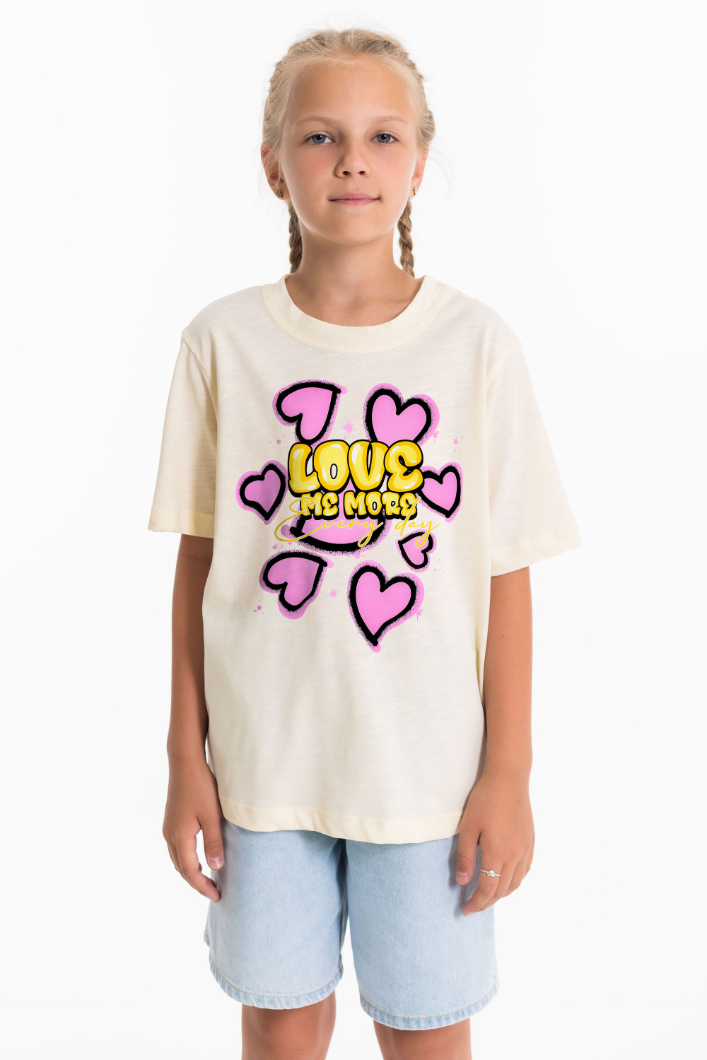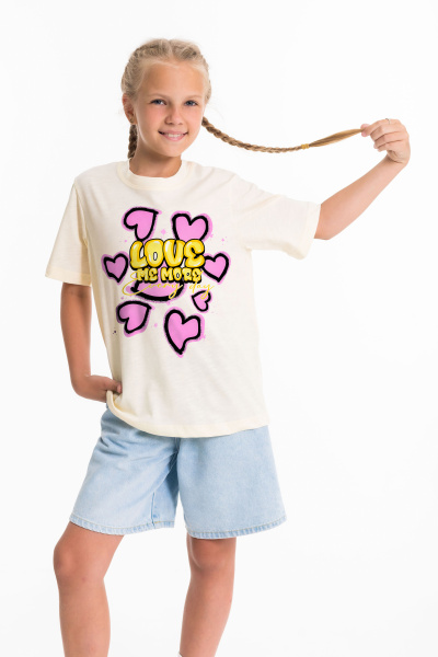 Детская футболка с принтом изготовлена из хлопкового полотна - кулирка "фламли", что обеспечивает комфорт и хорошую воздухопроницаемость. Футболка имеет короткий рукав и круглый вырез горловины, что придает ей классический стильный вид. Такая модель футболки отлично сочетается с джинсами, брюками или юбкой. Изготовленная из натуральной ткани, футболка обеспечит комфорт в течение всего дня.