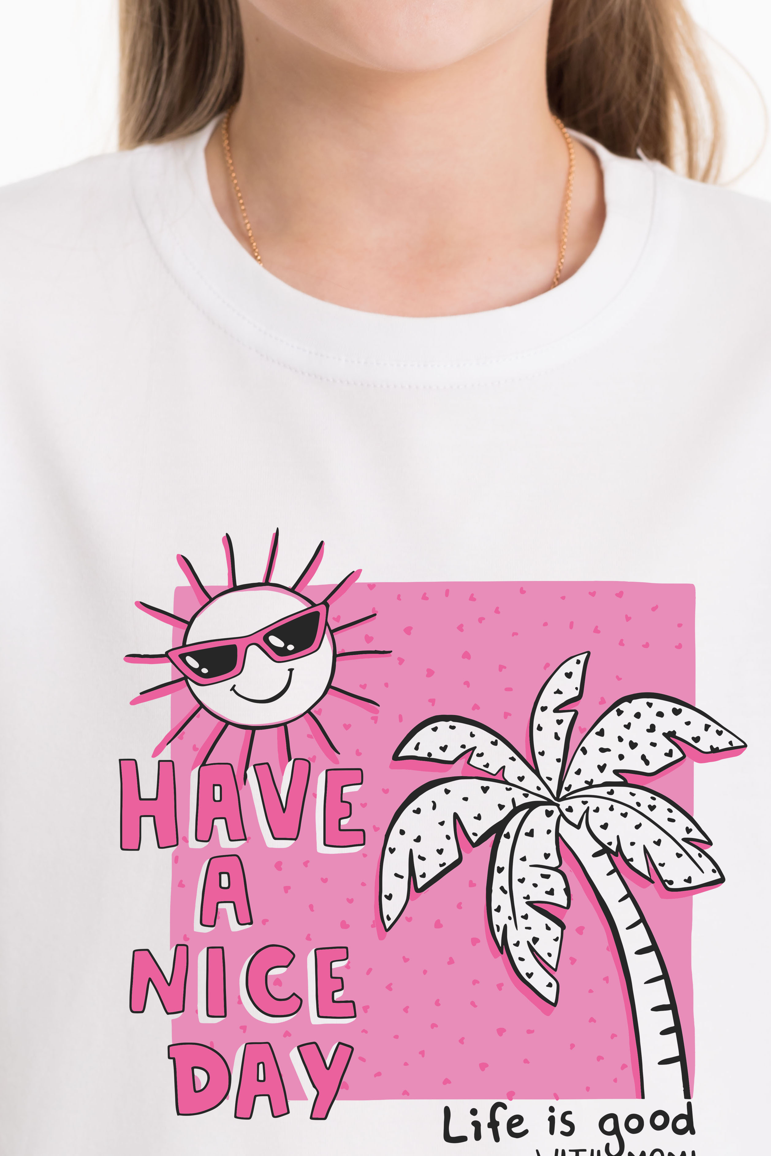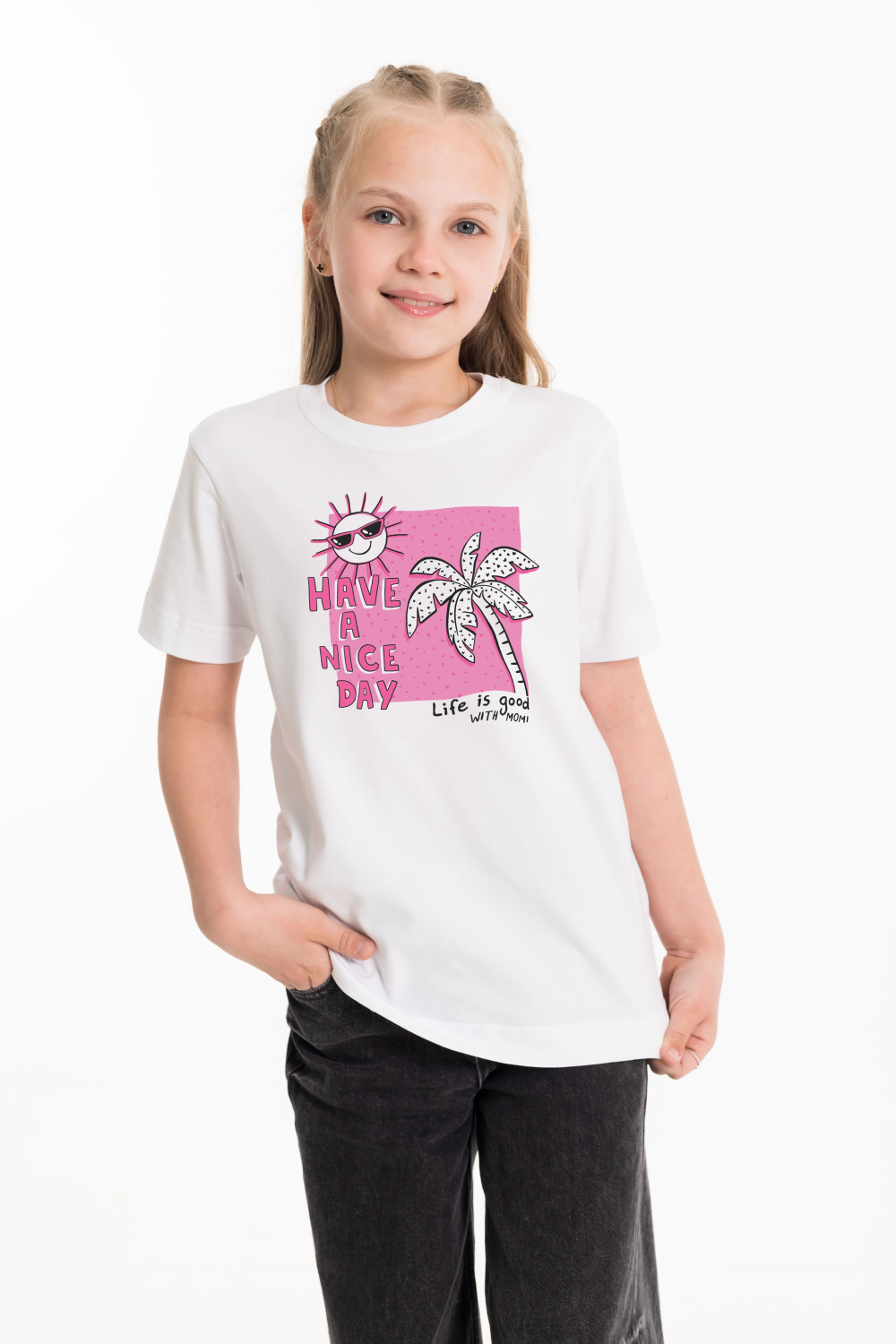 Круглый вырез горловины, втачной рукав, на полочке принт.