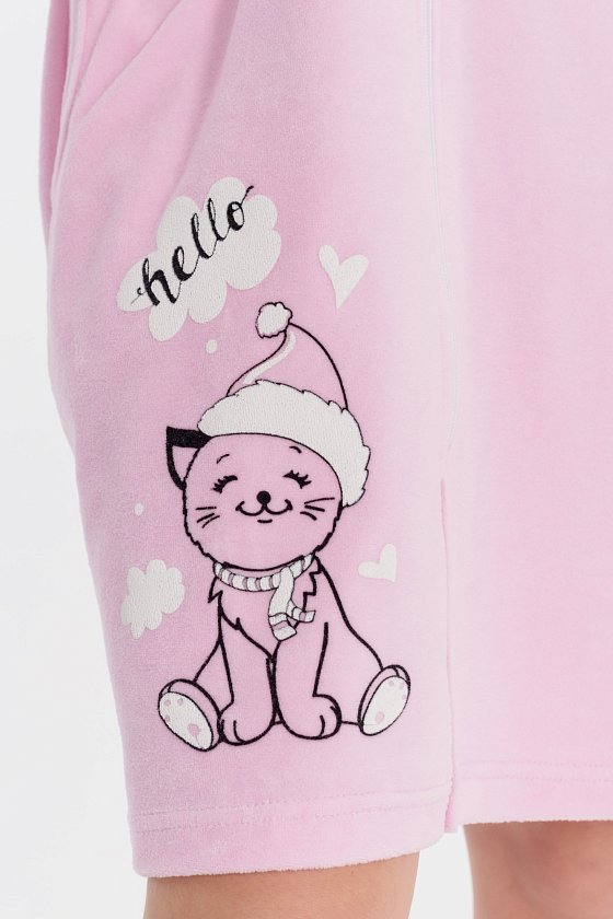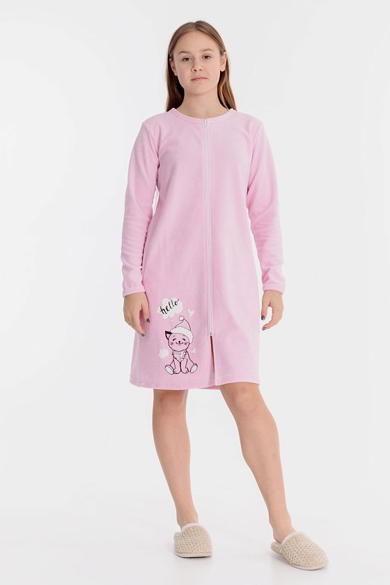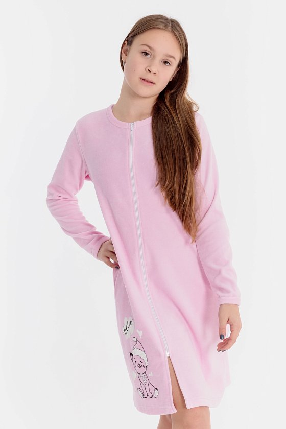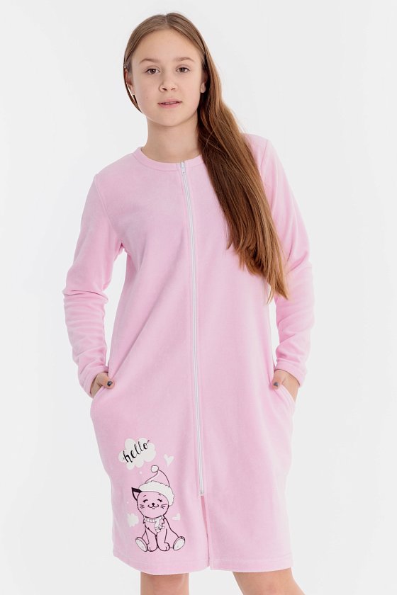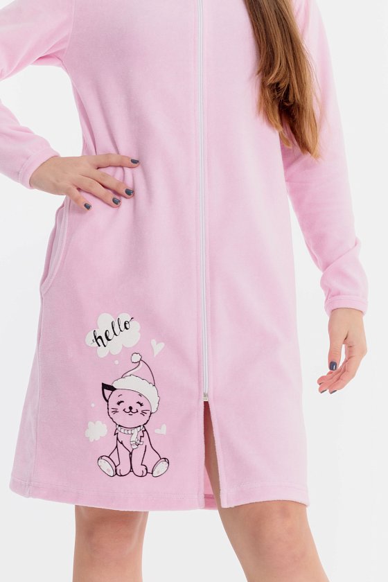 Халат с длинными рукавами выполнен из велюра. Центральная застёжка на молнию, по бокам расположены два кармана. Спереди на халате нанесён принт.