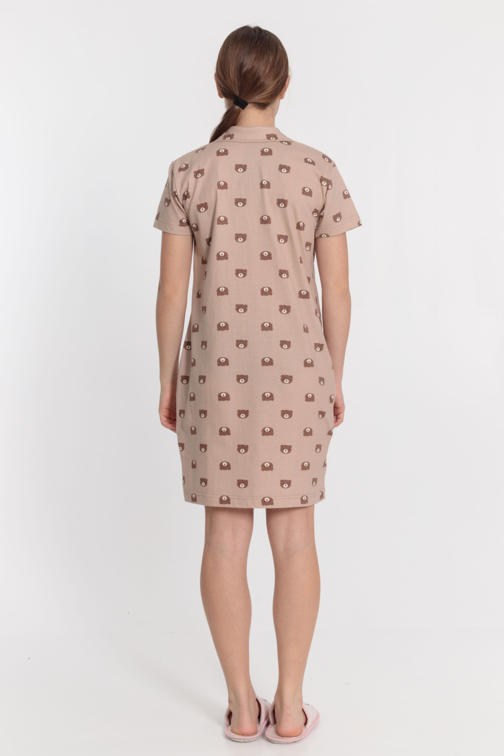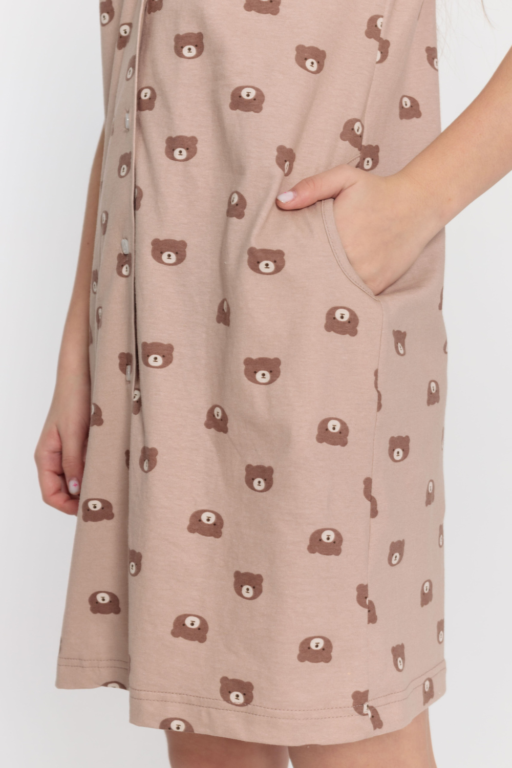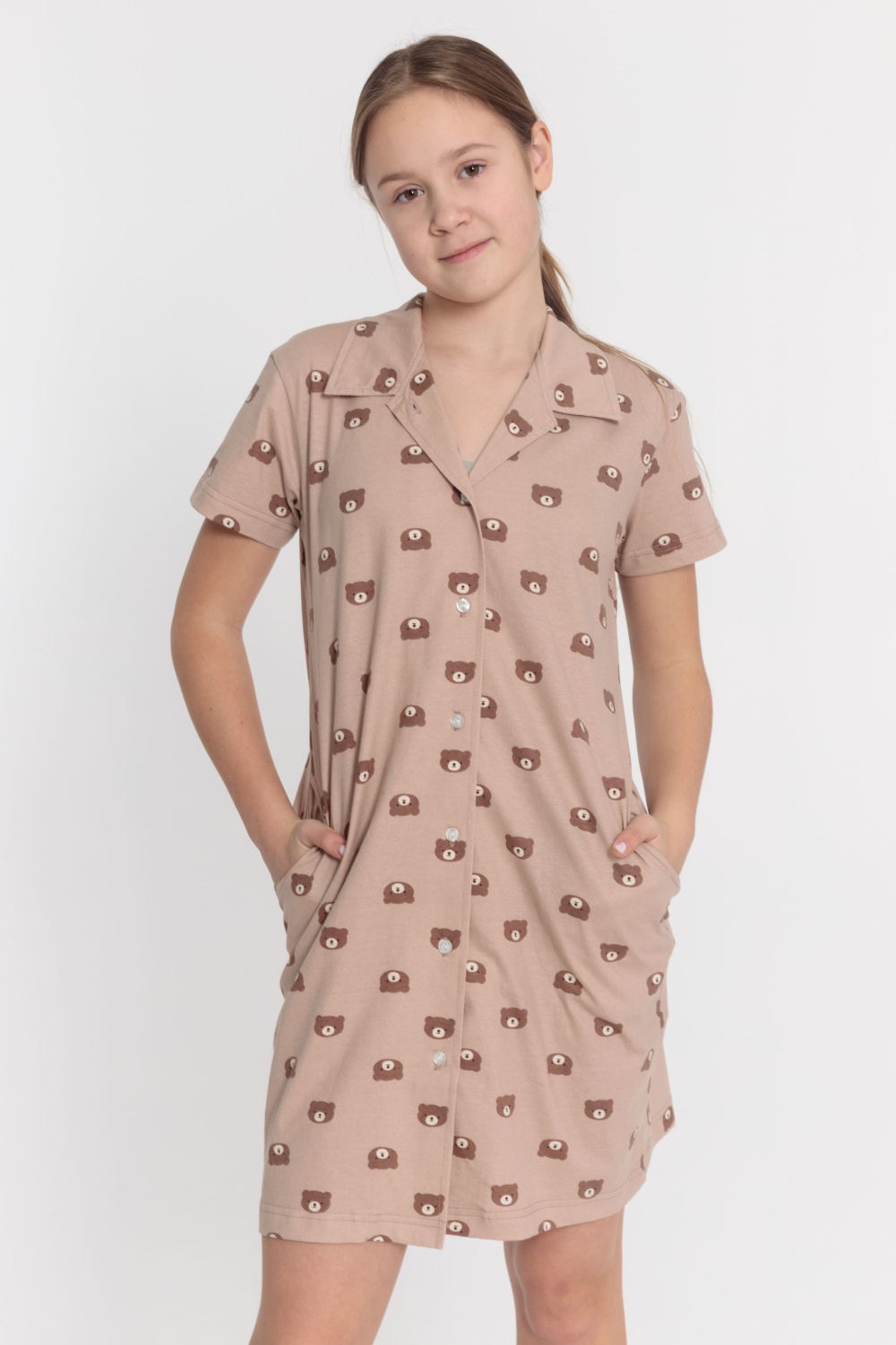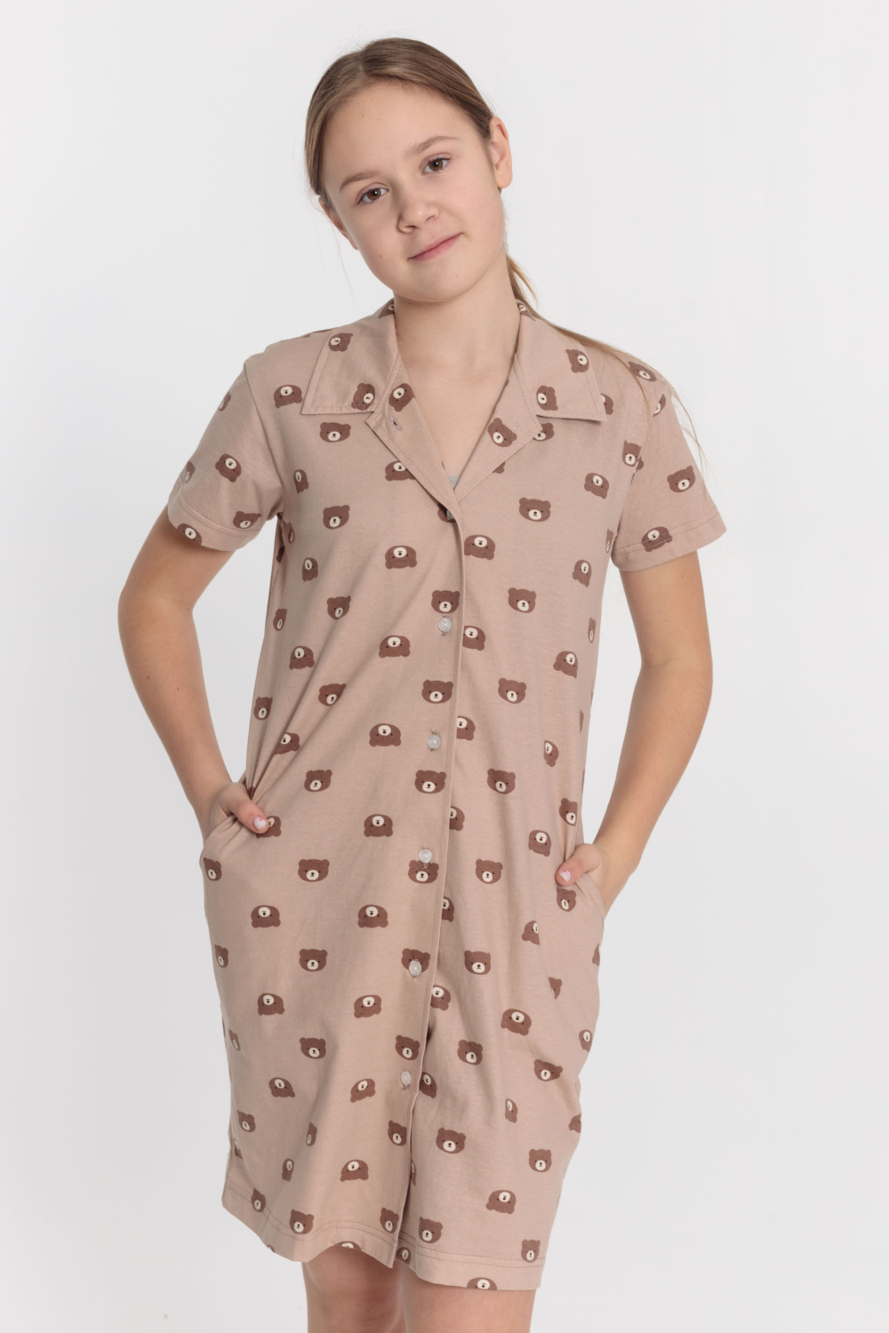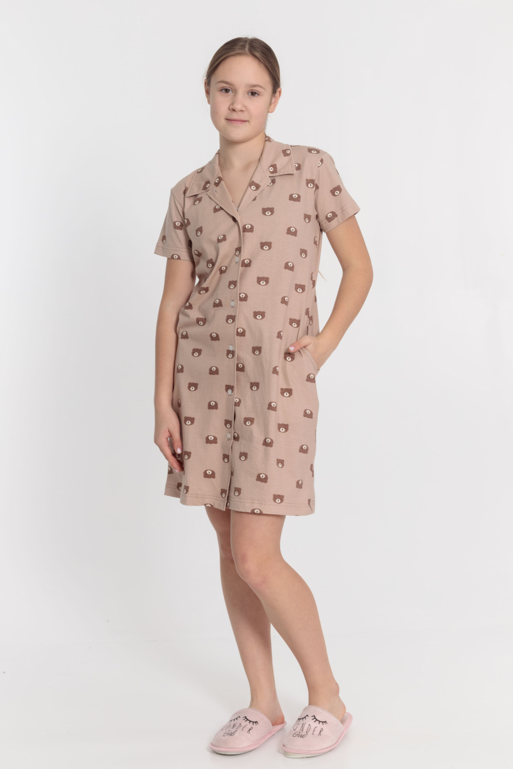 Халат прямого силуэта с застёжкой на пуговицах, отложным воротником и короткими рукавами. По бокам расположены два кармана. Халат выполнен из кулирки.