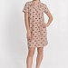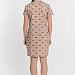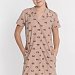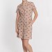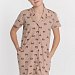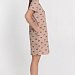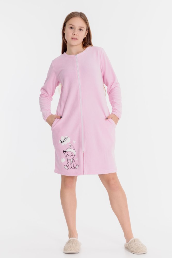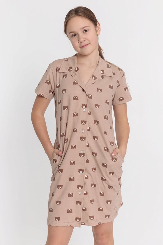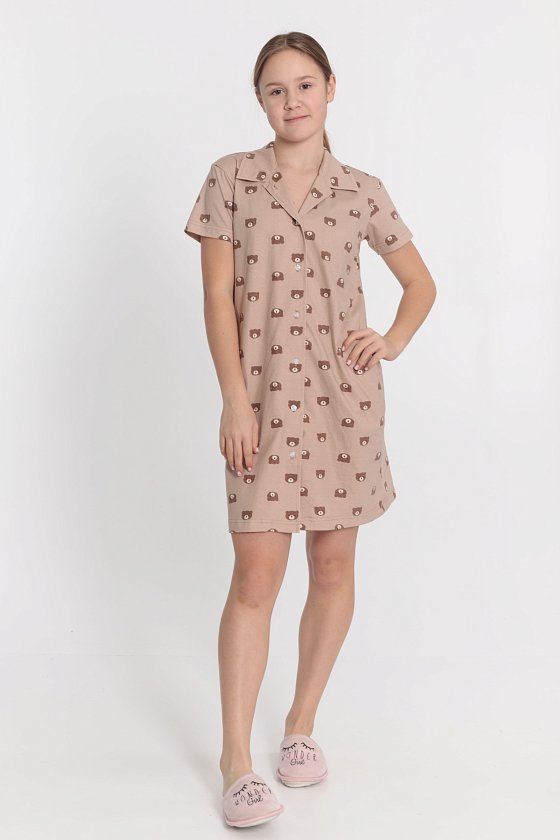 Халат прямого силуэта с застёжкой на пуговицах, отложным воротником и короткими рукавами. По бокам расположены два кармана. Халат выполнен из кулирки.