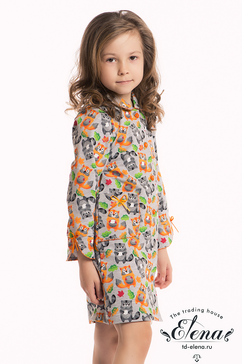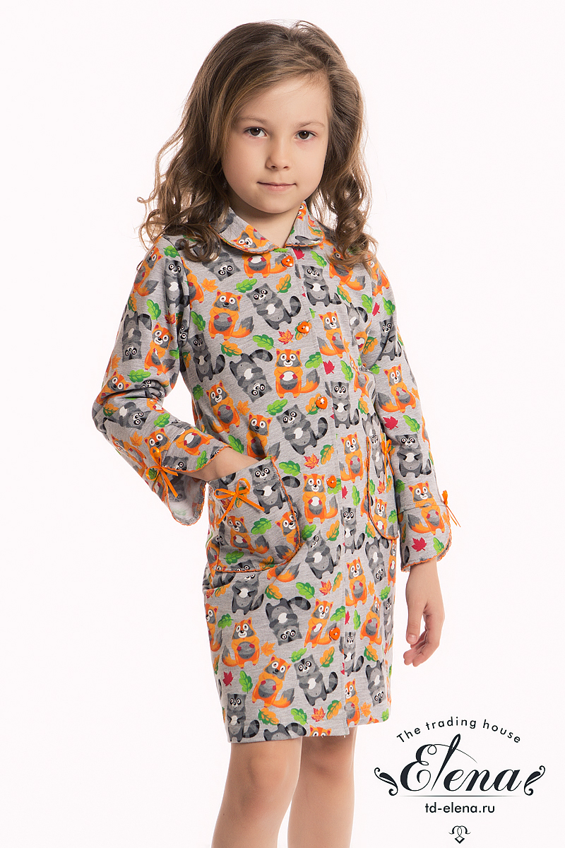 Халат для девочки выполнен из хлопкового полотна с начёсом. Горловина оформлена воротником, центральная застёжка на пуговицы. Рукава и карманы халата украшены бантиками.