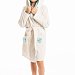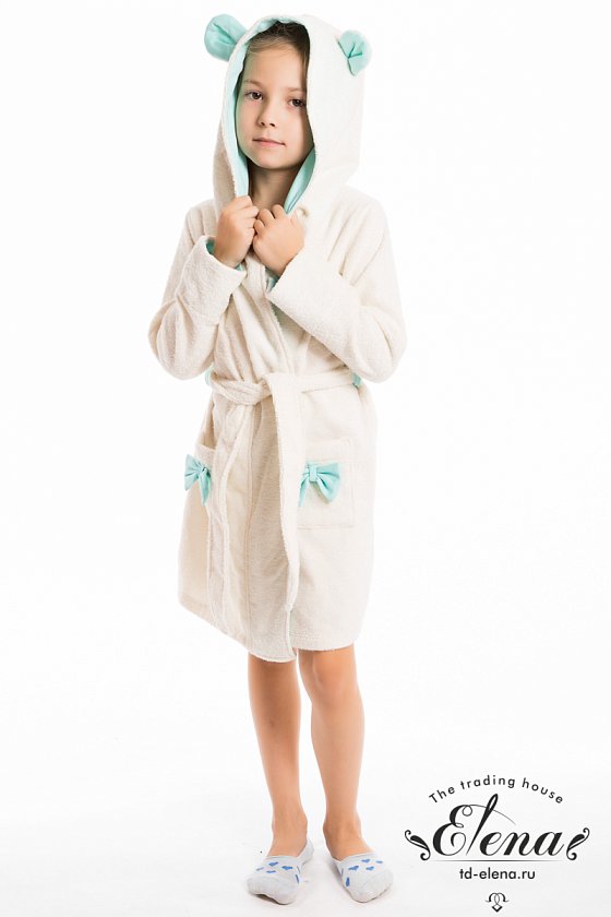 Халат из махрового х/б полотна в сочетании с интерлоком. Халат на запах, с длинным рукавом и поясом. По бокам расположены два накладных кармана, украшенных бантиками. Капюшон декорирован "ушками". В ростке спинки для удобства пришита петелька.