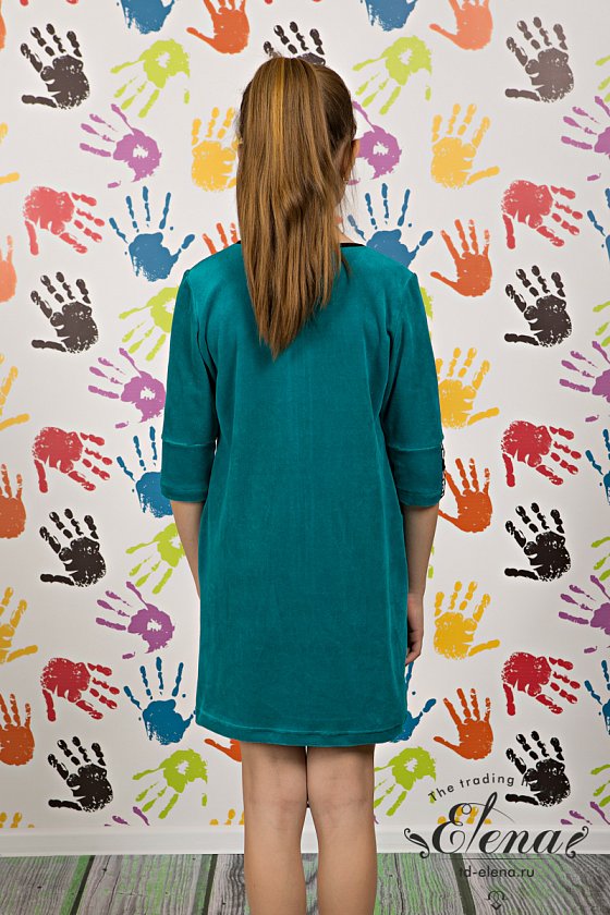 Халат для девочки выполнен из велюра. Центральная застёжка на молнию, рукава длиной 3/4. Спереди расположены два накладных кармана. На рукавах и карманах в качестве отделки настрочена репсовая лента.