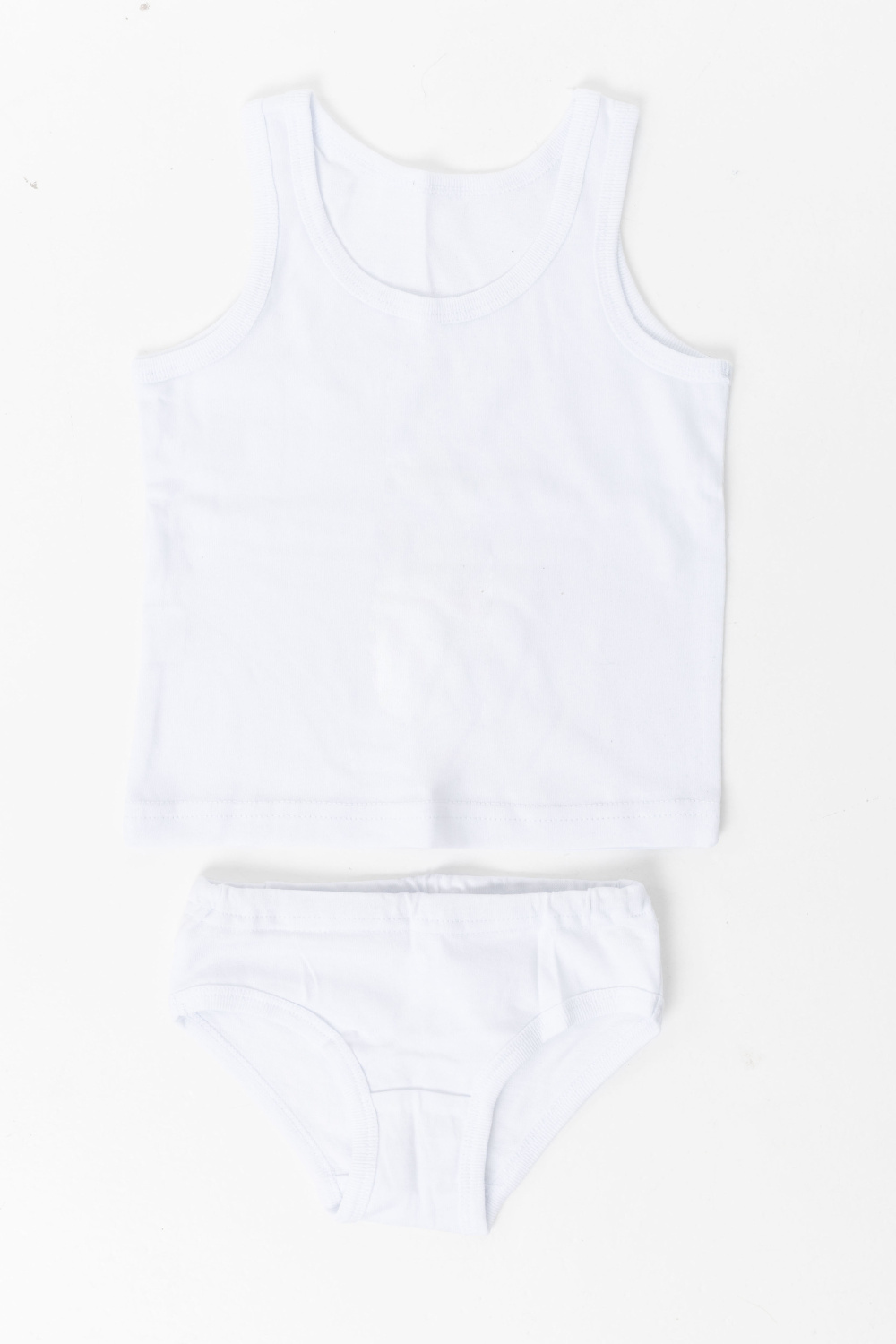 Комплект нижнего белья для девочки выполнен из кулирки, 100% хлопок. Майка с широкими бретелями имеет свободный комфортный крой. Плавки с высокой посадкой и резиной по талии. По горловине, проймам и «ножкам» комплекта обработка бейкой.