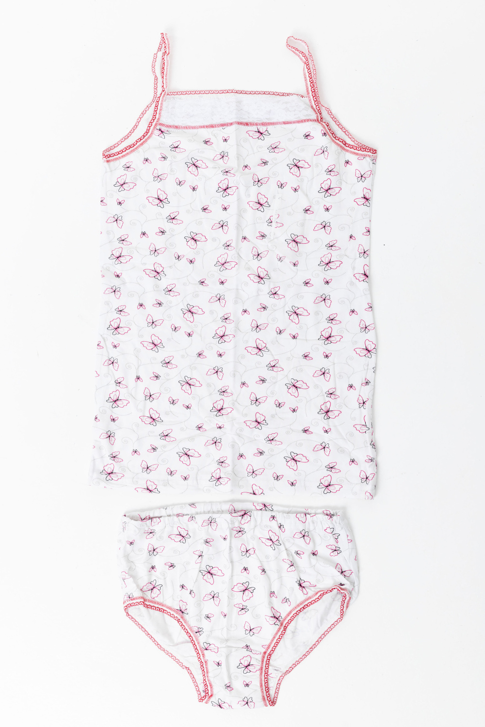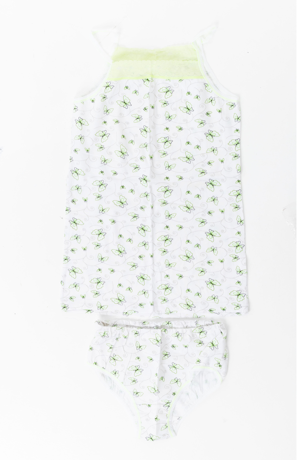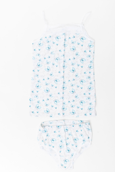Комплект выполнен из хлопкового полотна с добавлением лайкры. Топ на тонких бретелях, с кружевной вставкой. Трусы с отделочной резиной.