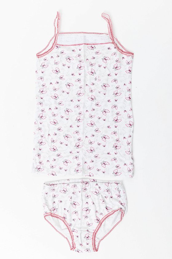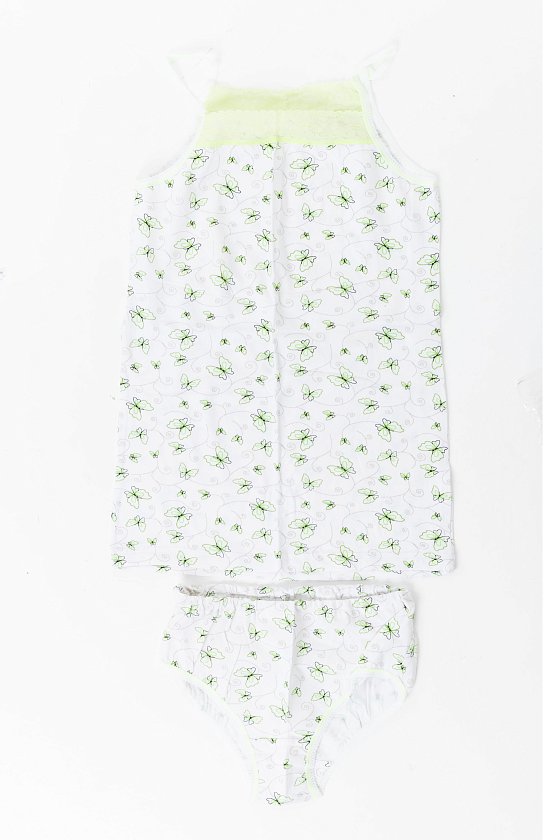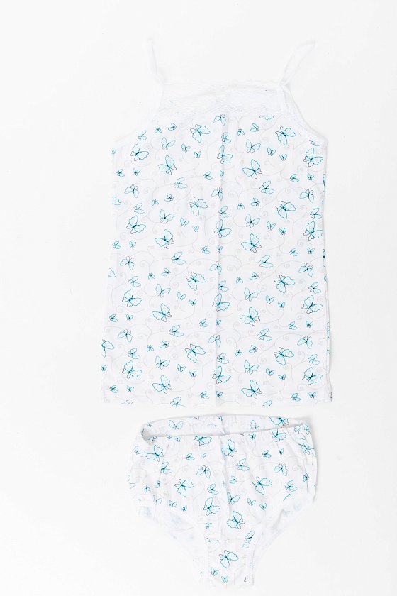 Комплект выполнен из хлопкового полотна с добавлением лайкры. Топ на тонких бретелях, с кружевной вставкой. Трусы с отделочной резиной.
