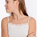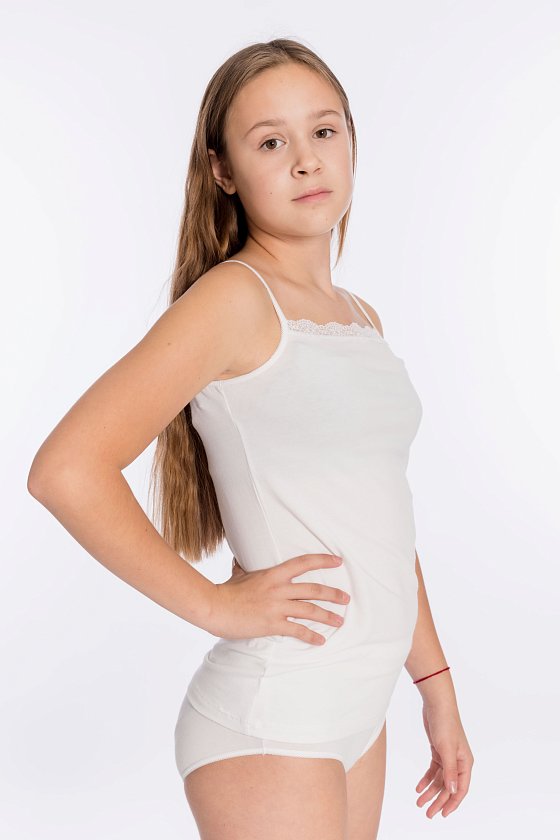 Комплект выполнен из хлопкового полотна с добавлением лайкры. Топ на тонких бретелях, с кружевной вставкой. Трусы с отделочной резиной.