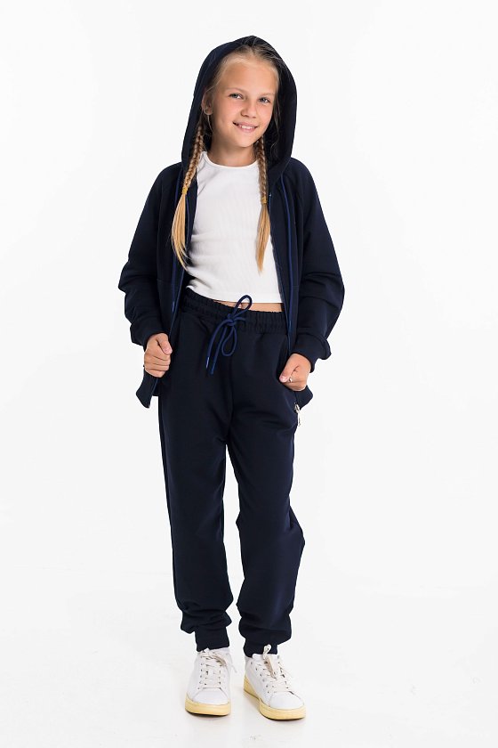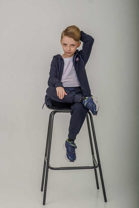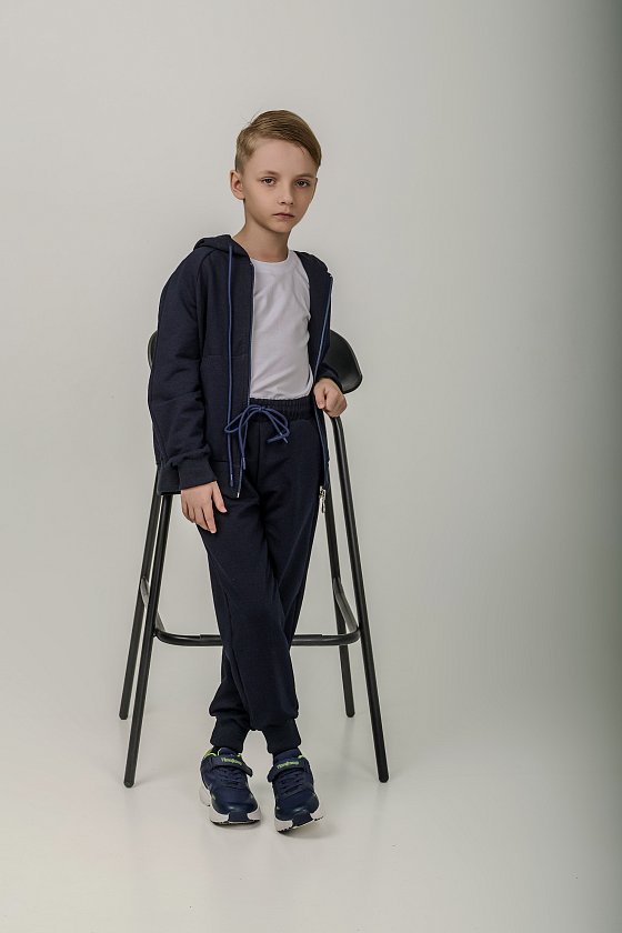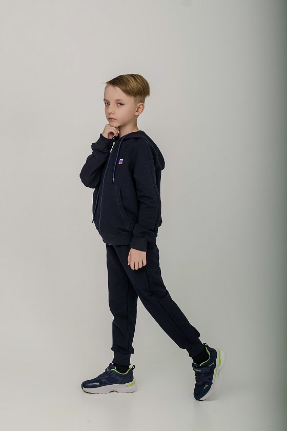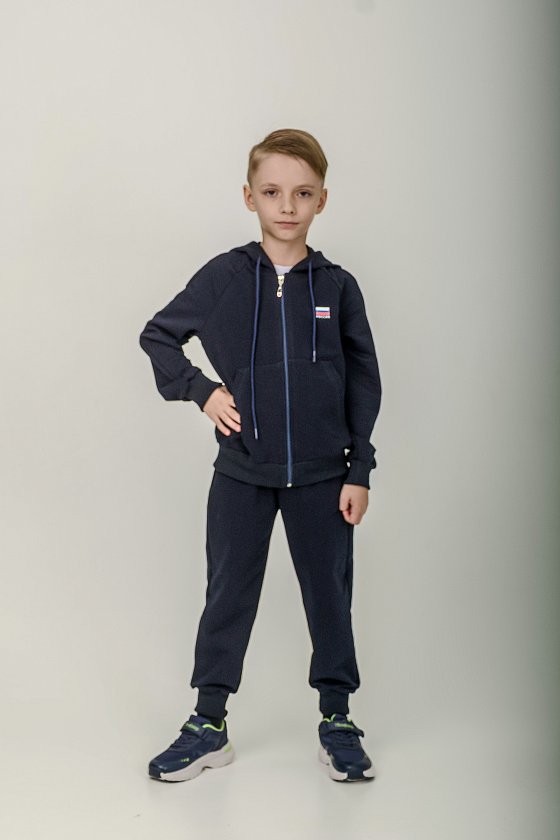Детский костюм из однотонного футера с лайкрой — удобный и практичный вариант для школы и активного отдыха. Комплект состоит из брюк и толстовки. Брюки оснащены боковыми карманами, притачным поясом со шнуром для регулировки и манжетами по низу. Толстовка застегивается на молнию, имеет воротник, капюшон, манжеты и пояс из кашкорсе, а также боковые карманы. С левой стороны расположен принт в виде флага. Костюм отлично подходит для занятий физкультурой в школе, прогулок и повседневной носки.