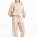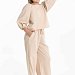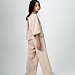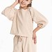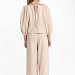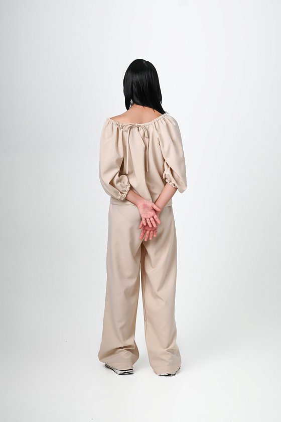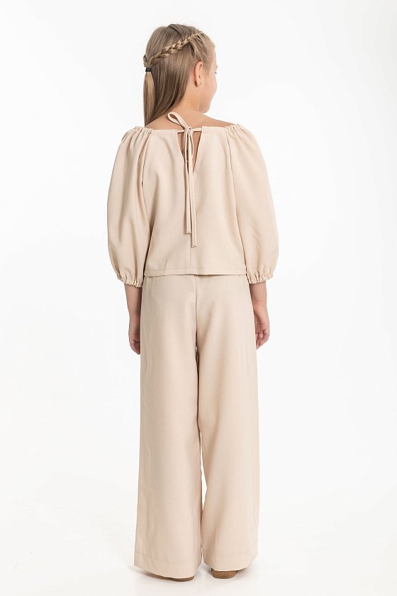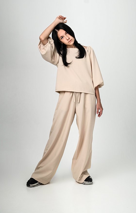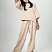 Костюм выполнен из искусственного льна. Стильный комплект состоит из блузки с регулируемыми по длине рукавами на резинке и брюк-палаццо на высокой посадке. Брюки дополнены боковыми карманами и эластичным поясом со шнуром для удобной посадки. Идеальный ансамбль для создания модного и комфортного образа.