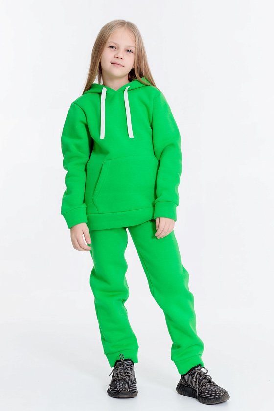 Костюм выполнен из однотонного полотна с начёсом, состоит из брюк и толстовки. Толстовка с карманом-кенгуру, ширина капюшона регулируется при помощи шнура, длинные рукава заканчиваются манжетами. Брюки с поясом на резине, низ на манжетах.