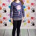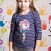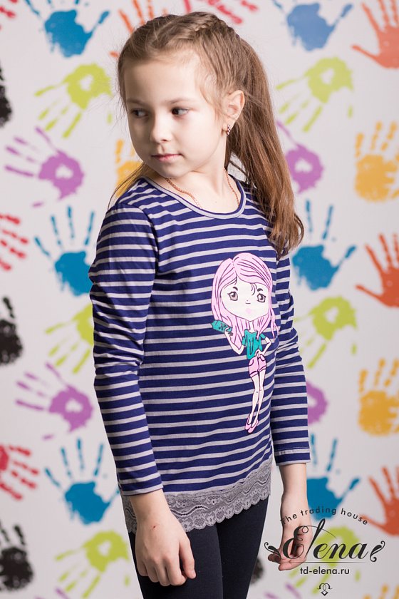 Лонгслив с принтом спереди выполнен из хлопкового полотна. С длинным втачным рукавом, с круглой горловиной, обработанной бейкой. На спинке вырез "капелька" с застежкой пуговицу. По низу оборка из кружева.