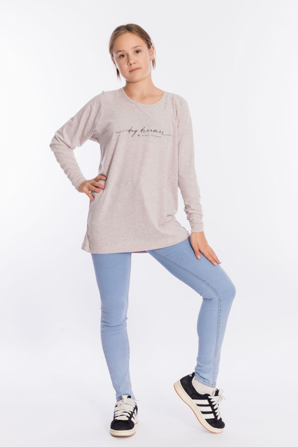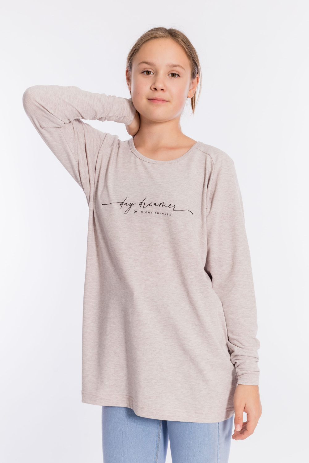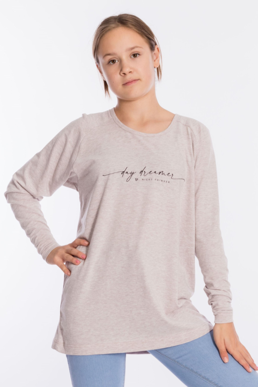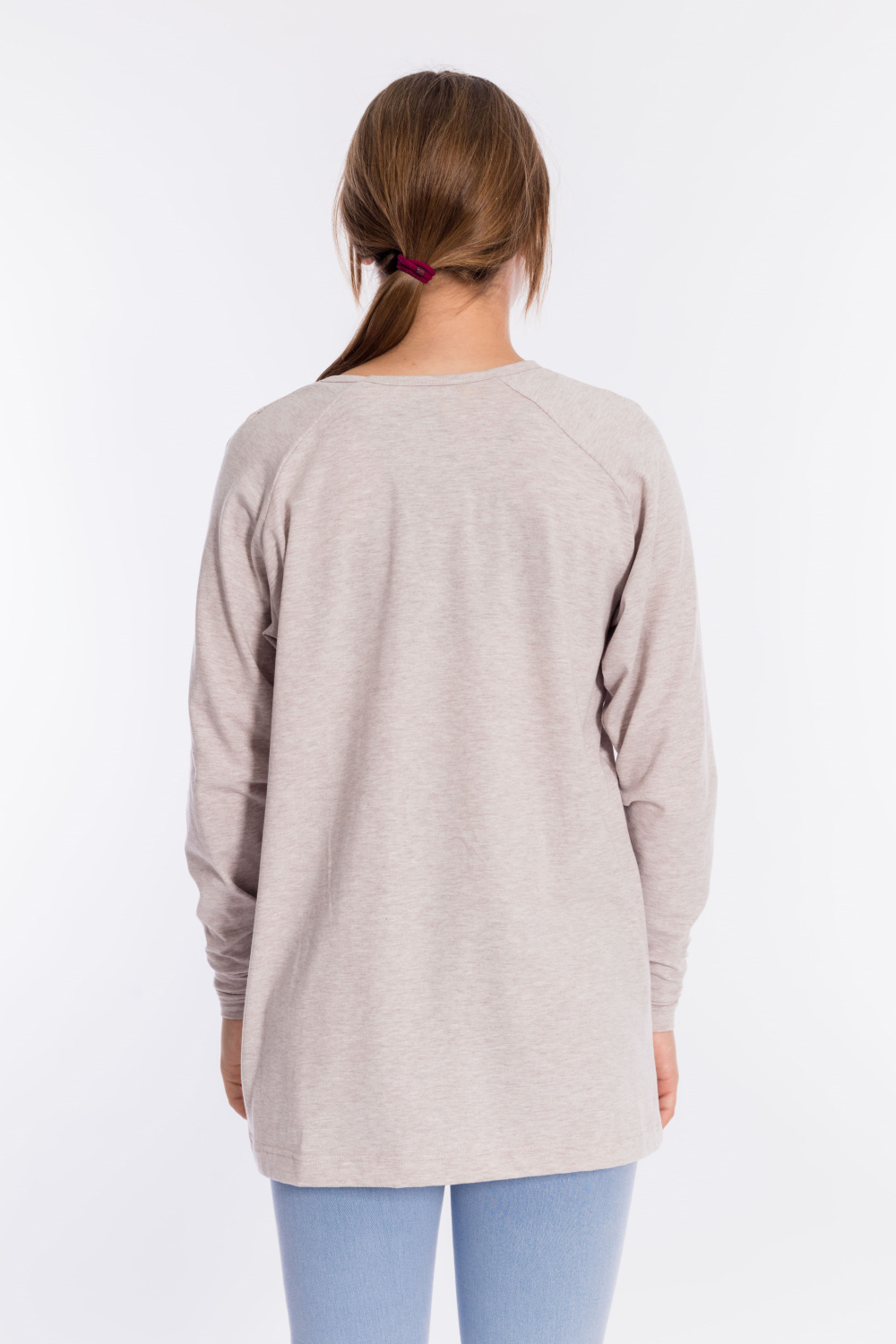 Толстовка выполнена из кулирки с лайкрой. Вырез горловины круглый, длинные рукава покроя реглан, спереди нанесён принт. Низ изделия разноуровневый, сзади длиннее, чем спереди.