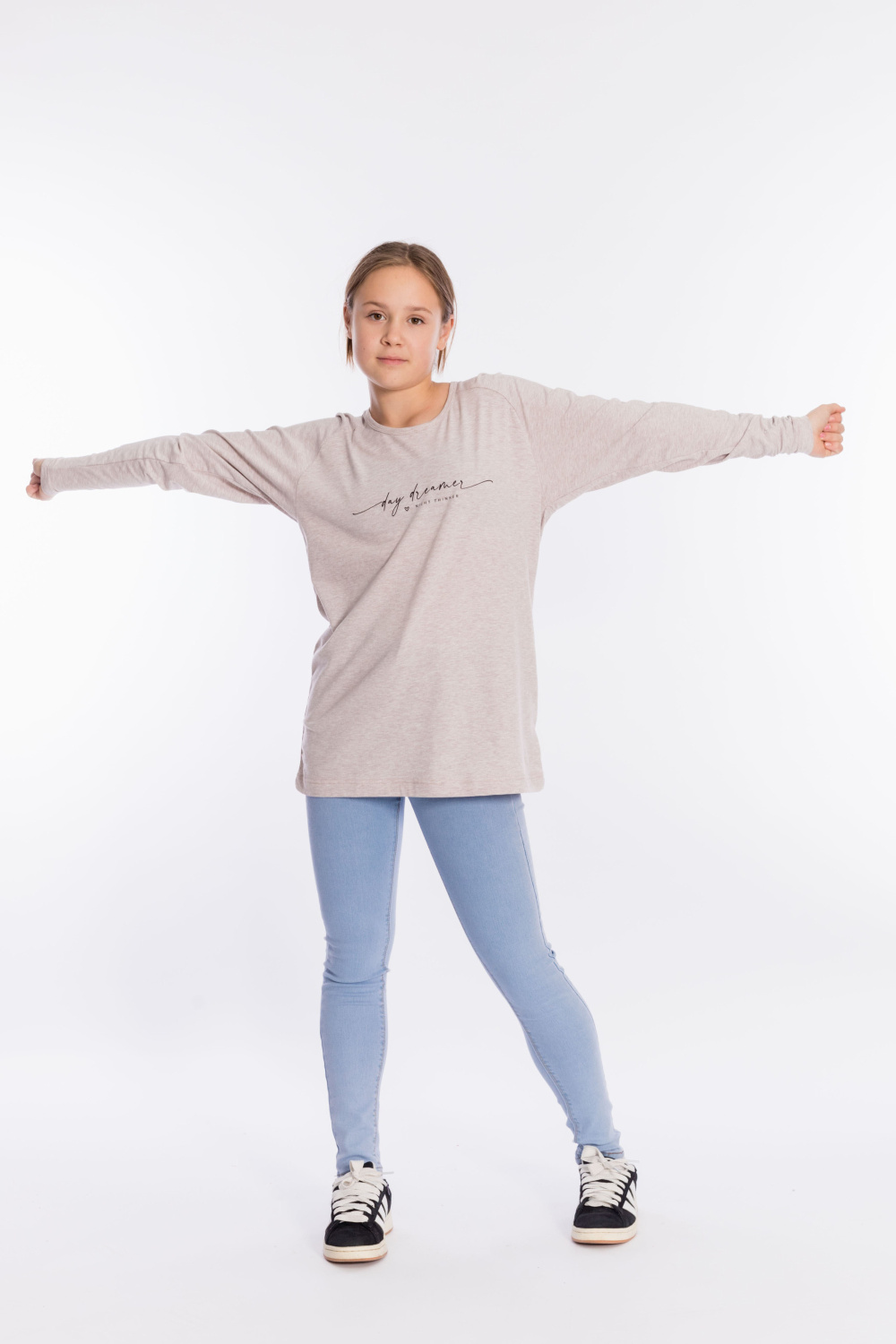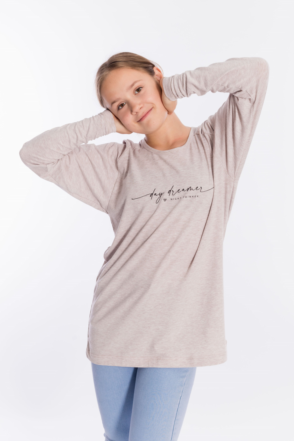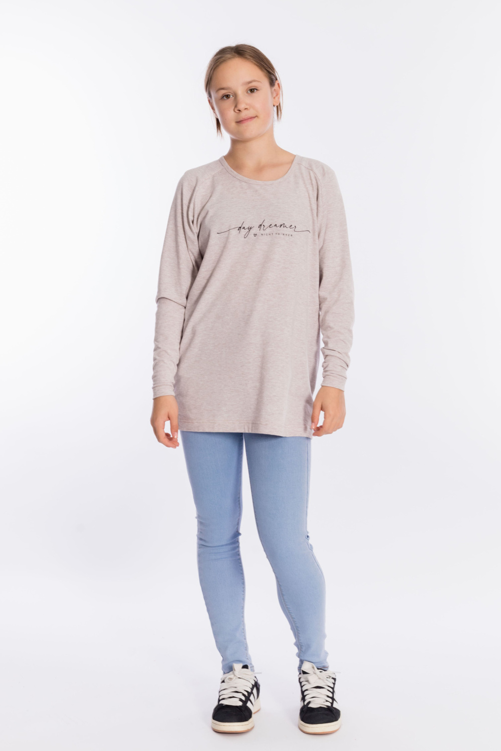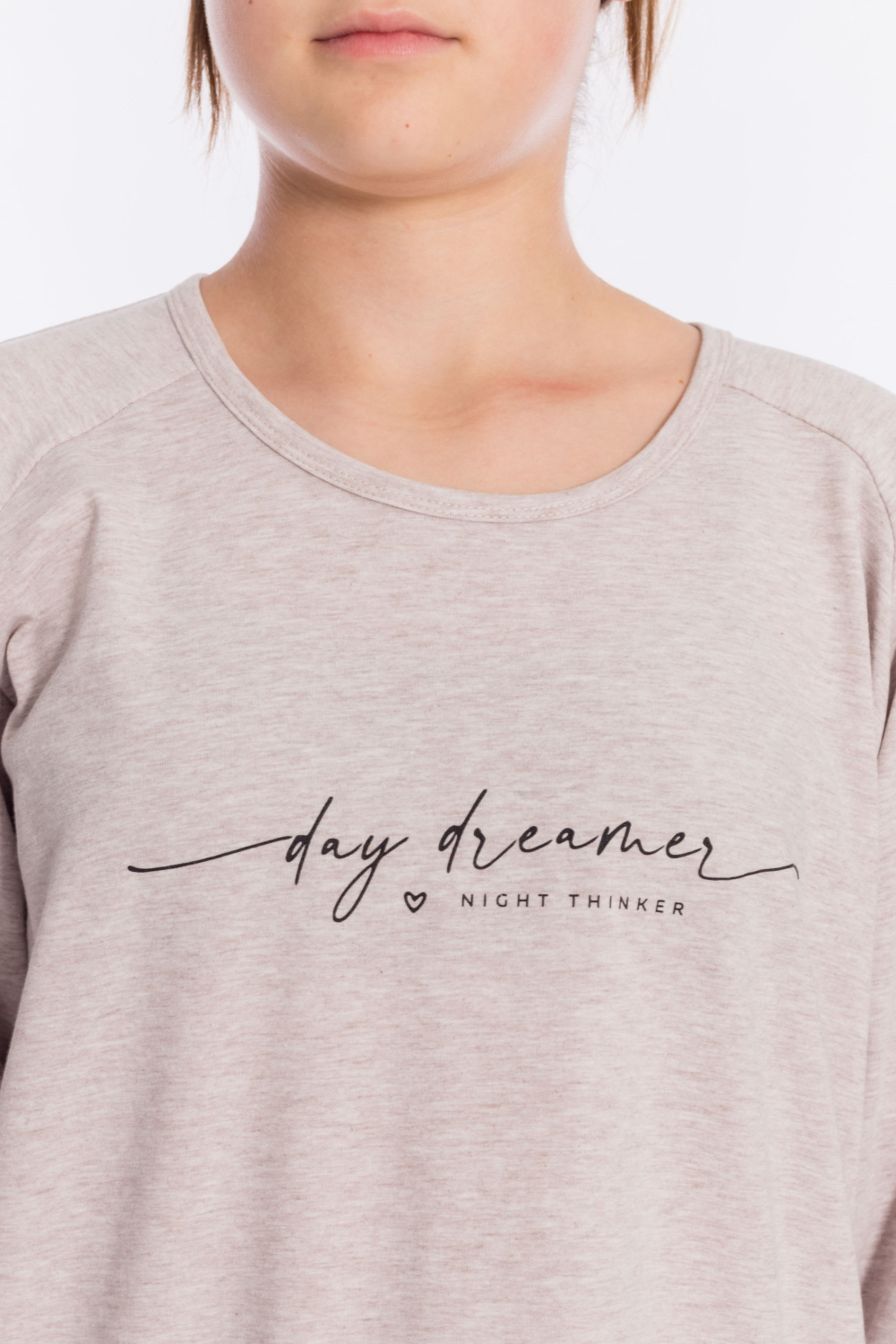 Толстовка выполнена из кулирки с лайкрой. Вырез горловины круглый, длинные рукава покроя реглан, спереди нанесён принт. Низ изделия разноуровневый, сзади длиннее, чем спереди.