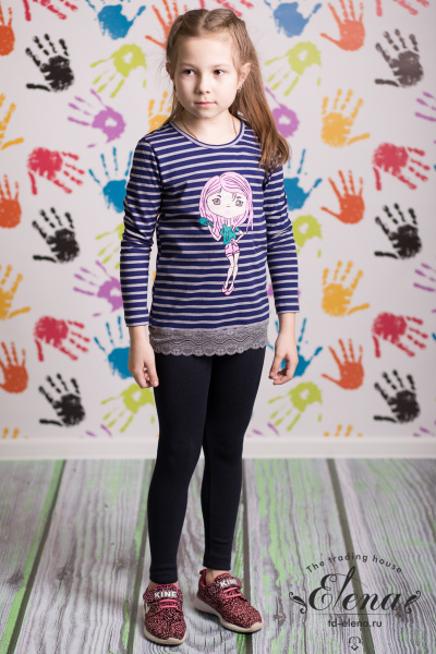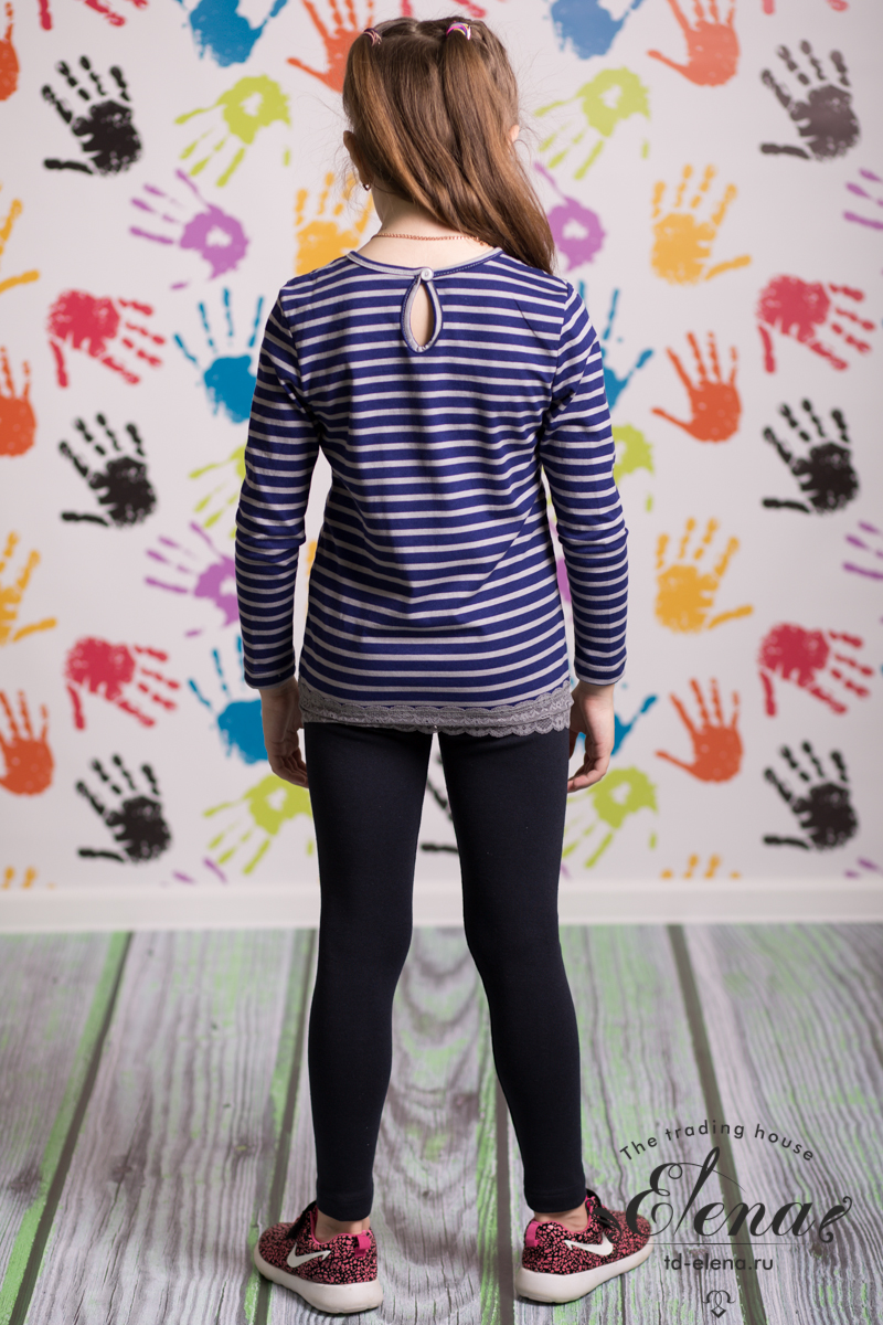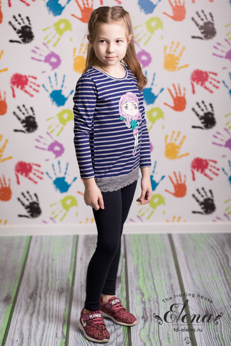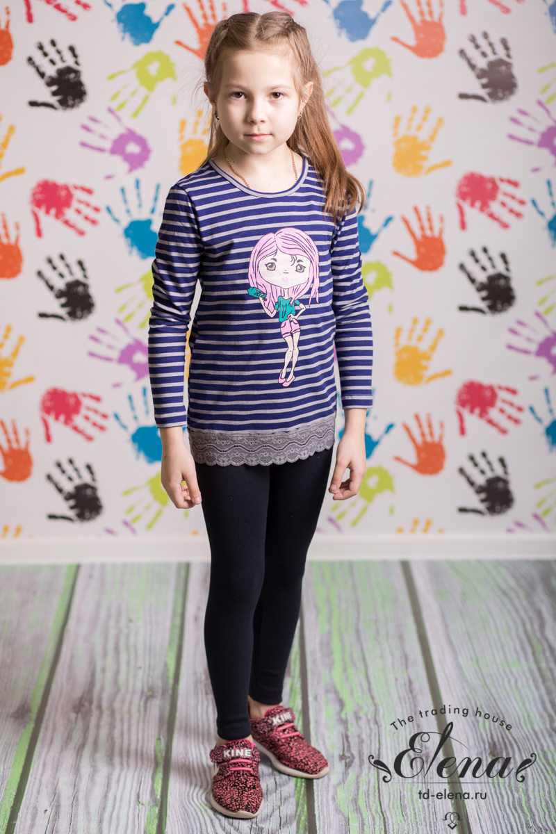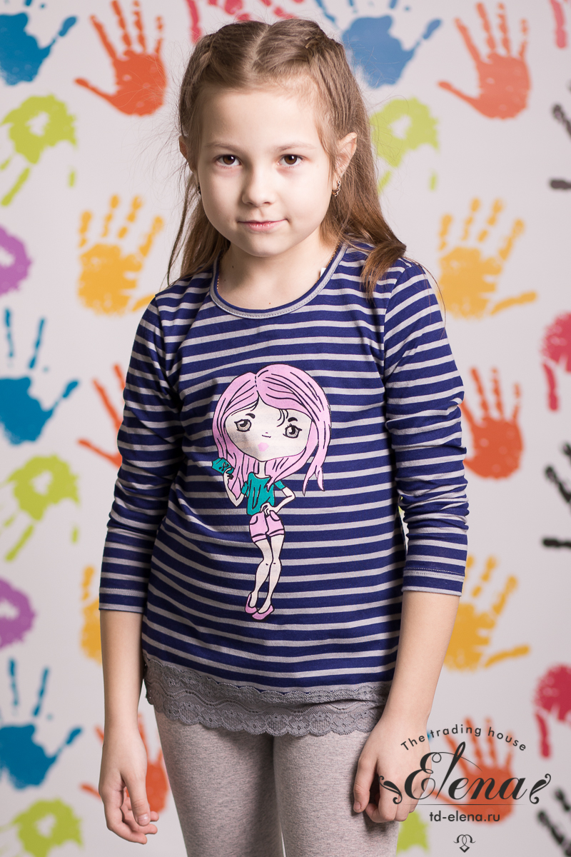 Лонгслив с принтом спереди выполнен из хлопкового полотна. С длинным втачным рукавом, с круглой горловиной, обработанной бейкой. На спинке вырез "капелька" с застежкой пуговицу. По низу оборка из кружева.