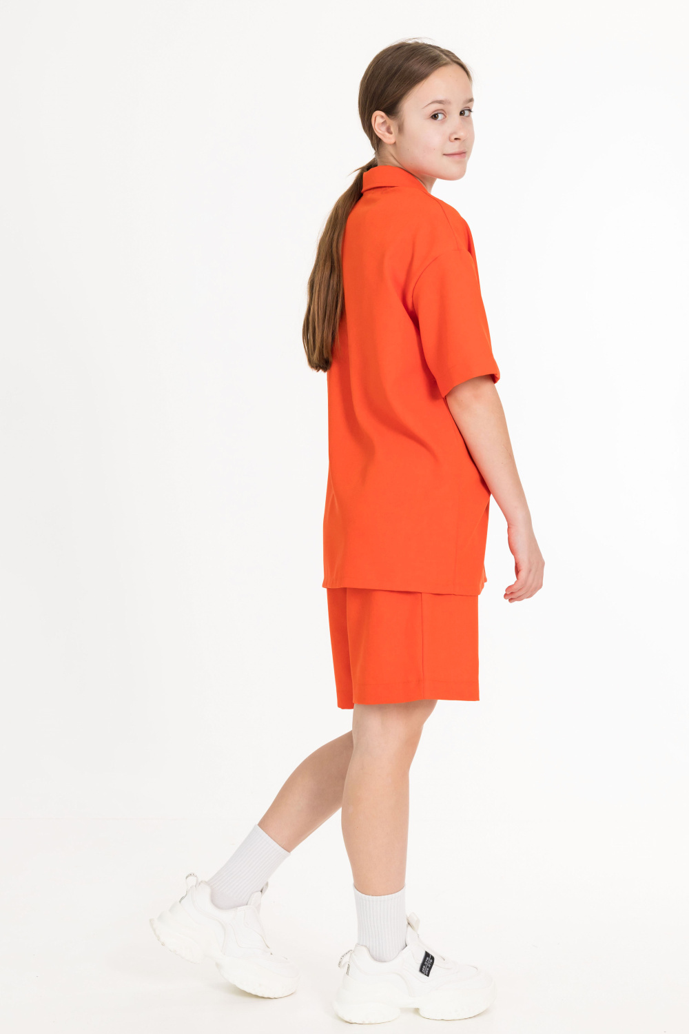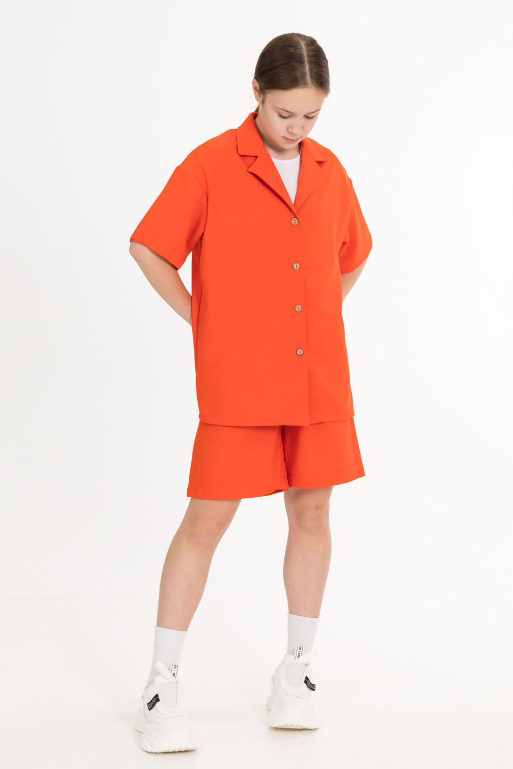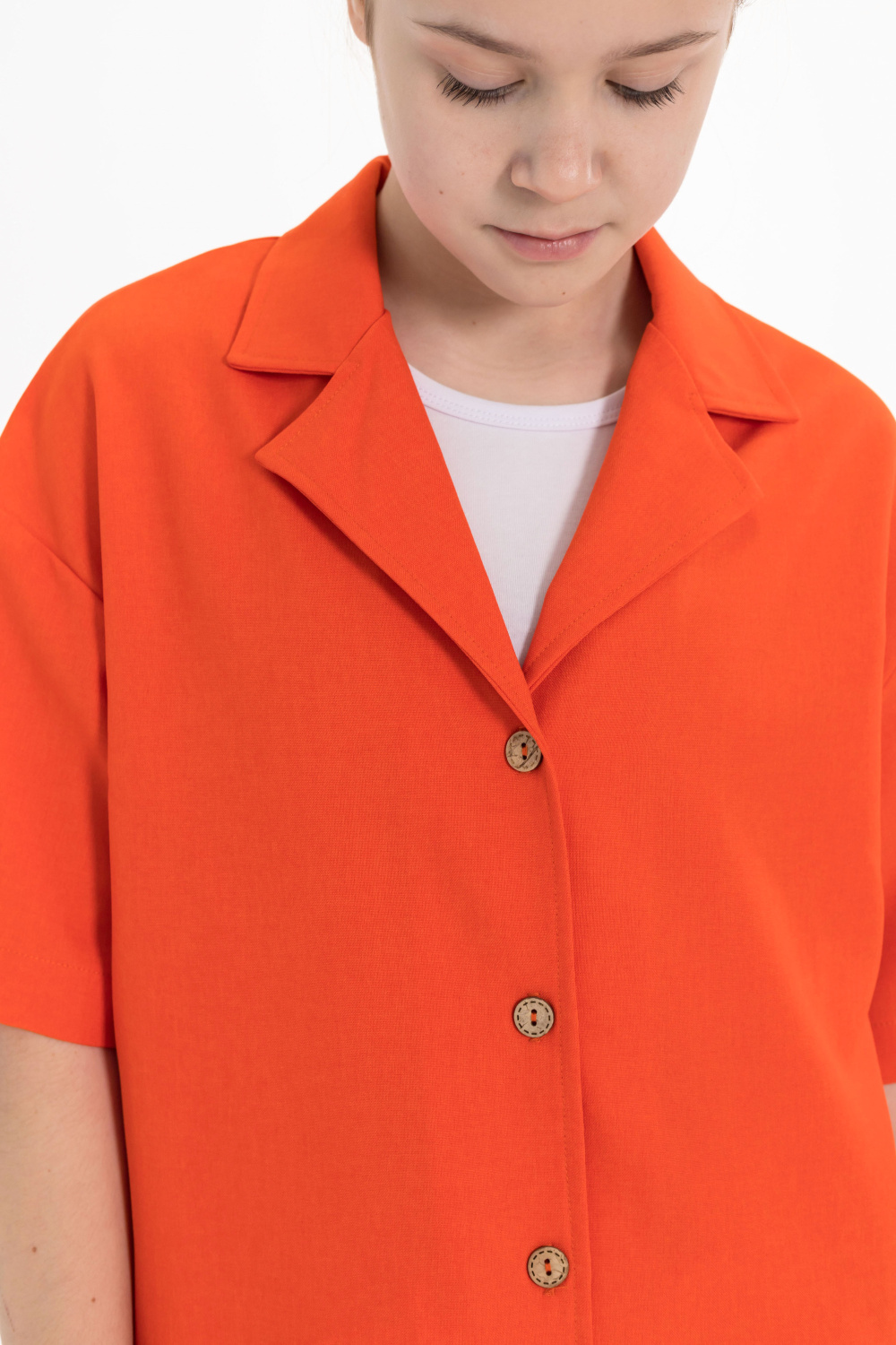Рубашка — стильный и практичный элемент гардероба. Она изготовлена из практичного однотонного полотна, имитирующего лён. Рубашка имеет короткий рукав, застёгивается на пуговицы и дополнена отложным воротником.
