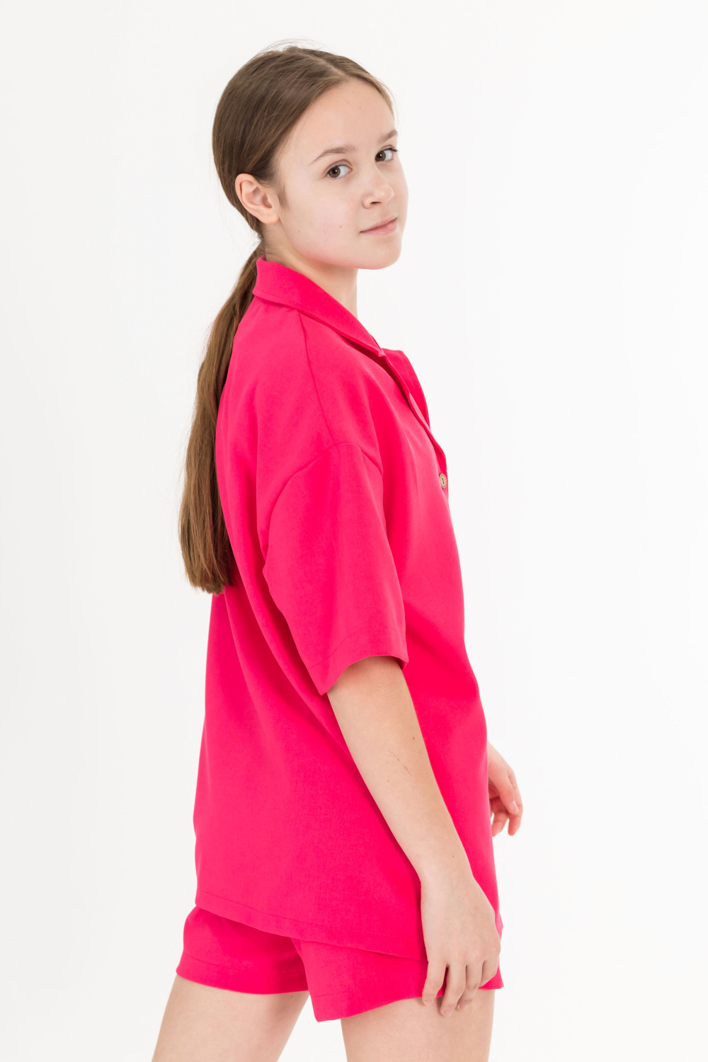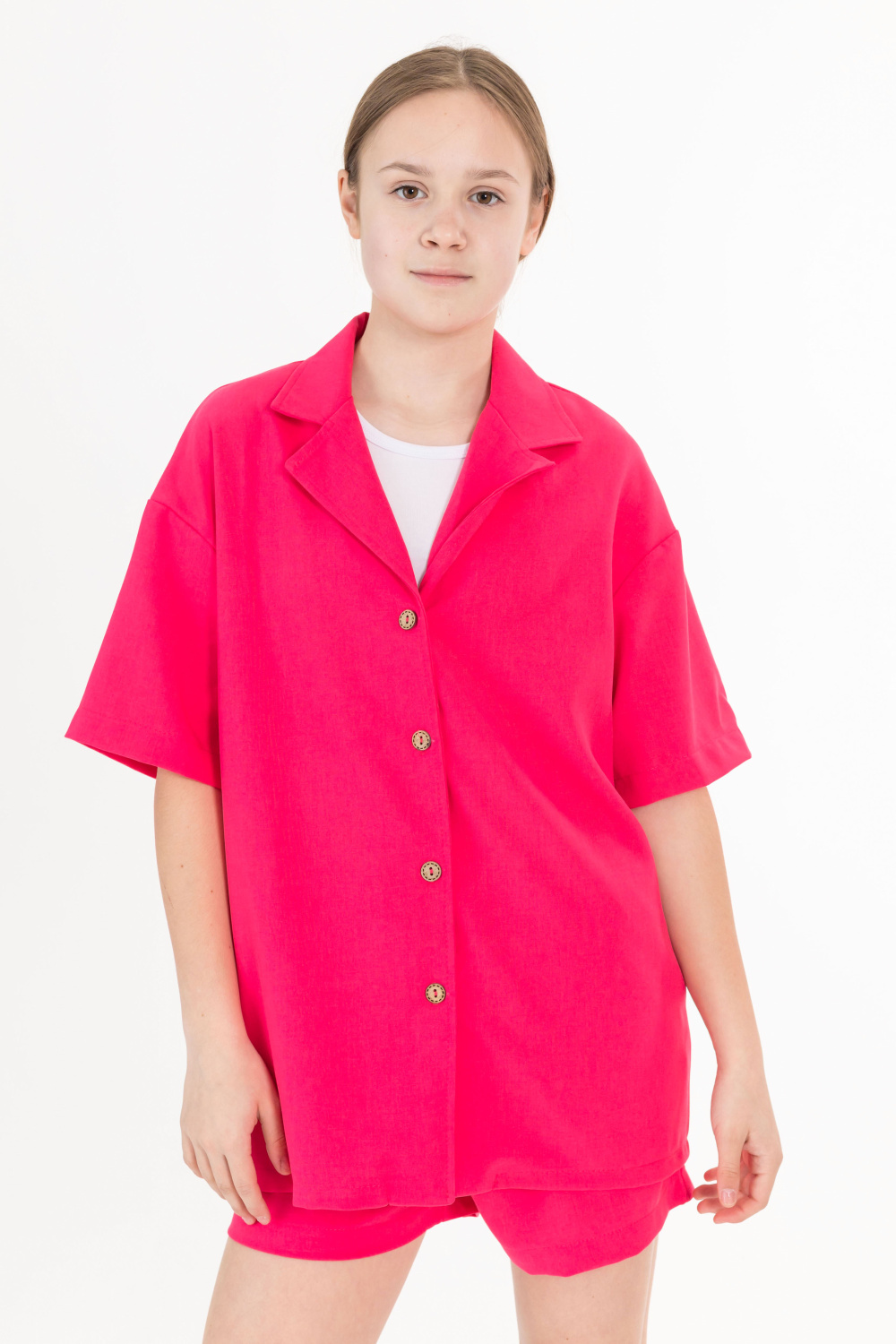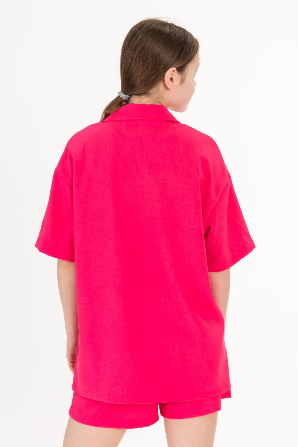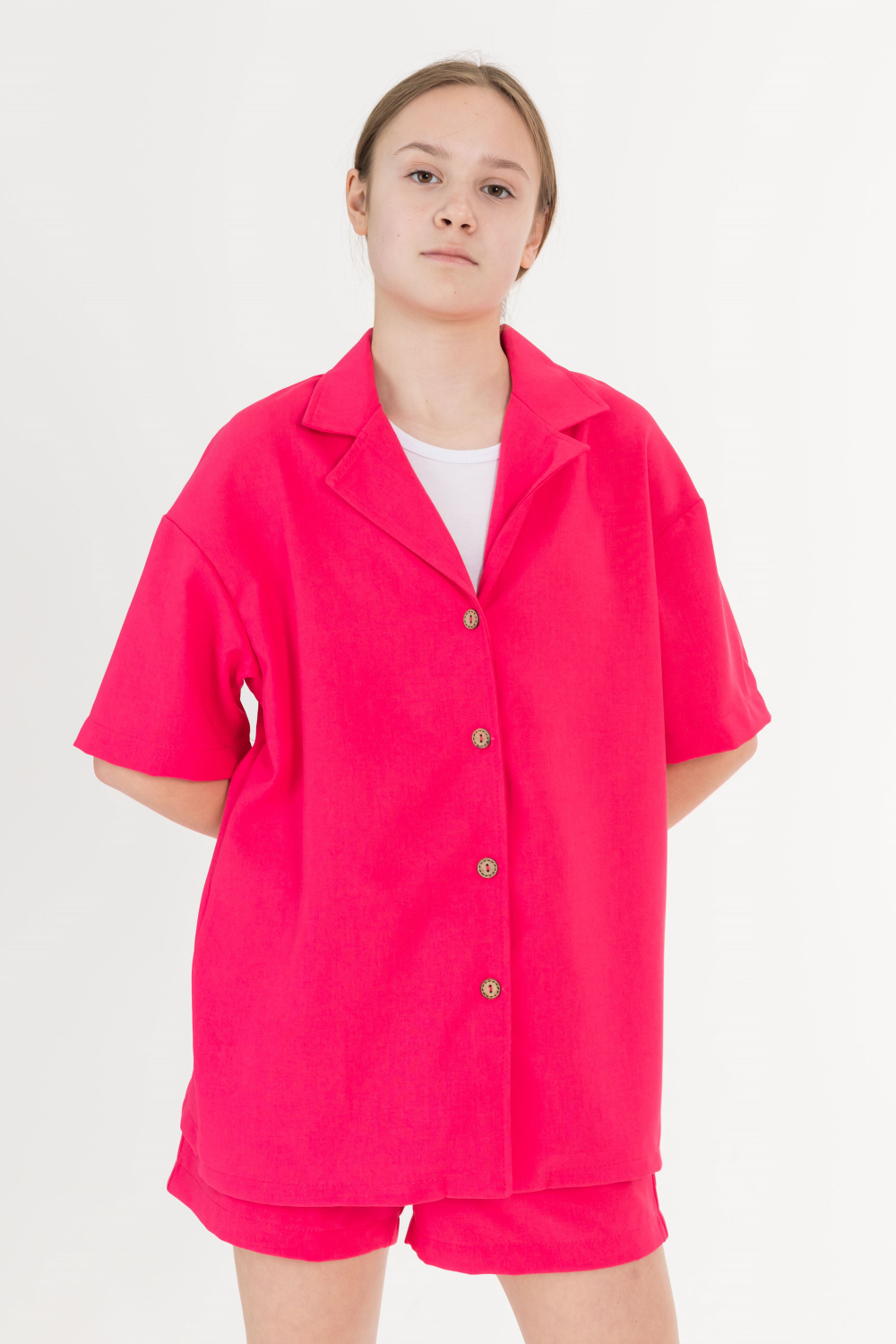 Рубашка — стильный и практичный элемент гардероба. Она изготовлена из практичного однотонного полотна, имитирующего лён. Рубашка имеет короткий рукав, застёгивается на пуговицы и дополнена отложным воротником.