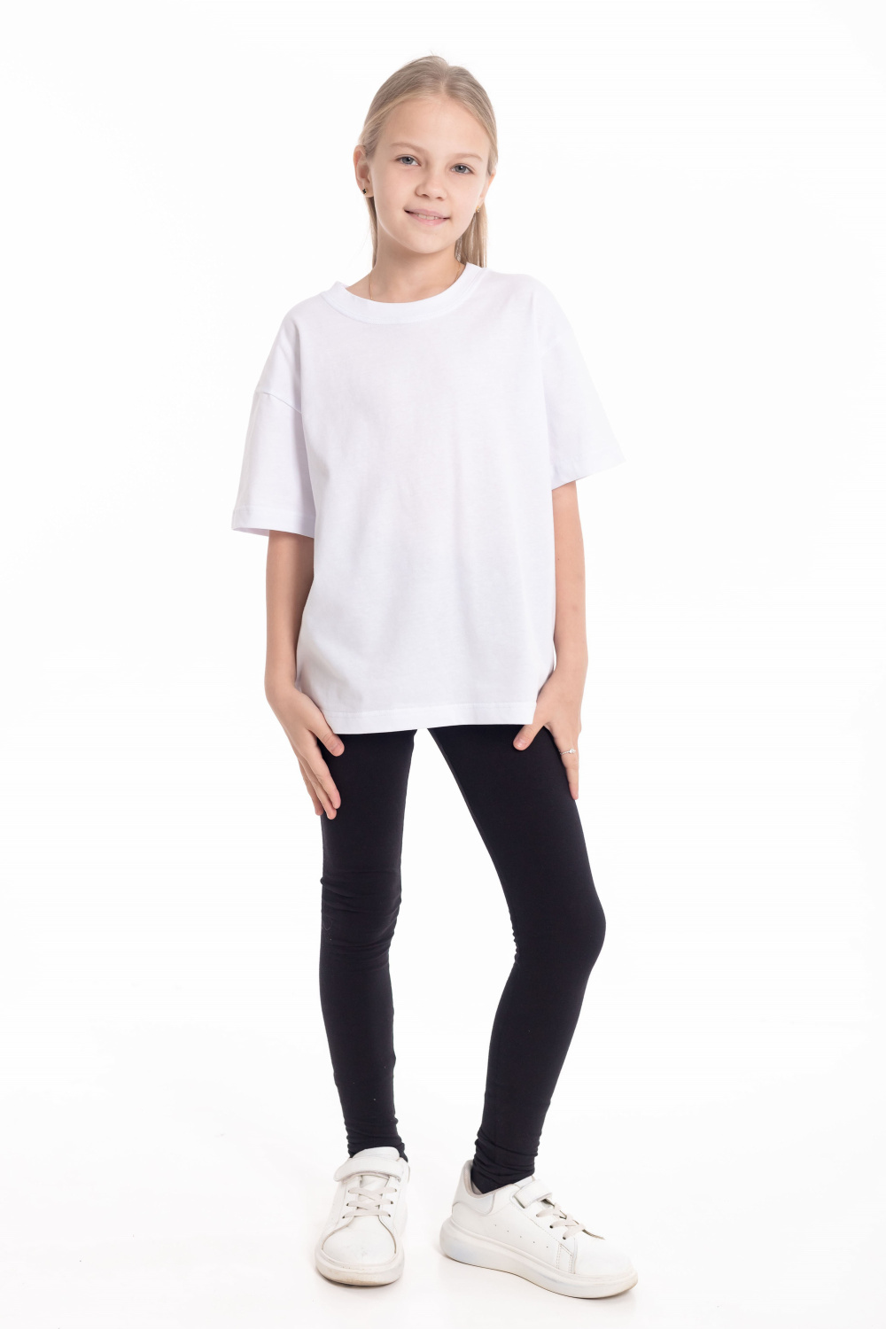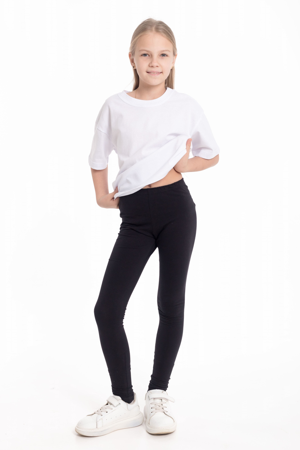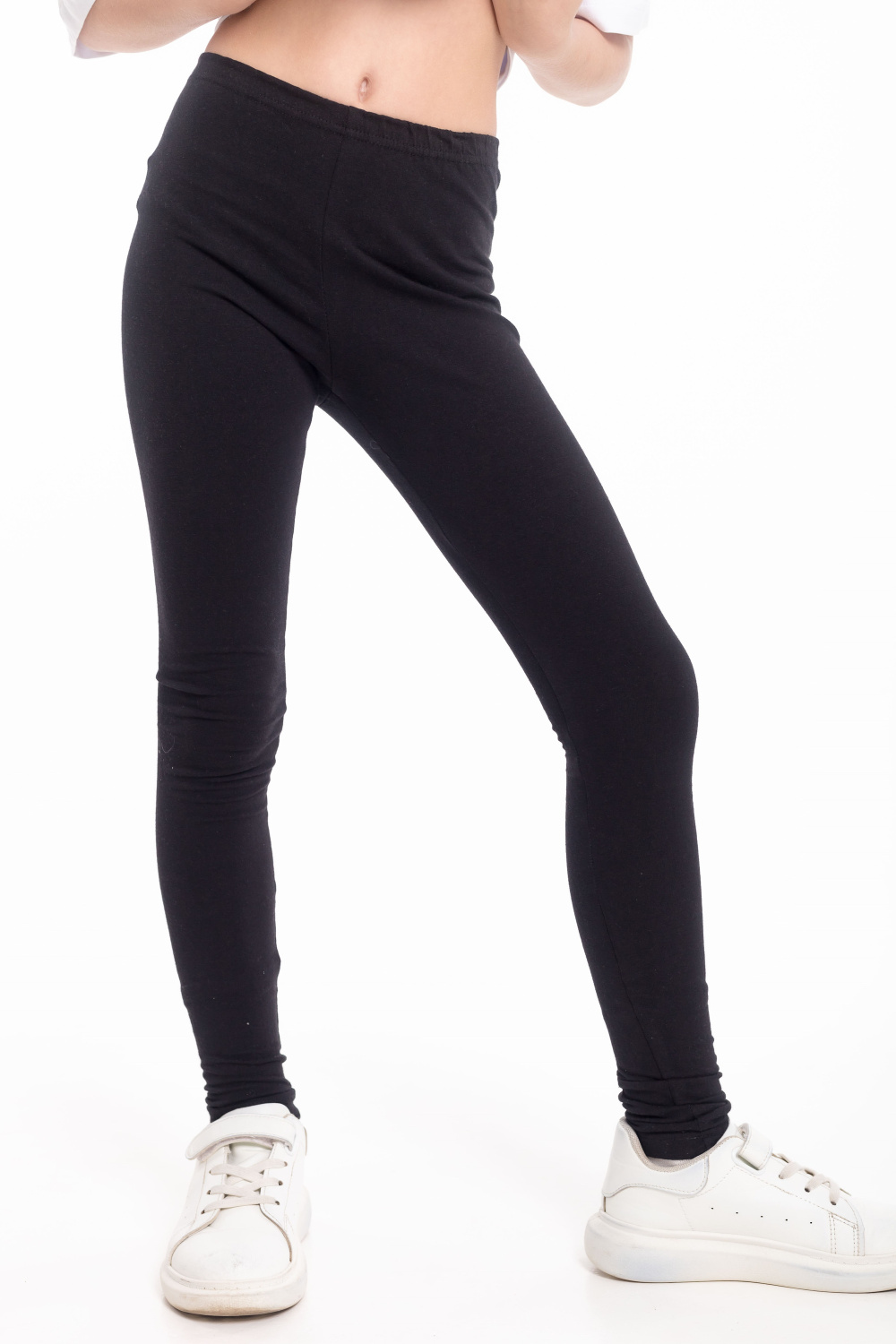 Лосины для девочки выполнены из хлопкового полотна с добавлением лайкры. Пояс на резинке.