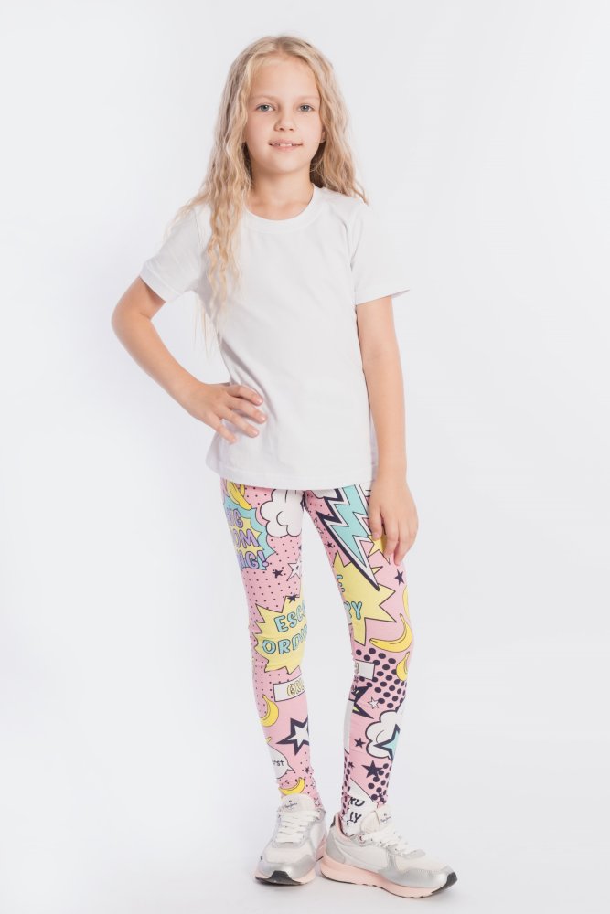 Лосины для девочки выполнены из хлопкового полотна с добавлением лайкры. Пояс на резинке.