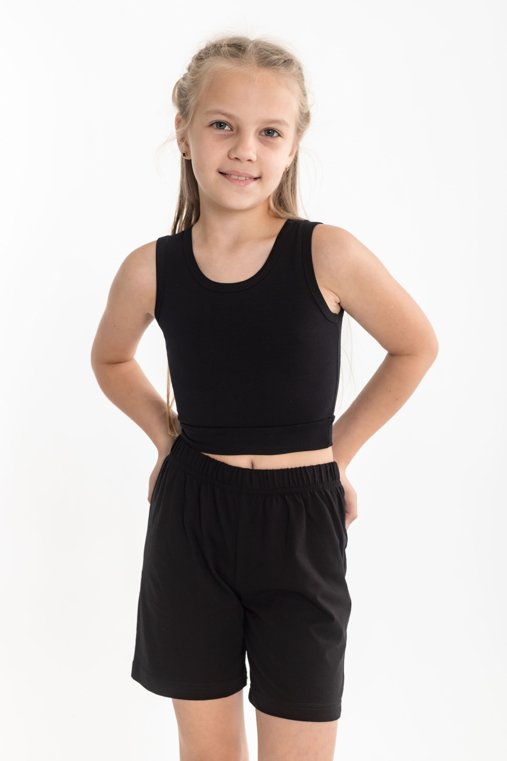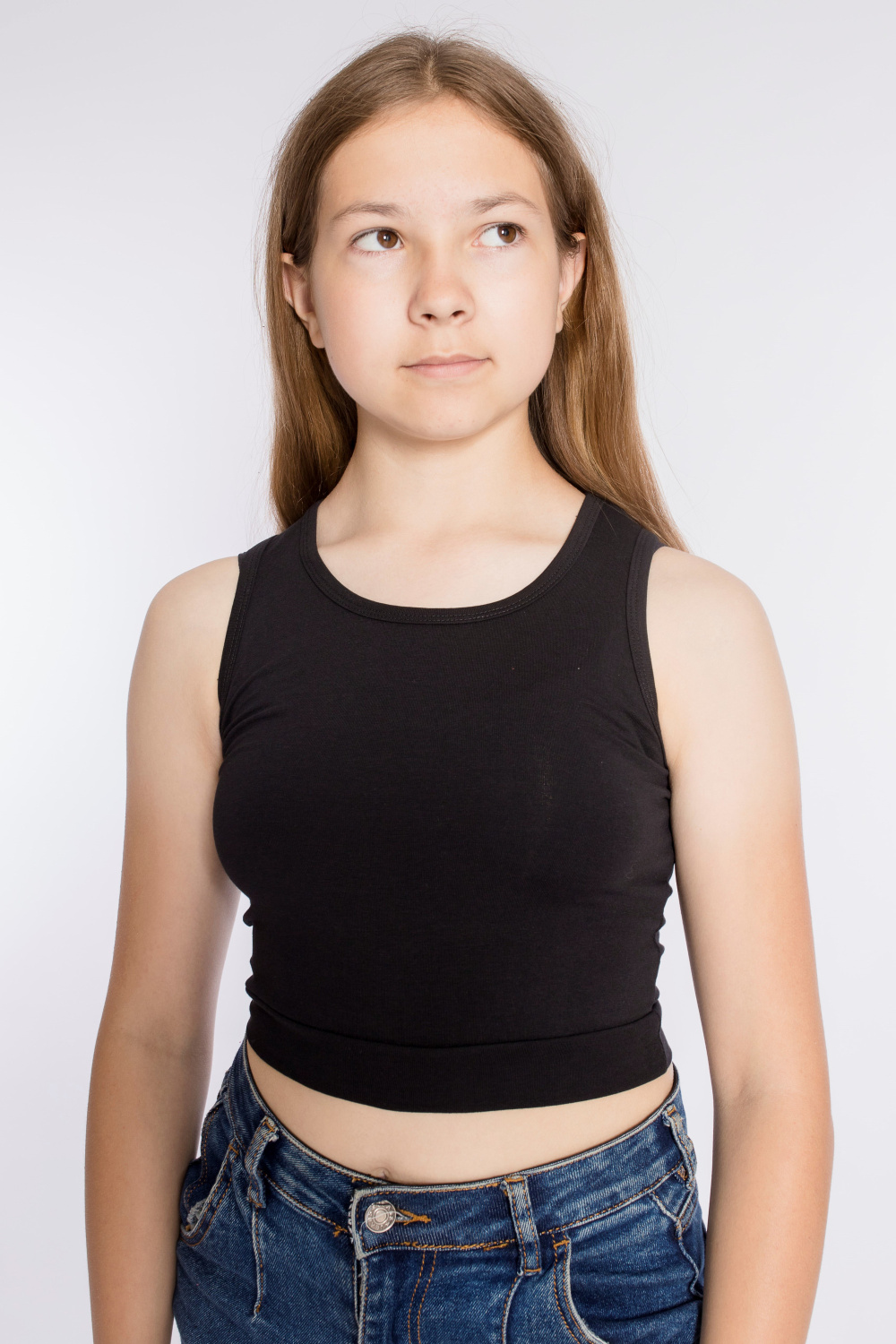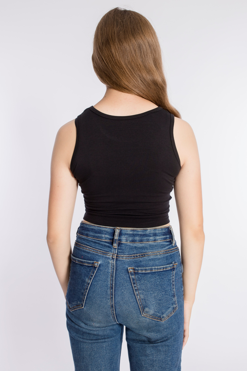 Майка укороченная из однотонной кулирки с лайкрой, горловина и проймы обработаны бейкой.