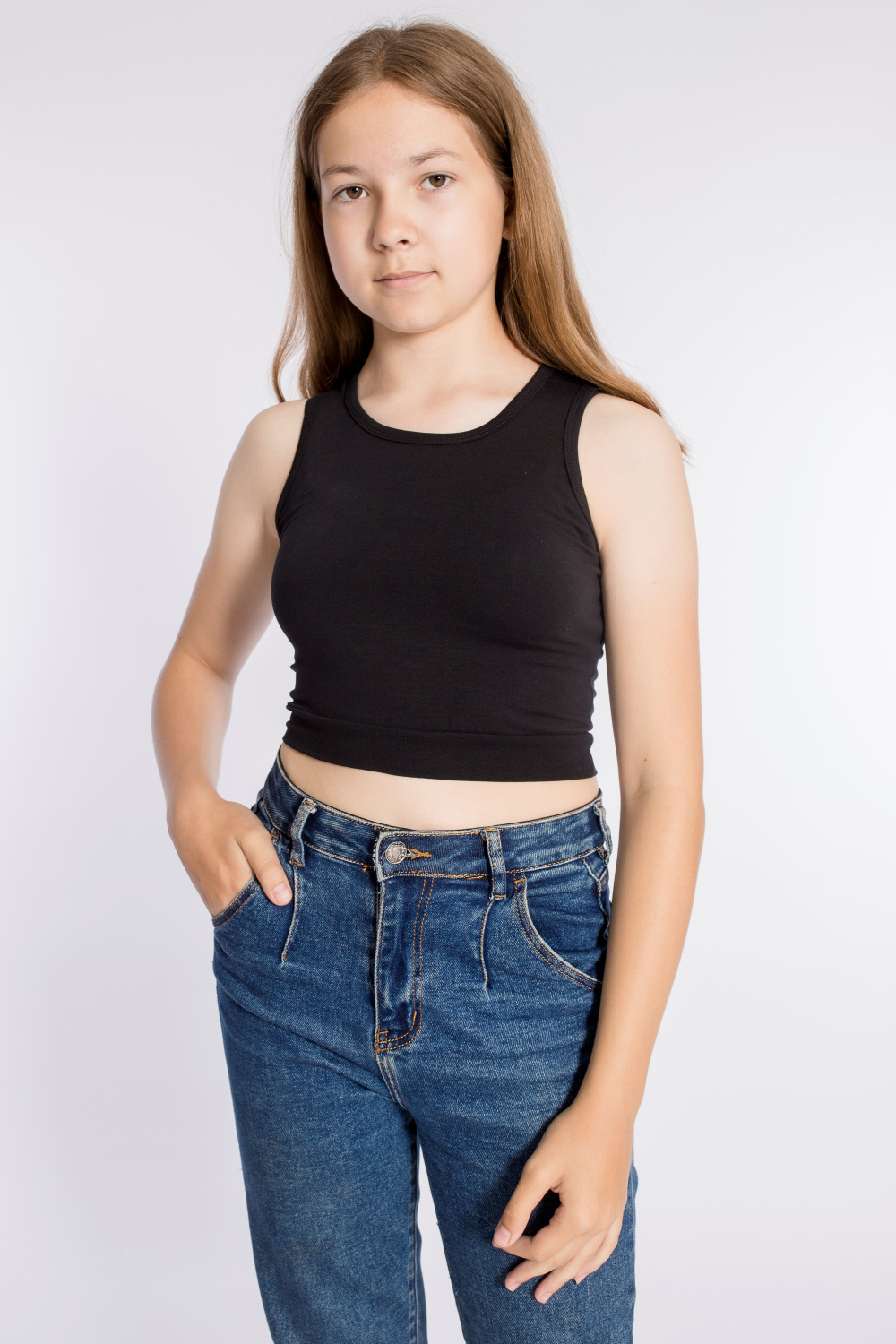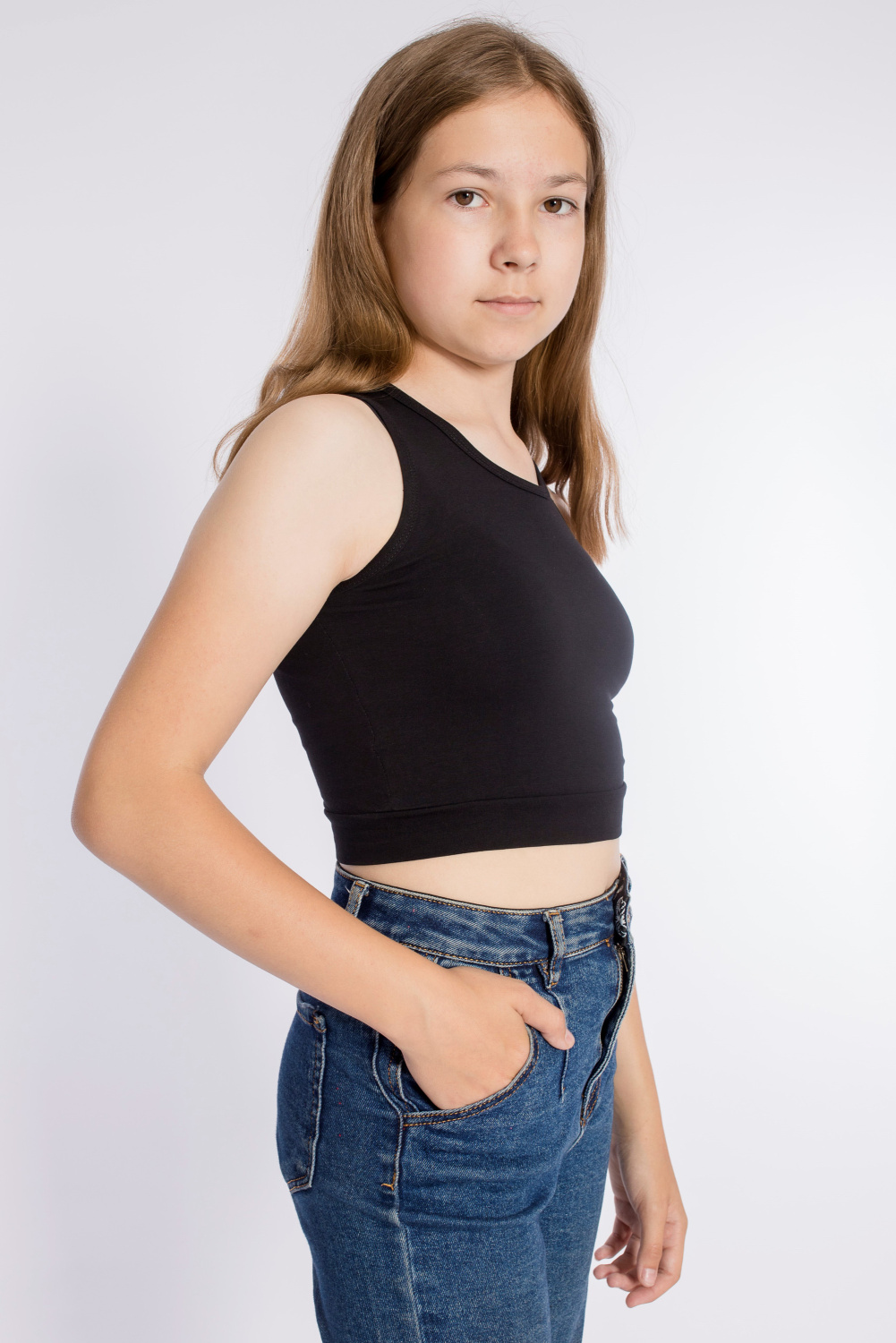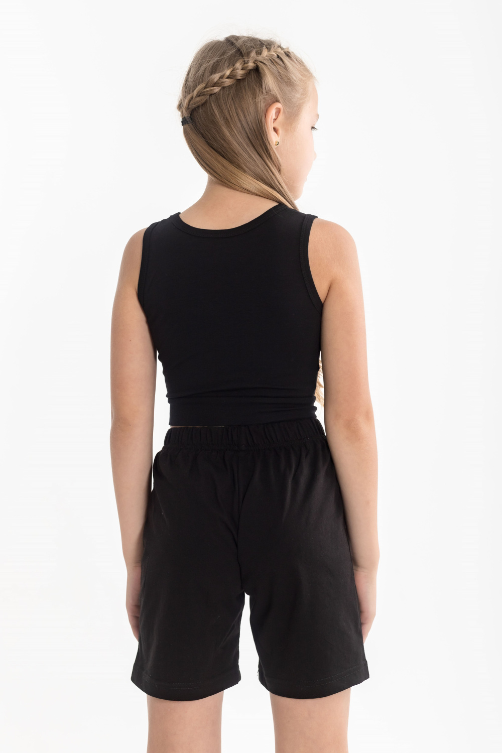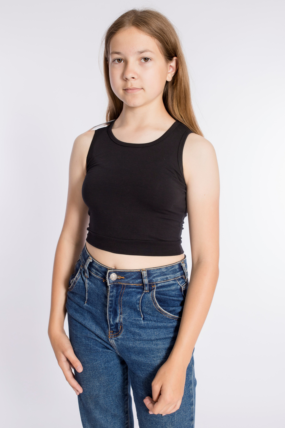 Майка укороченная из однотонной кулирки с лайкрой, горловина и проймы обработаны бейкой.