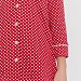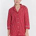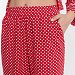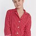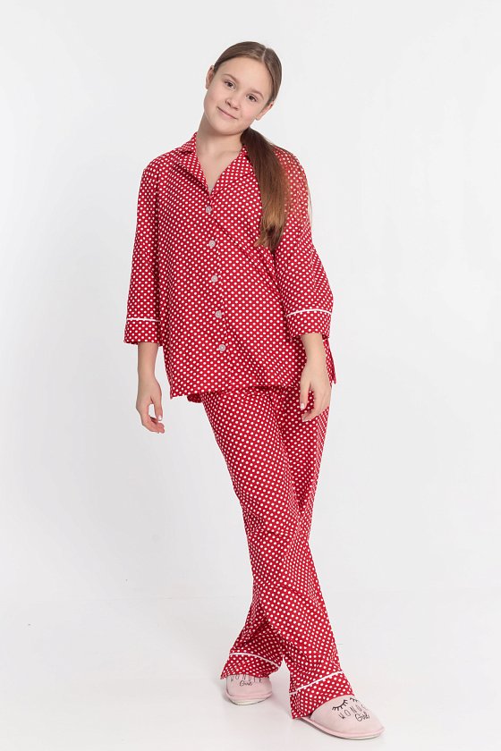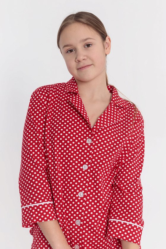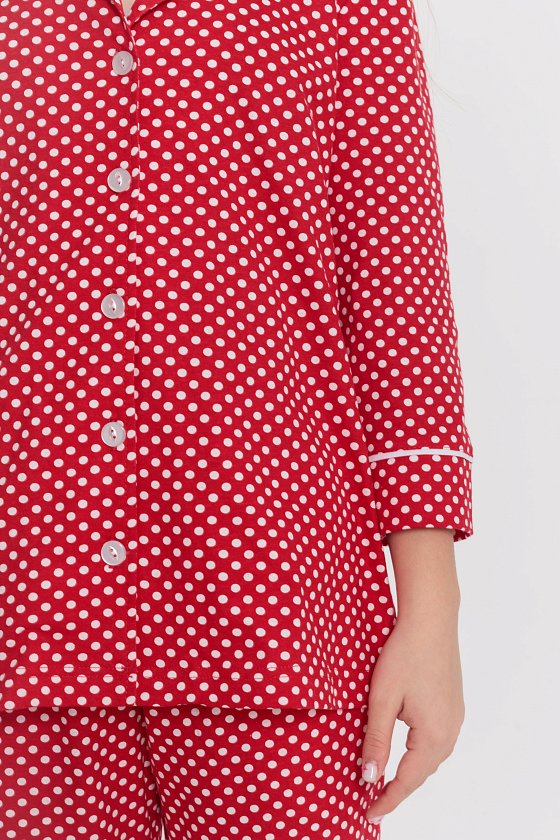 Пижама выполнена из кулирки с набивкой в горошек с отделкой кантом на рубашке и брюках. Рубашка с отложным воротником и бортами, с рукавом длиной 3/4 и разрезами в боковых швах. Спереди застёжка на пуговицы. Брюки с боковыми карманами и притачным поясом.