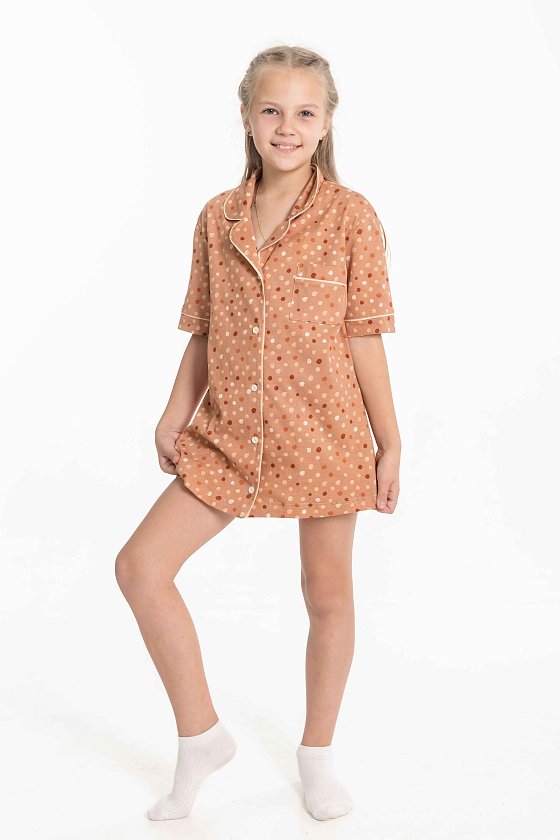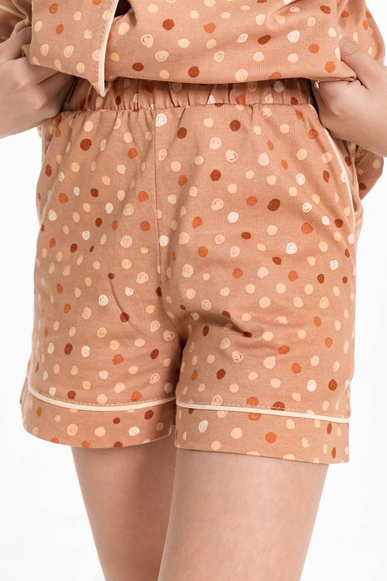 Пижама для девочки выполнена из мягкой кулирки. Рубашка с коротким рукавом, воротником и застежкой на пуговицы. На полочке расположен нагрудный карман, все детали оформлены кантом из отделочного полотна. Шорты свободного кроя с поясом на резинке, также декорированы кантом. Модель удобна в носке и идеально подходит для сна и отдыха.