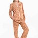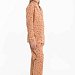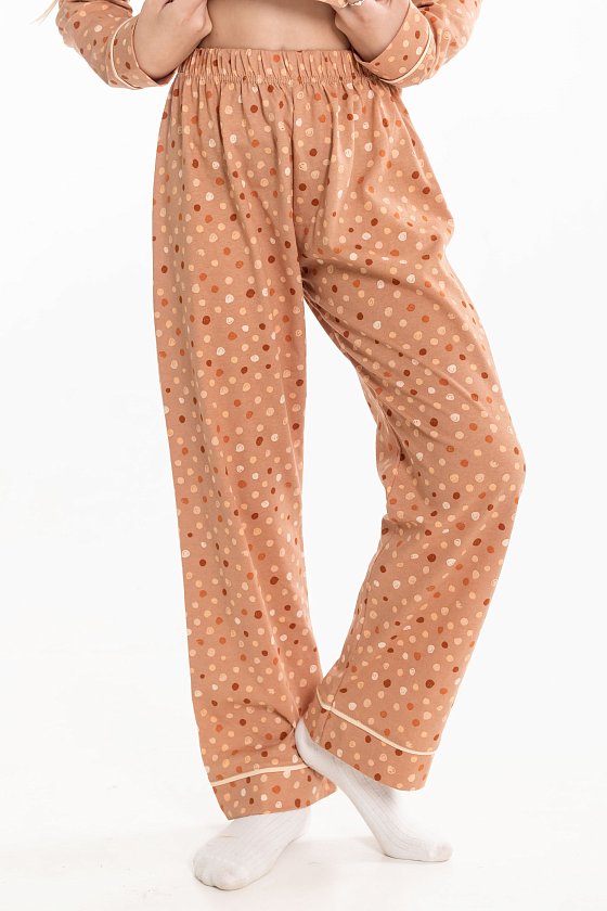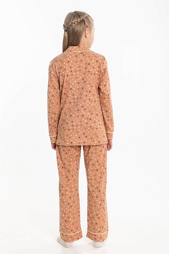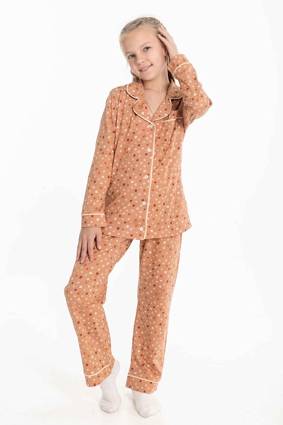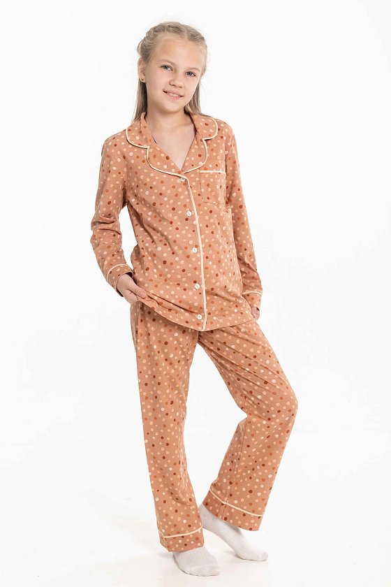 Пижама для девочки выполнена из мягкой кулирки. Рубашка с длинным рукавом, воротником и застежкой на пуговицы. На полочке расположен нагрудный карман, все детали оформлены кантом из отделочного полотна. Брюки свободного кроя с поясом на резинке, также декорированы кантом. Модель удобна в носке и идеально подходит для сна и отдыха.