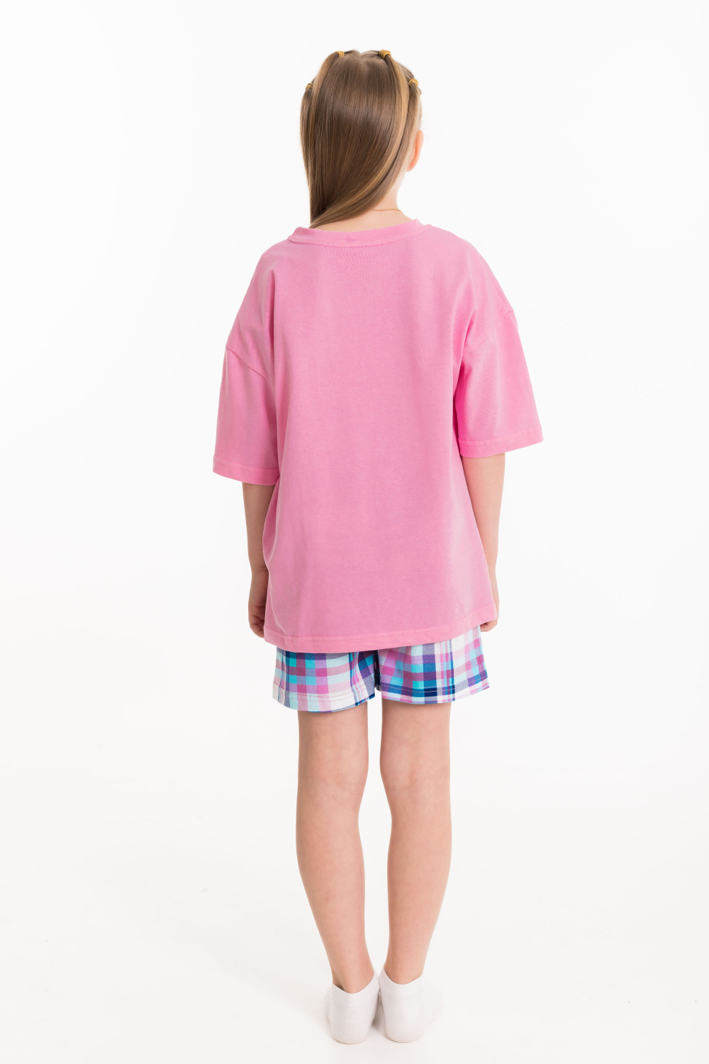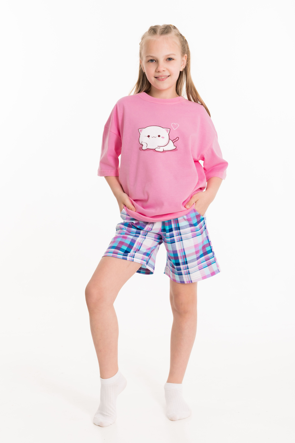 Пижама для девочек состоит из свободных шорт и футболки, выполненных из мягкой и приятной на ощупь ткани — кулирки (100% хлопок). Футболка свободного кроя с круглым вырезом горловины и рукавом до локтя. Особенностью модели является спущенная линия плеча и интересный принт спереди. Шорты также выполнены из кулирки с набивным рисунком, они удлинённые, свободного кроя и имеют боковые карманы. Пояс на широкой резинке обеспечивает комфортную посадку. Изготовленная из натуральной ткани, пижама обеспечит комфорт в течение всего дня.