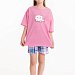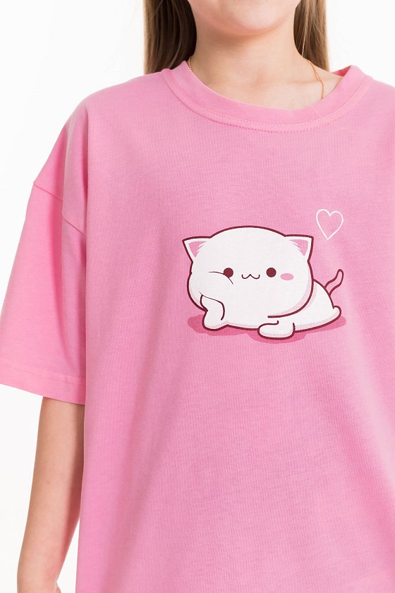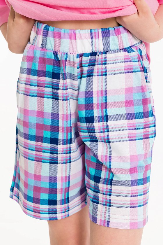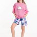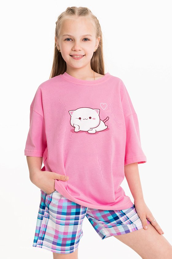 Пижама для девочек состоит из свободных шорт и футболки, выполненных из мягкой и приятной на ощупь ткани — кулирки (100% хлопок). Футболка свободного кроя с круглым вырезом горловины и рукавом до локтя. Особенностью модели является спущенная линия плеча и интересный принт спереди. Шорты также выполнены из кулирки с набивным рисунком, они удлинённые, свободного кроя и имеют боковые карманы. Пояс на широкой резинке обеспечивает комфортную посадку. Изготовленная из натуральной ткани, пижама обеспечит комфорт в течение всего дня.