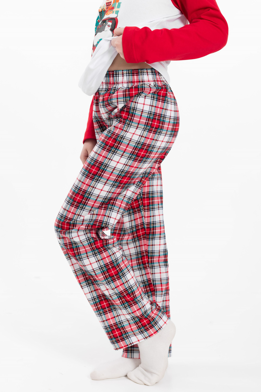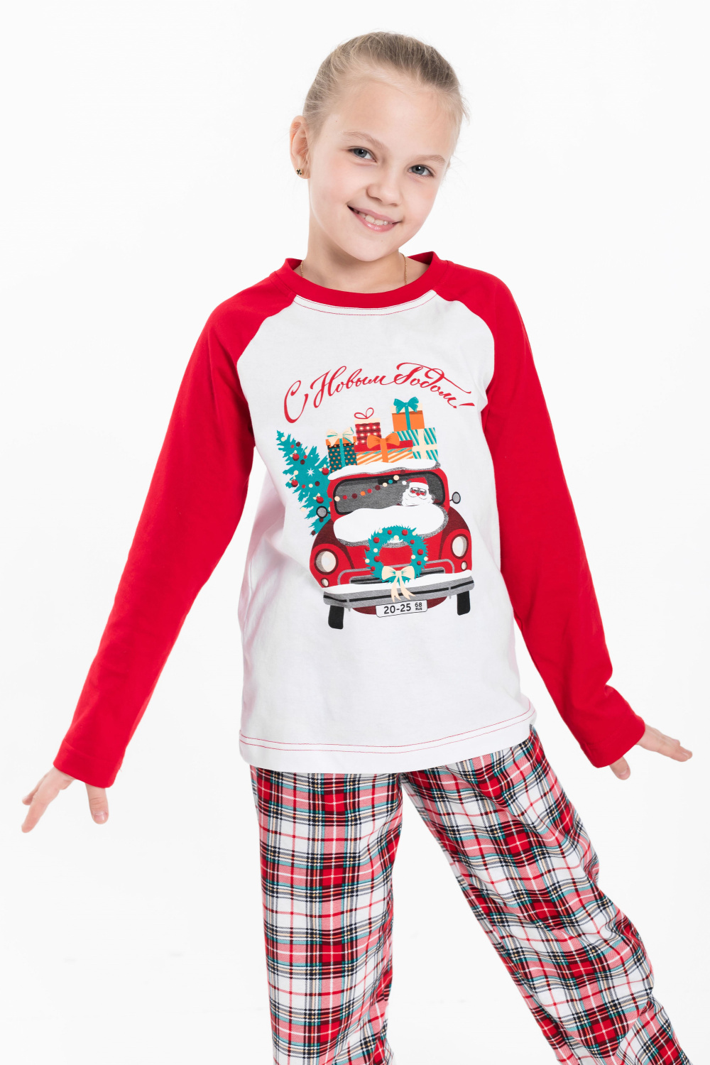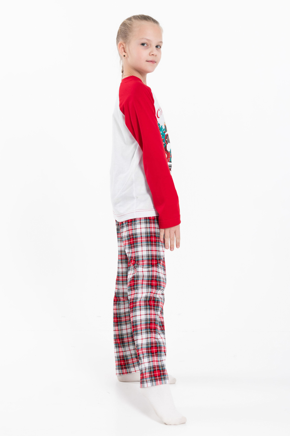 Детская пижама новогодняя - лонгслив и брюки, изготовлена из мягкого и приятного к телу хлопкового полотна. Лонгслив прямого кроя, рукава реглан, перед и спинка белого цвета, спереди нанесён принт. Круглый вырез горловины отделан бейкой красного цвета. Брюки прямого кроя из кулирки с набивным рисунком в клетку, пояс на резинке. Изготовленная из натуральной ткани, пижама обеспечит комфорт в течение всего дня.