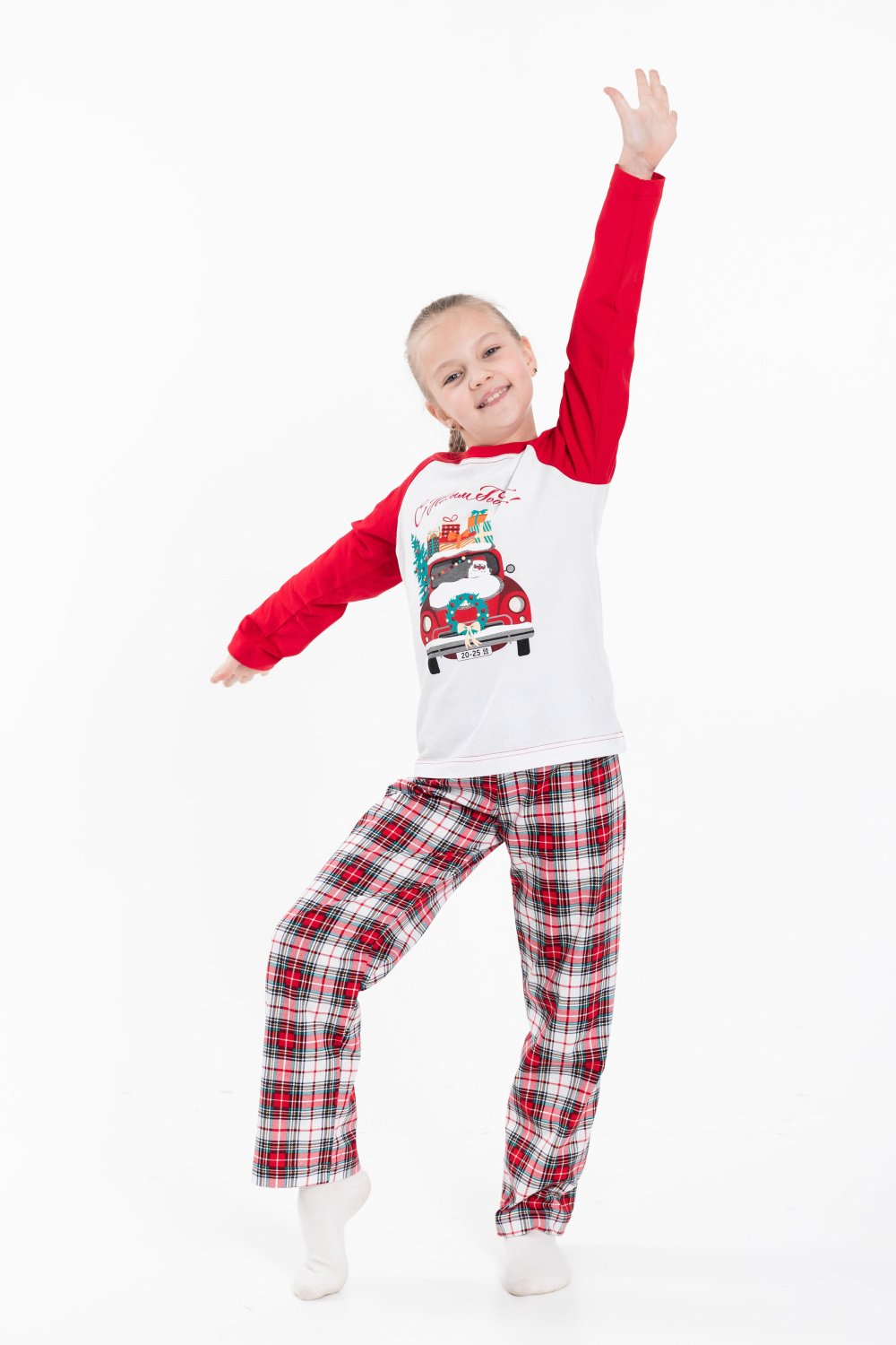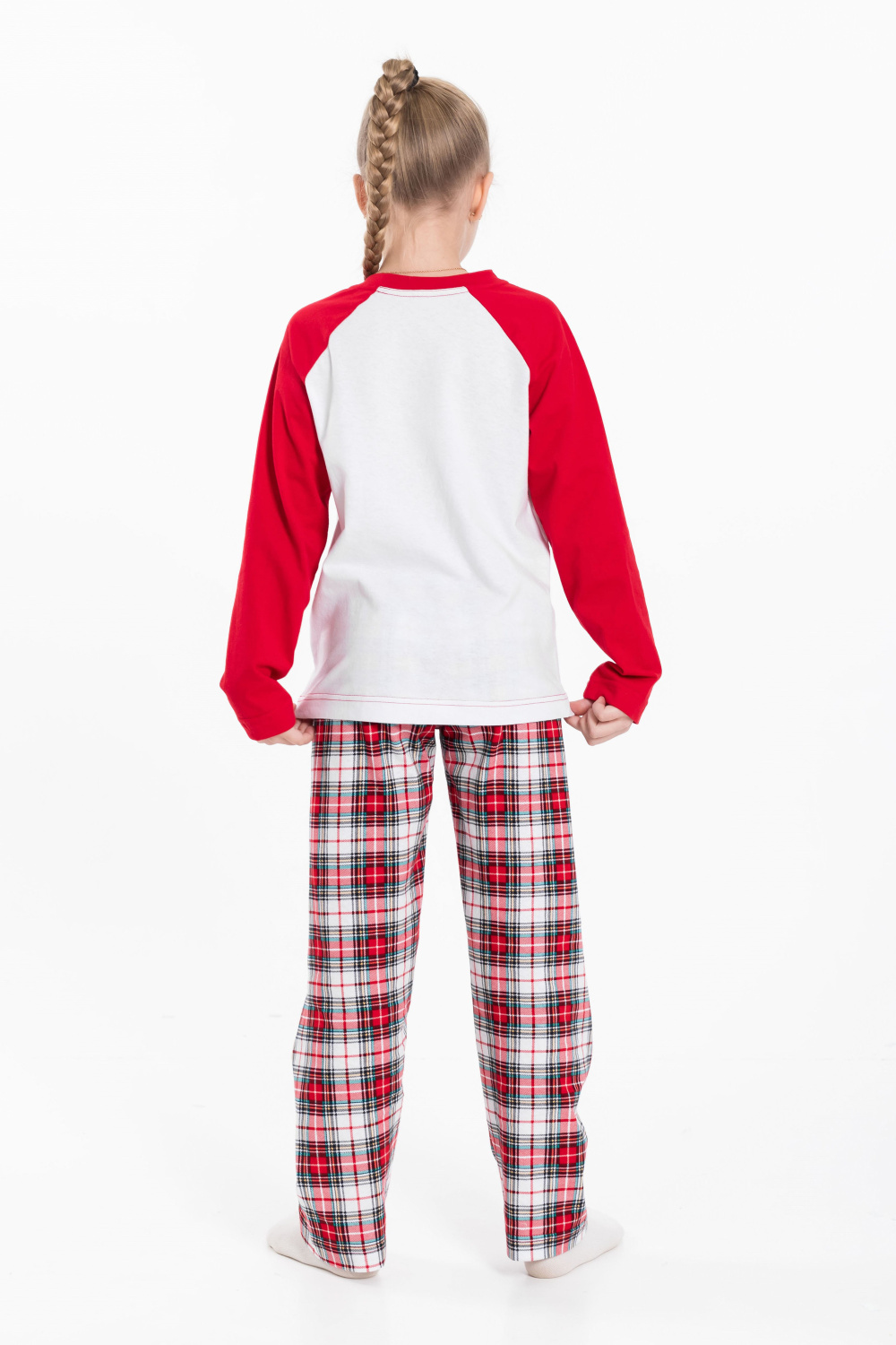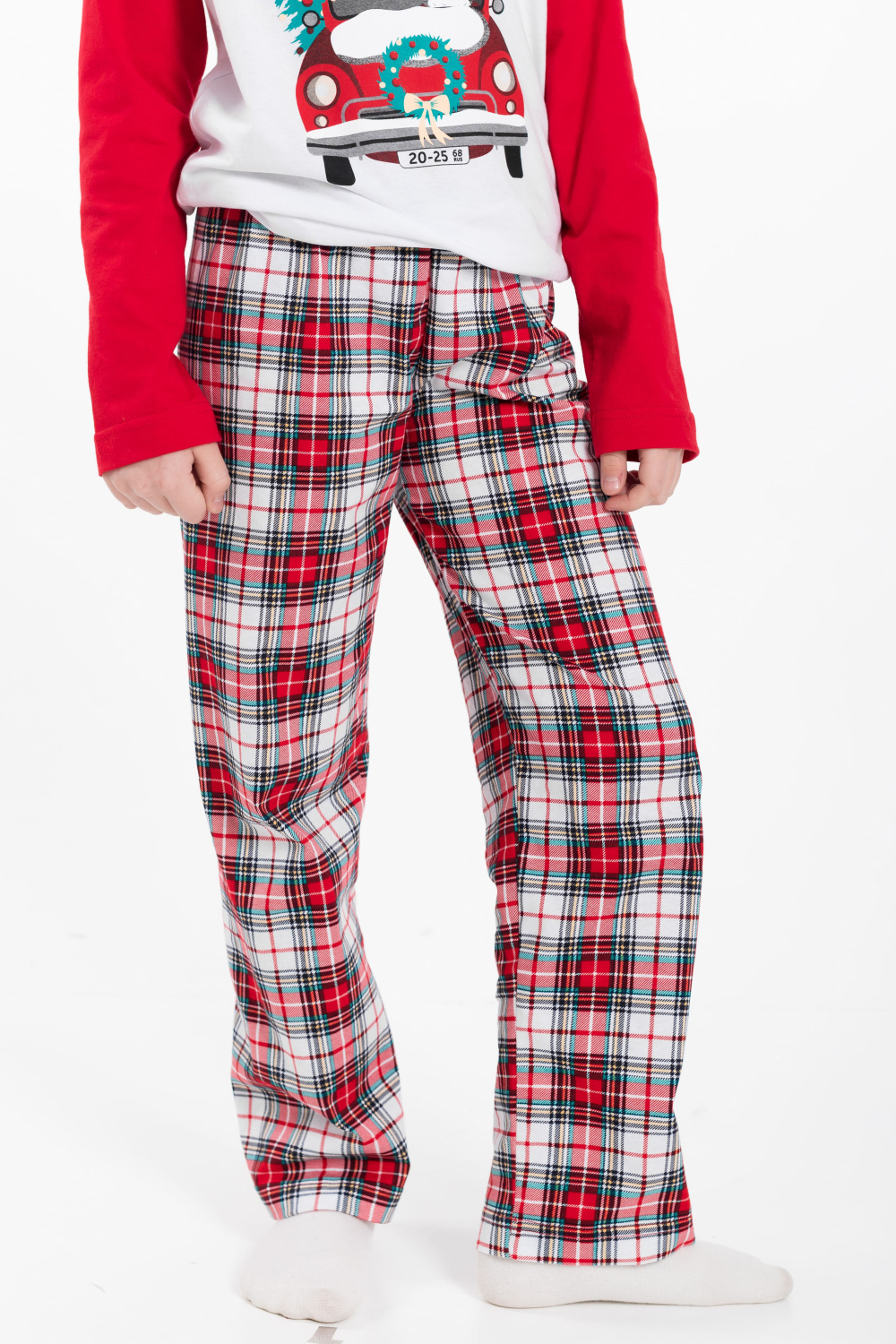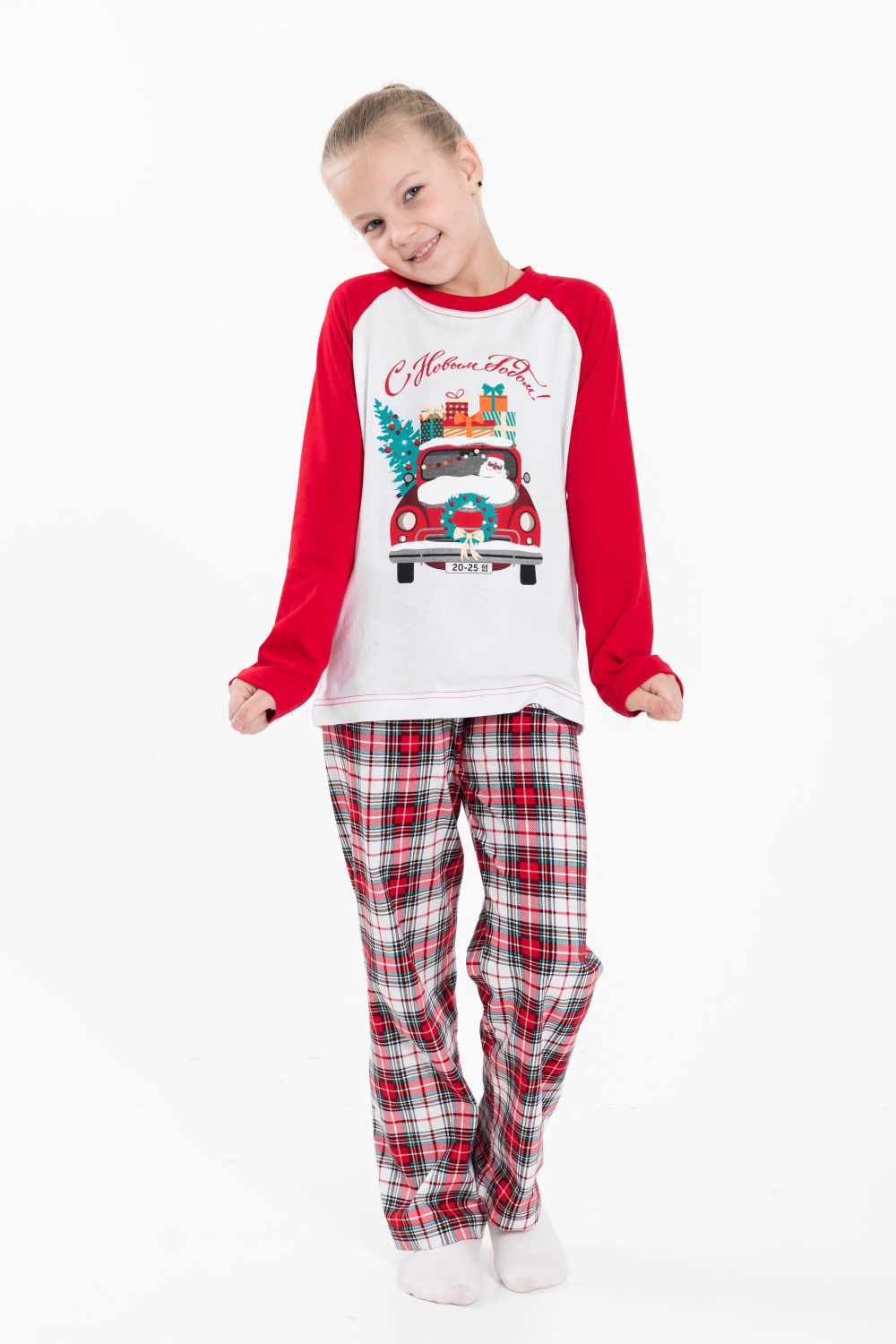 Детская пижама новогодняя - лонгслив и брюки, изготовлена из мягкого и приятного к телу хлопкового полотна. Лонгслив прямого кроя, рукава реглан, перед и спинка белого цвета, спереди нанесён принт. Круглый вырез горловины отделан бейкой красного цвета. Брюки прямого кроя из кулирки с набивным рисунком в клетку, пояс на резинке. Изготовленная из натуральной ткани, пижама обеспечит комфорт в течение всего дня.