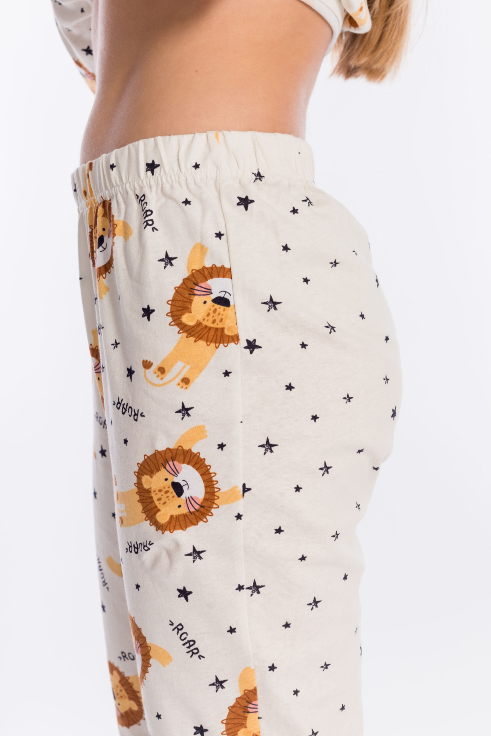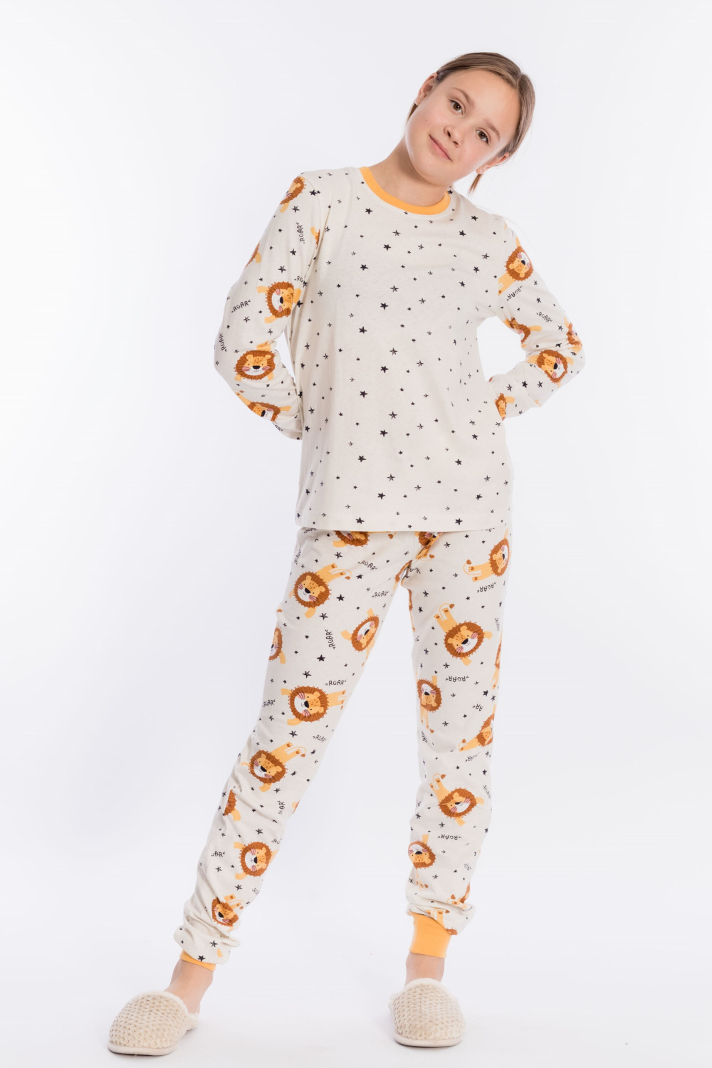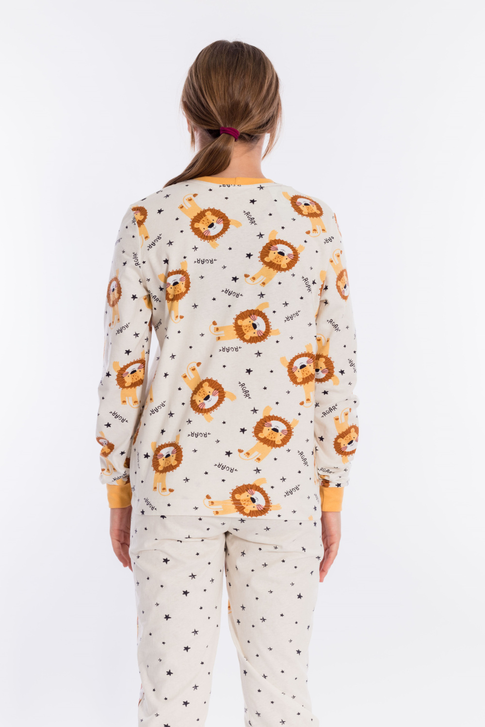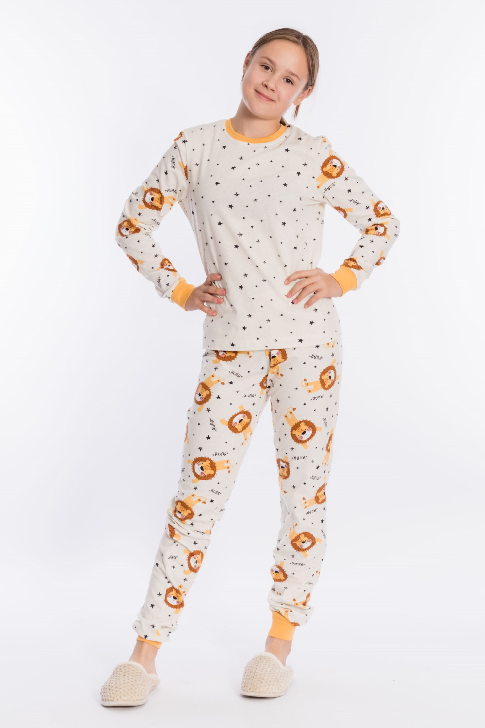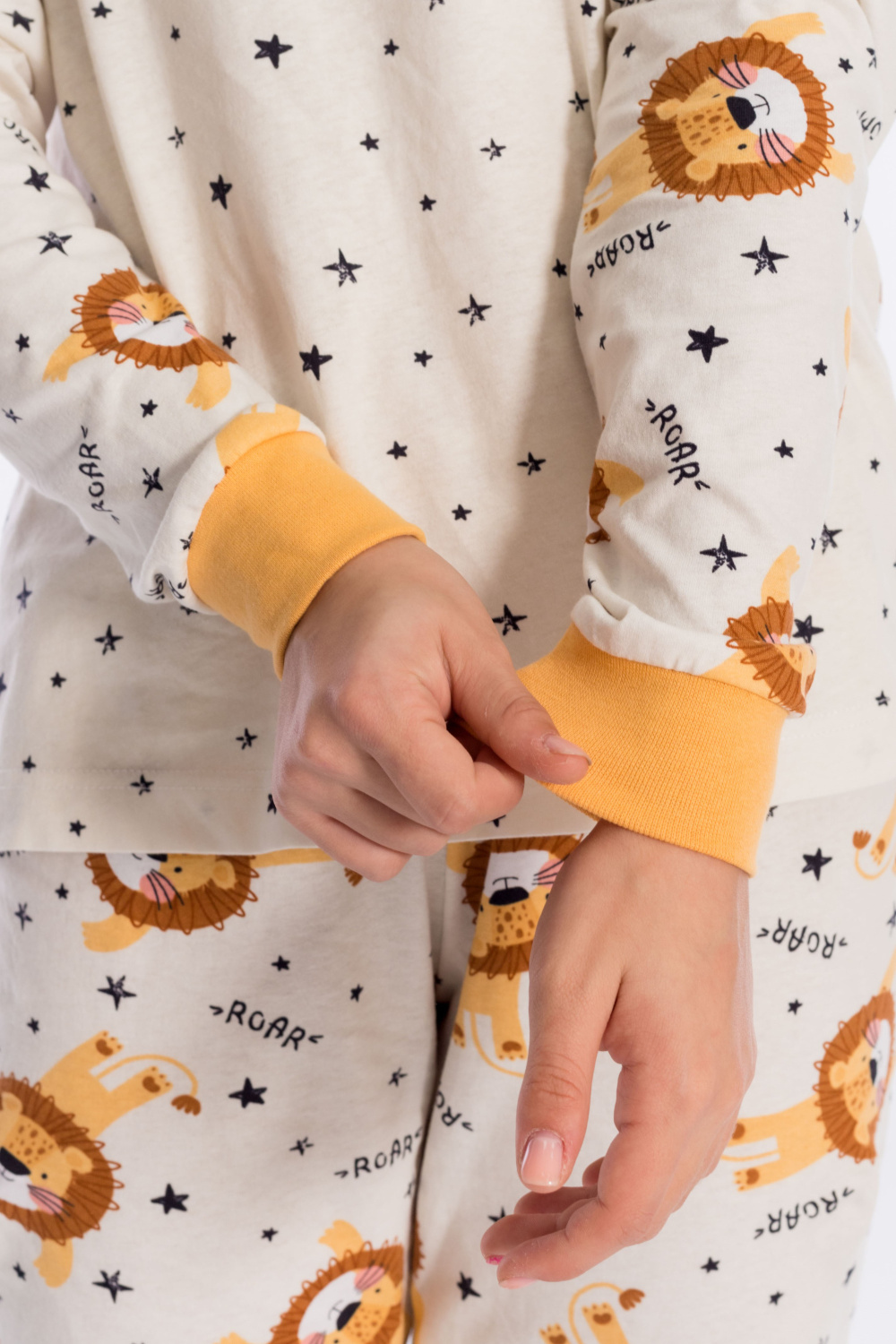 Пижама выполнена из кулирки, 100% хлопок, состоит из брюк и футболки с длинным рукавом. Футболка с планкой по горловине и манжетами на рукавах. Брюки с поясом на резинке и манжетами по низу.