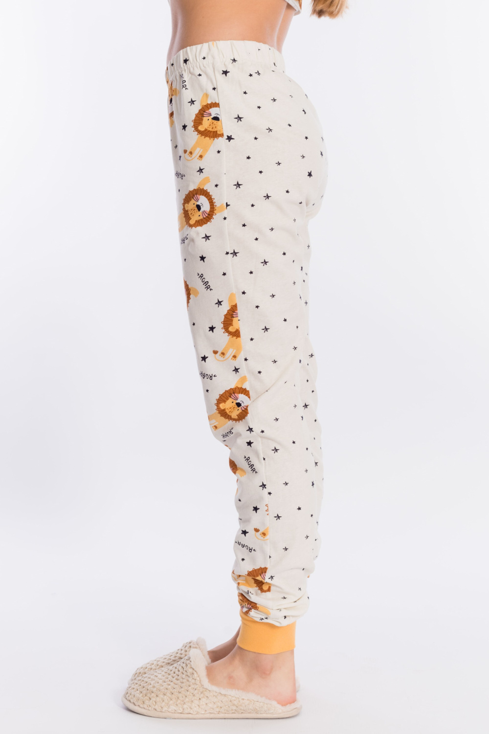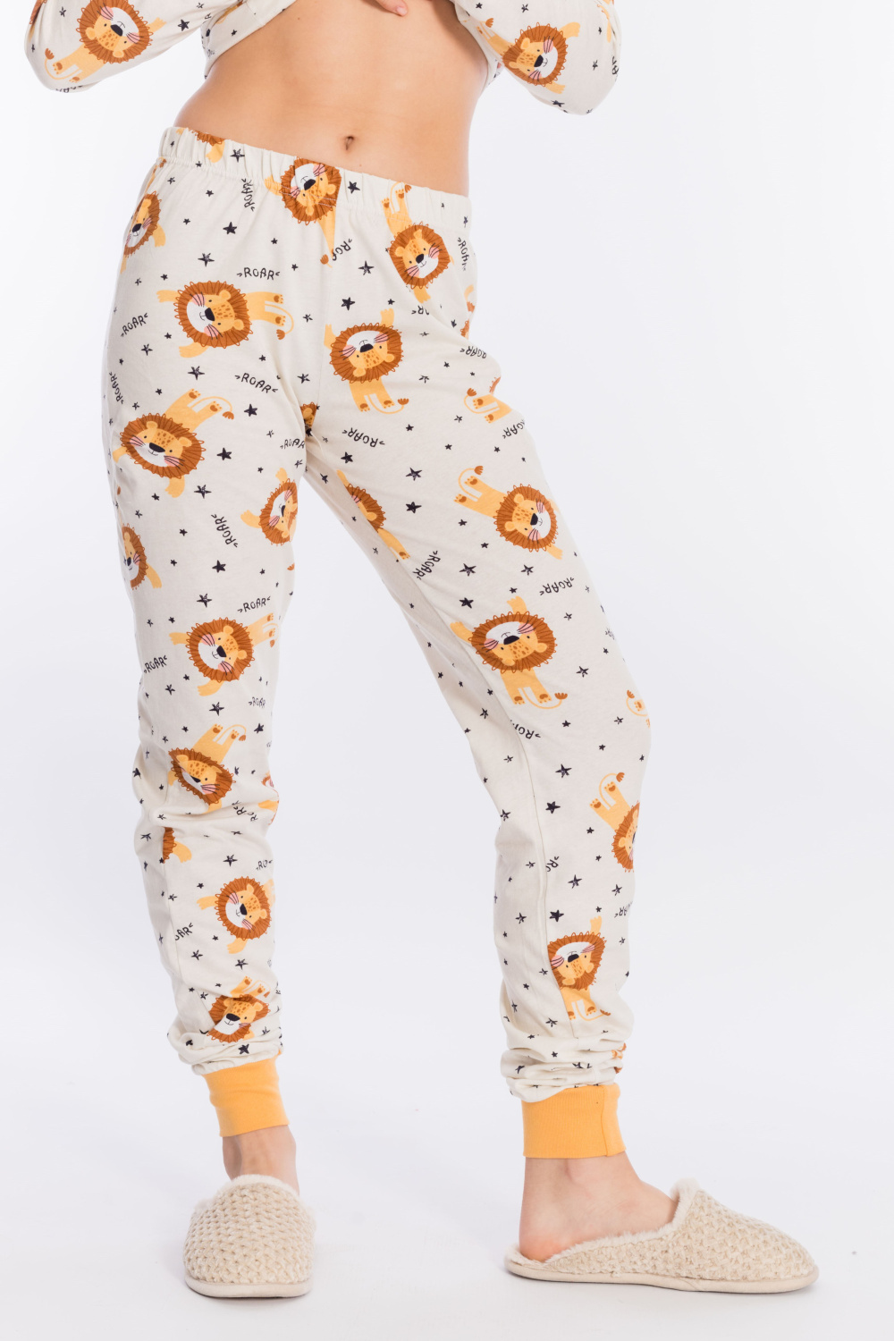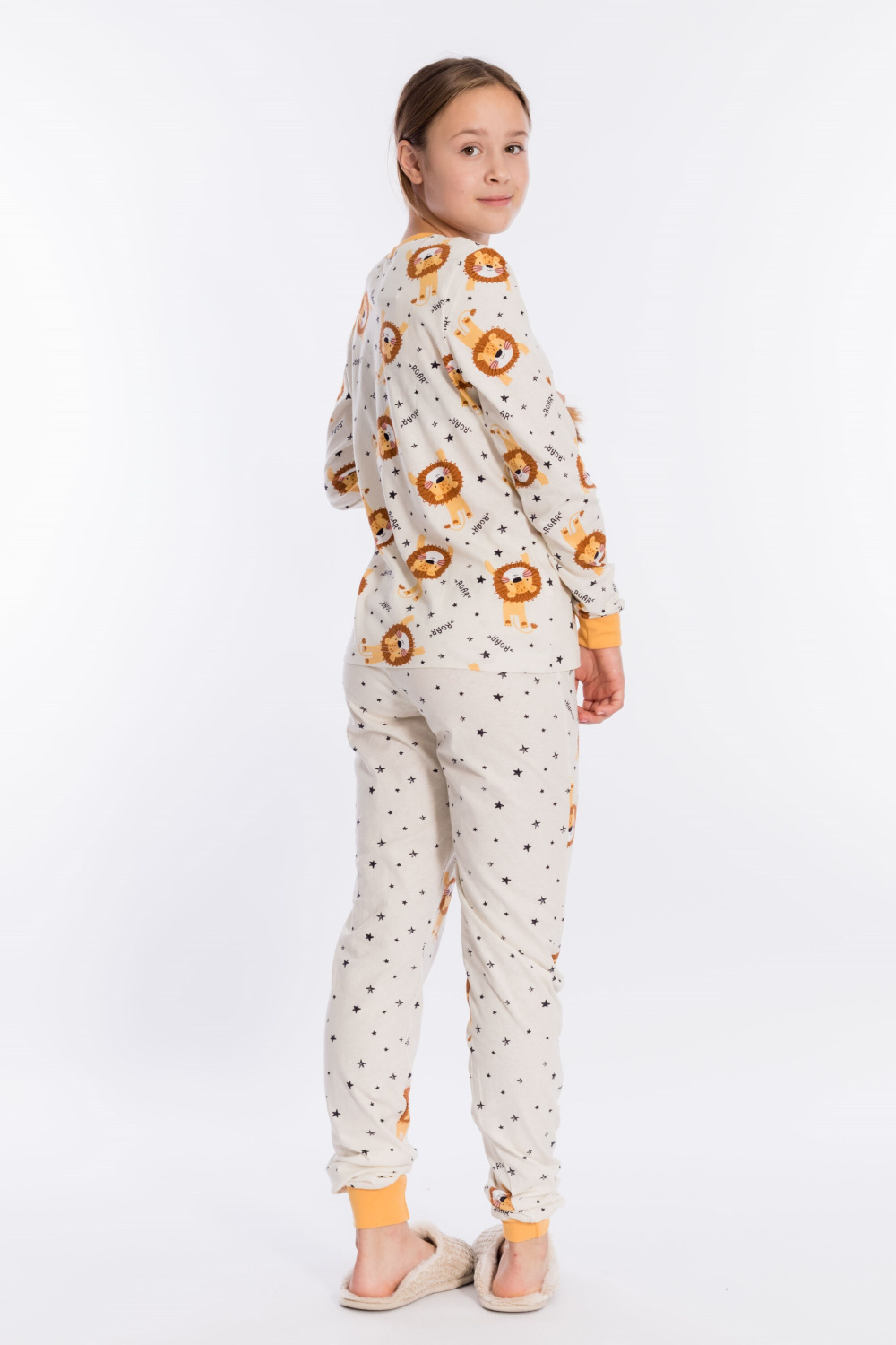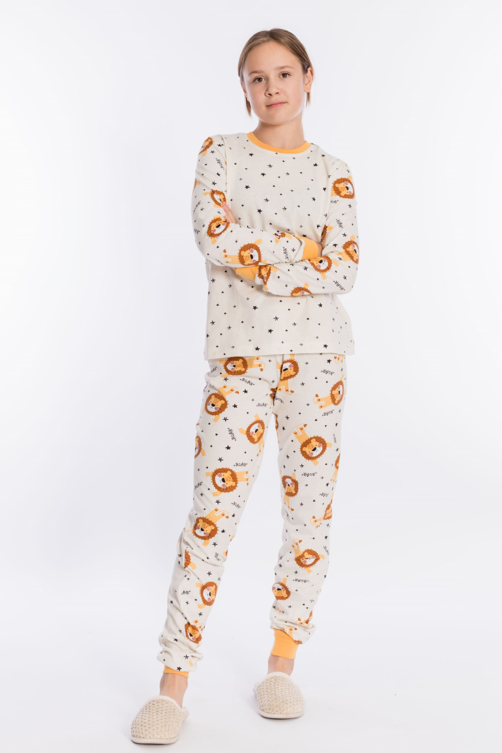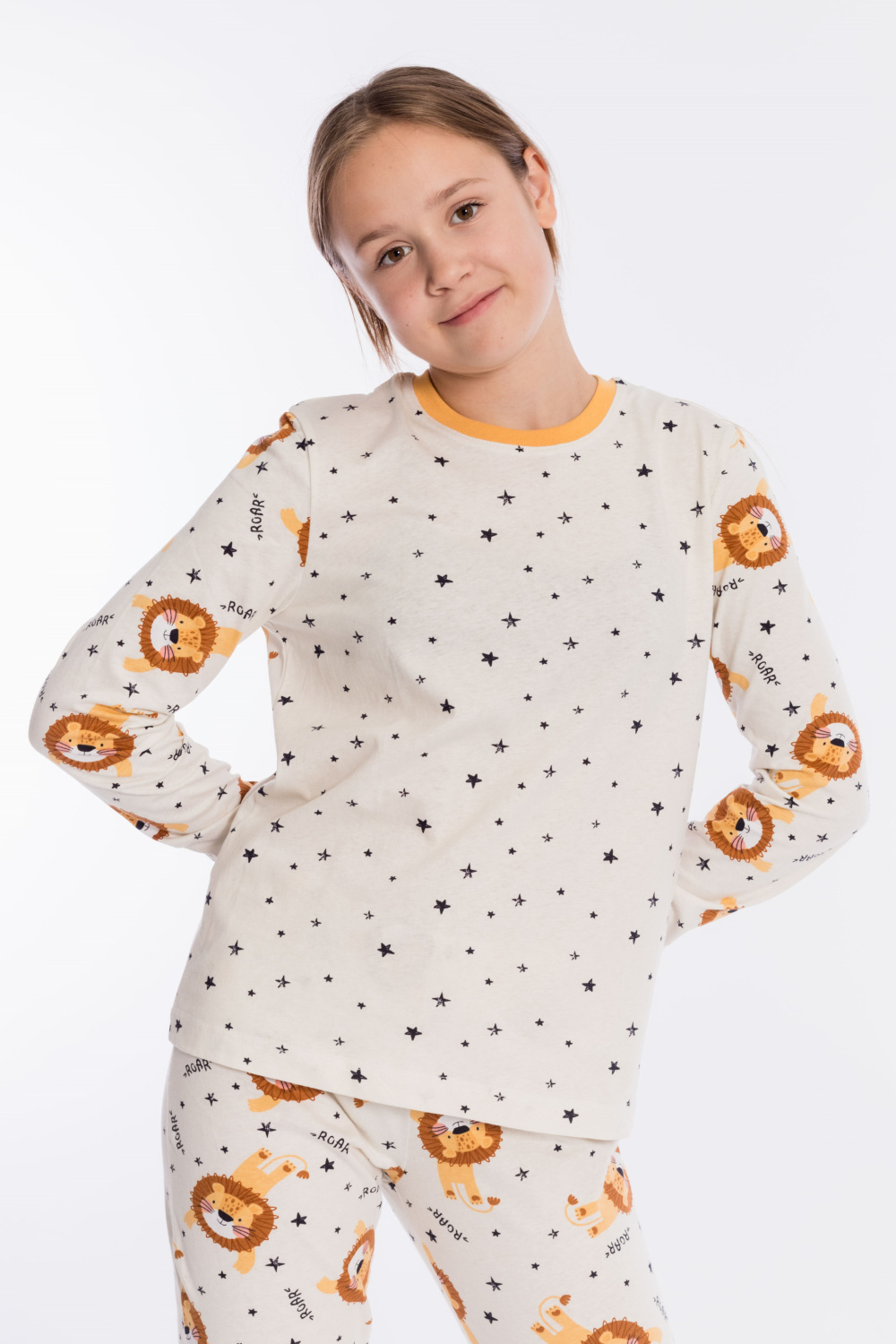 Пижама выполнена из кулирки, 100% хлопок, состоит из брюк и футболки с длинным рукавом. Футболка с планкой по горловине и манжетами на рукавах. Брюки с поясом на резинке и манжетами по низу.