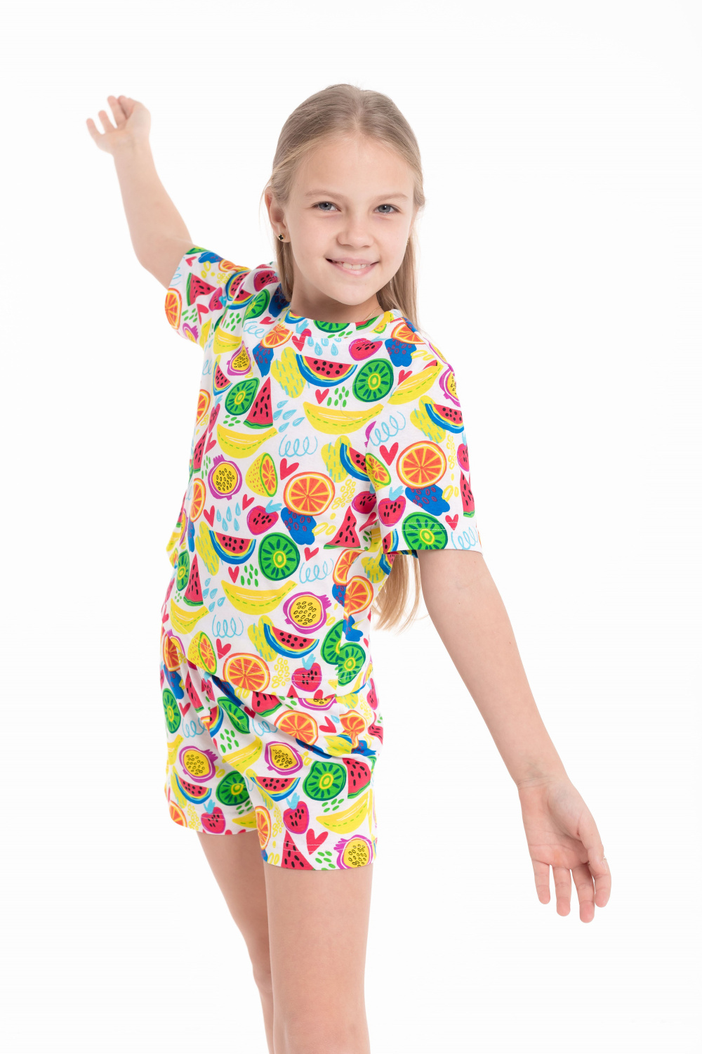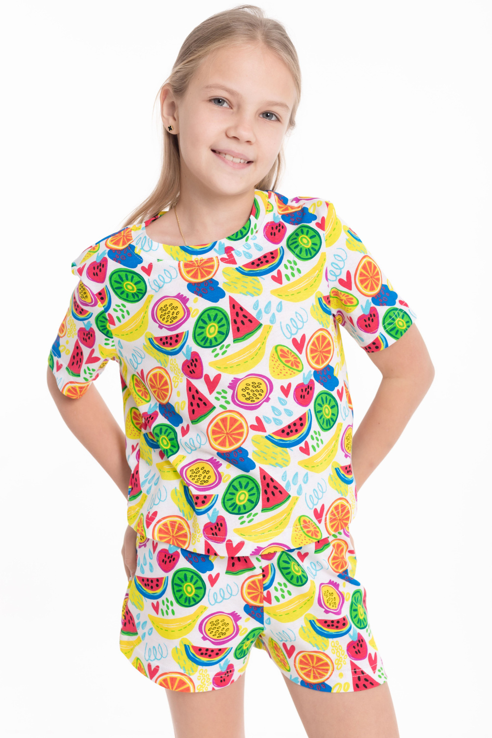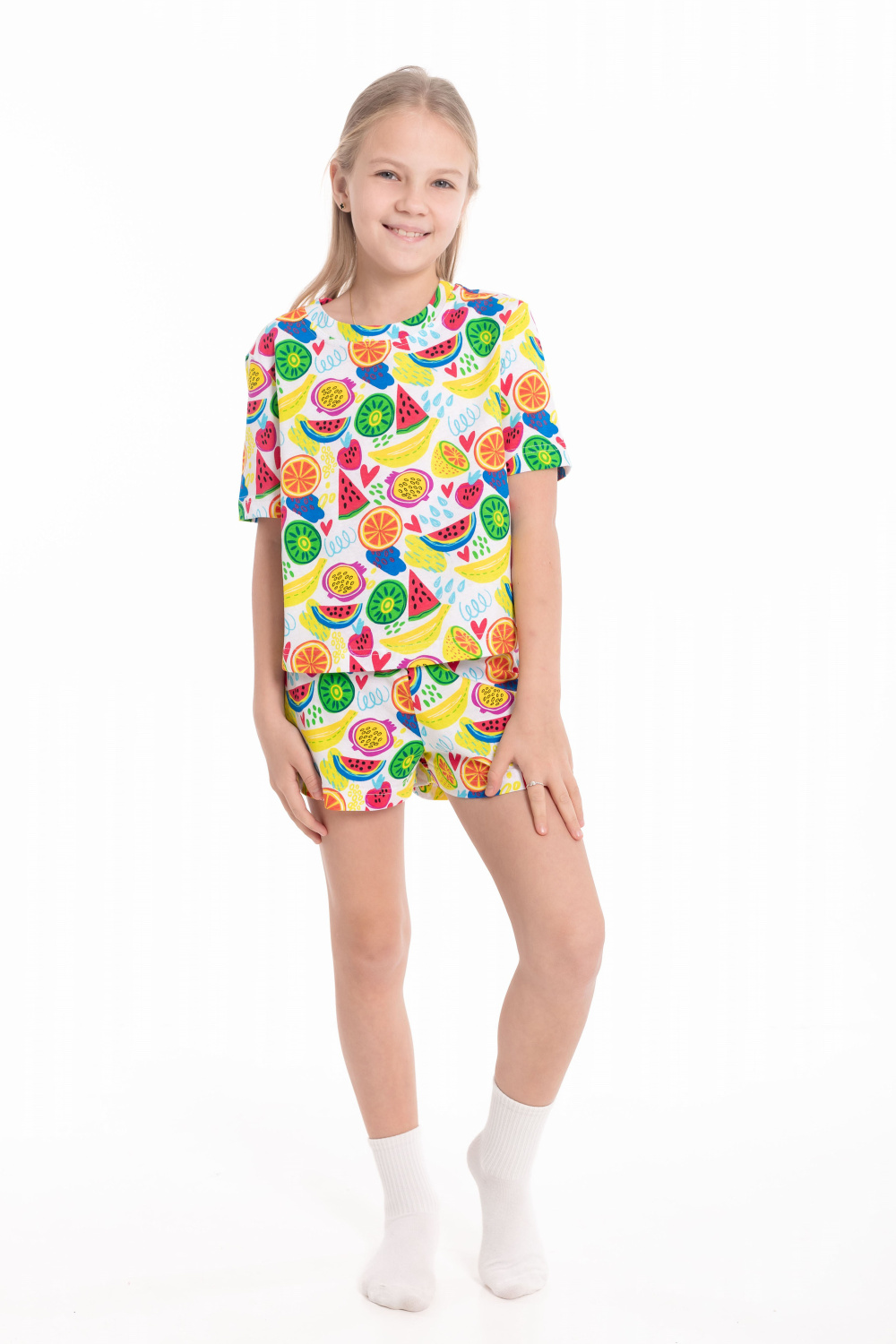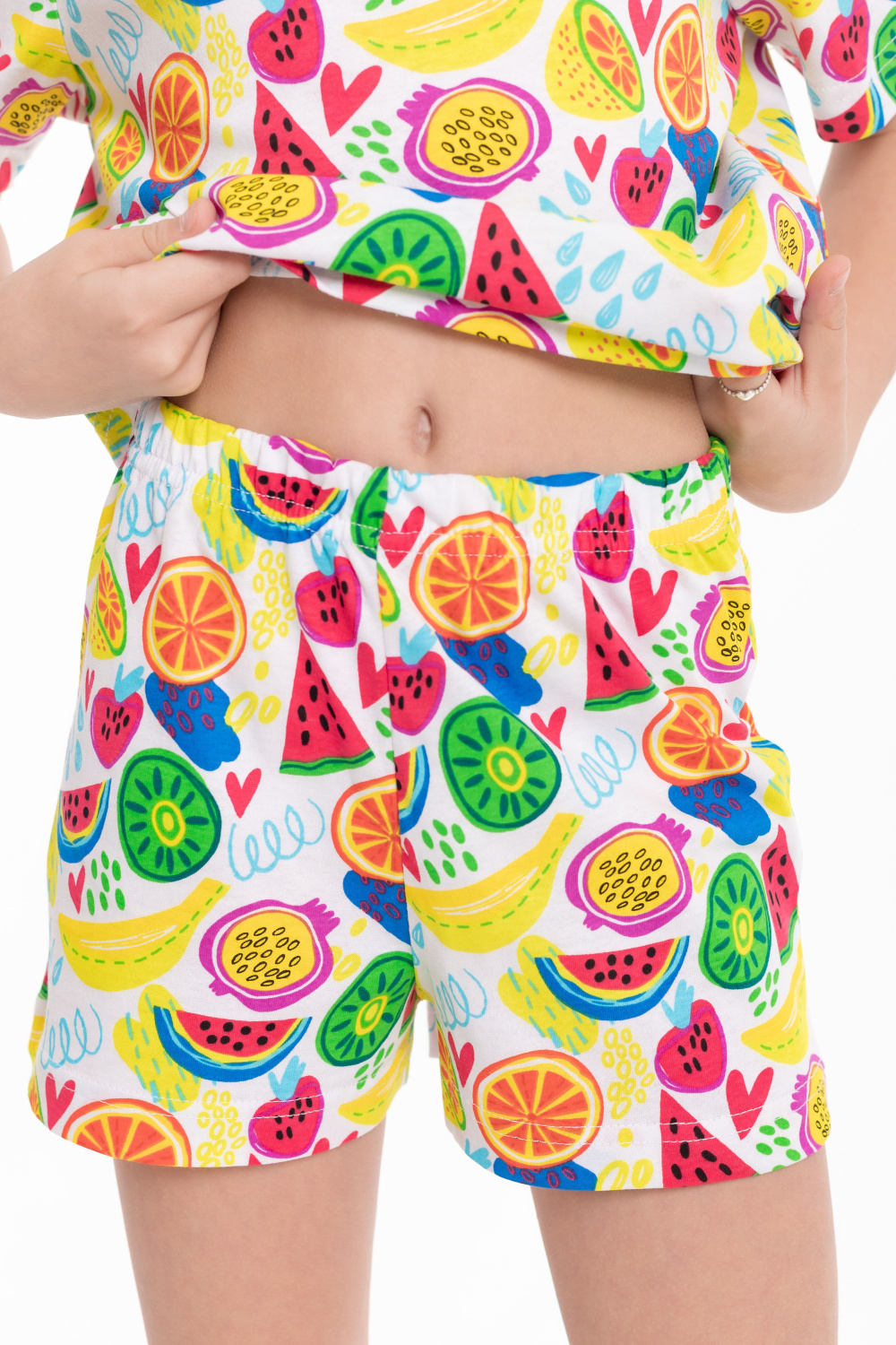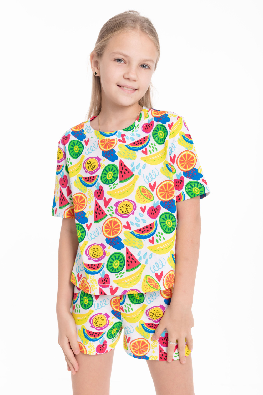Пижама из мягкой кулирки — удобный вариант для сна и домашнего отдыха. Комплект состоит из футболки с коротким втачным рукавом и шорт с поясом на эластичной резинке. Приятная к телу ткань обеспечивает комфорт и свободу движений во время сна.
