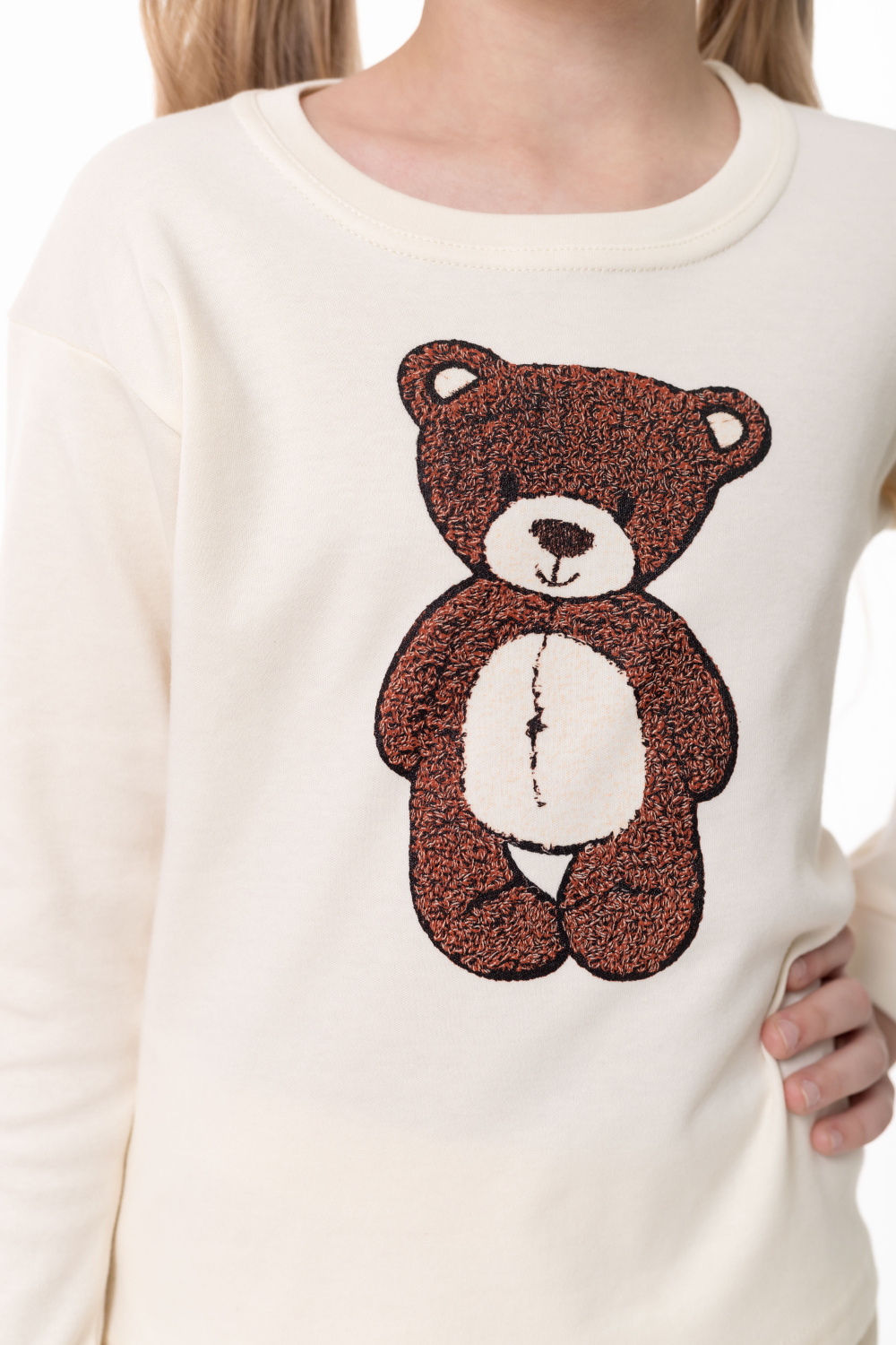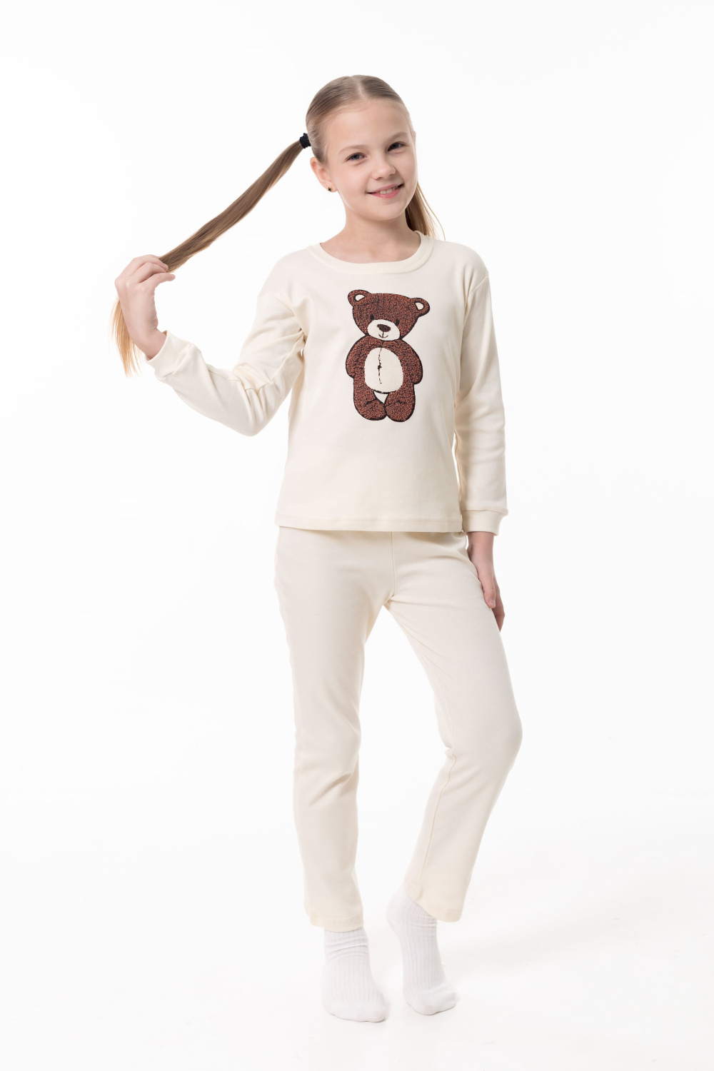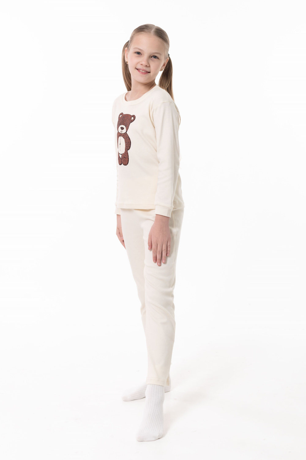 Детская пижама выполнена из мягкого и приятного к телу интерлока, который хорошо сохраняет тепло и подходит для повседневной носки. Лонгслив с манжетами по низу рукавов, обеспечивающими комфортную посадку. Спереди изделие украшено милым принтом в виде медвежонка. Брюки выполнены на удобной резинке, без карманов, не стесняют движений ребёнка во время сна и отдыха. Пижама отлично подойдёт для уютных вечеров и комфортного сна.
