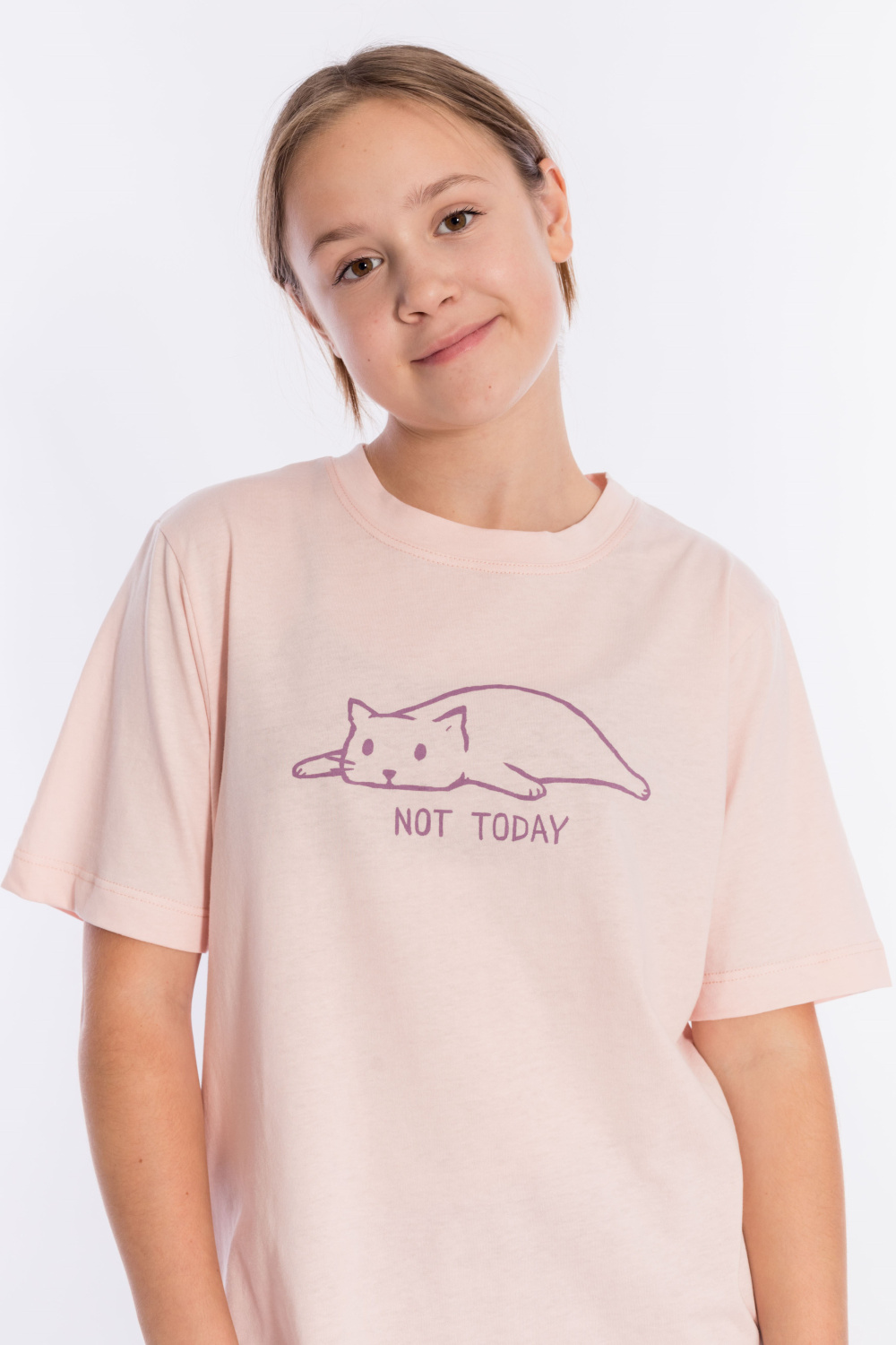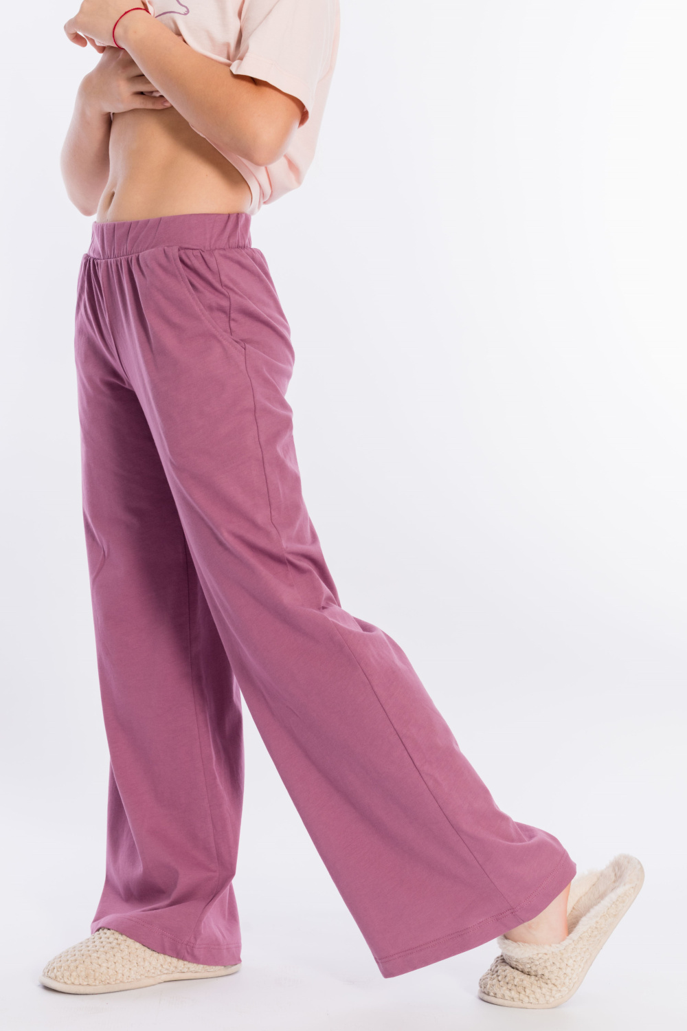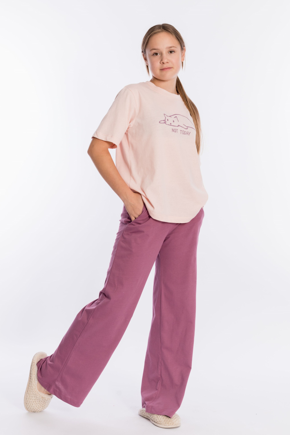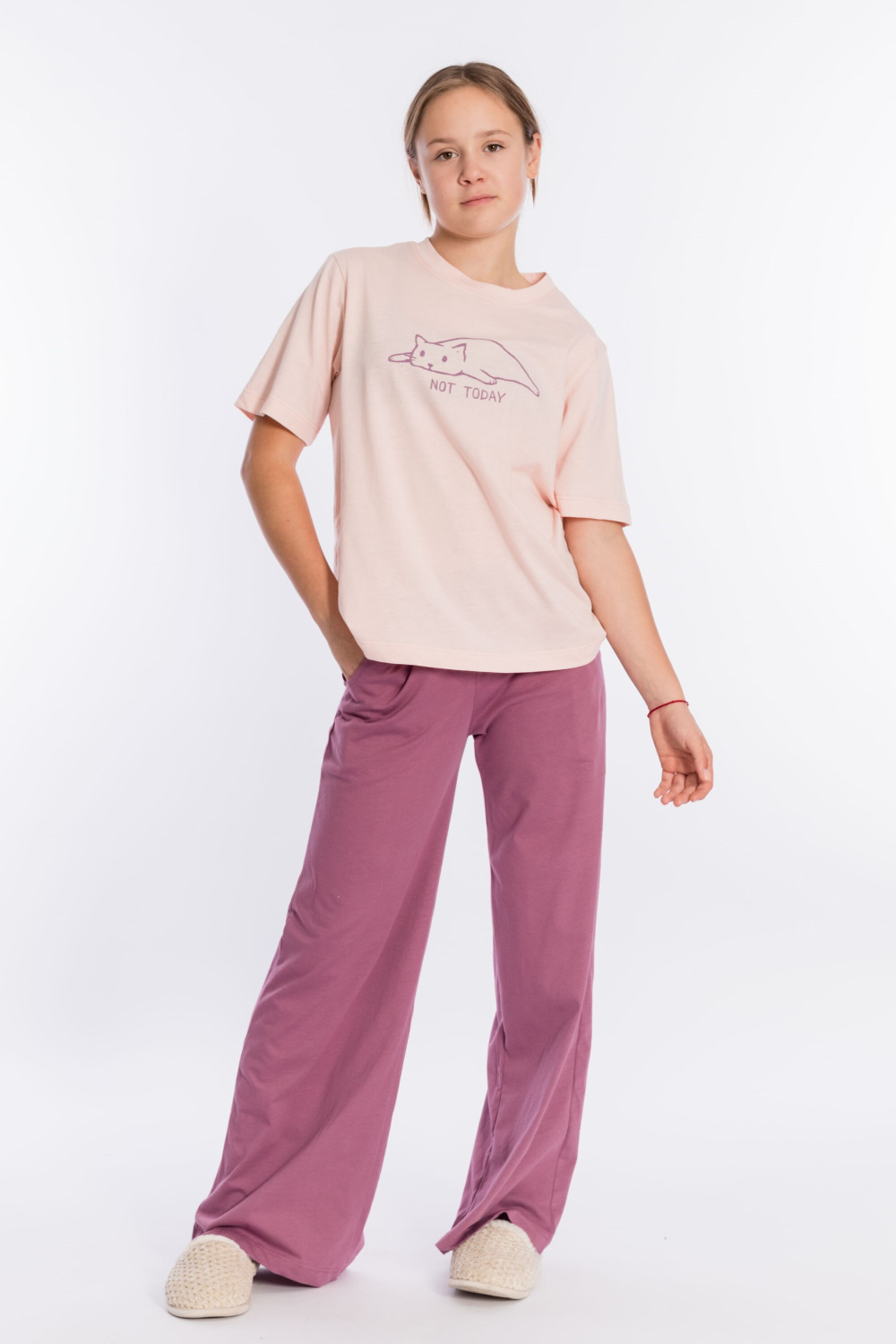 Костюм выполнен из однотонной кулирки, 100% хлопок. Футболка с коротким рукавом и округлым вырезом горловины, оформленным планкой. Спереди на футболке принт. Брюки свободные, с поясом на резинке и карманами по бокам.