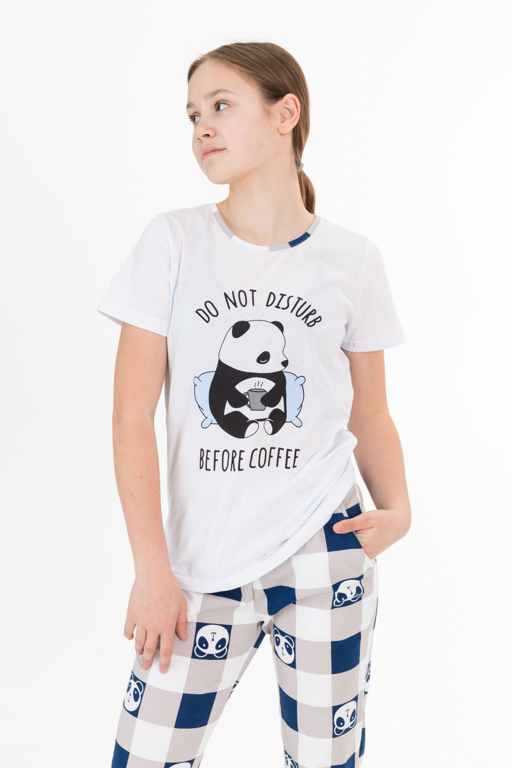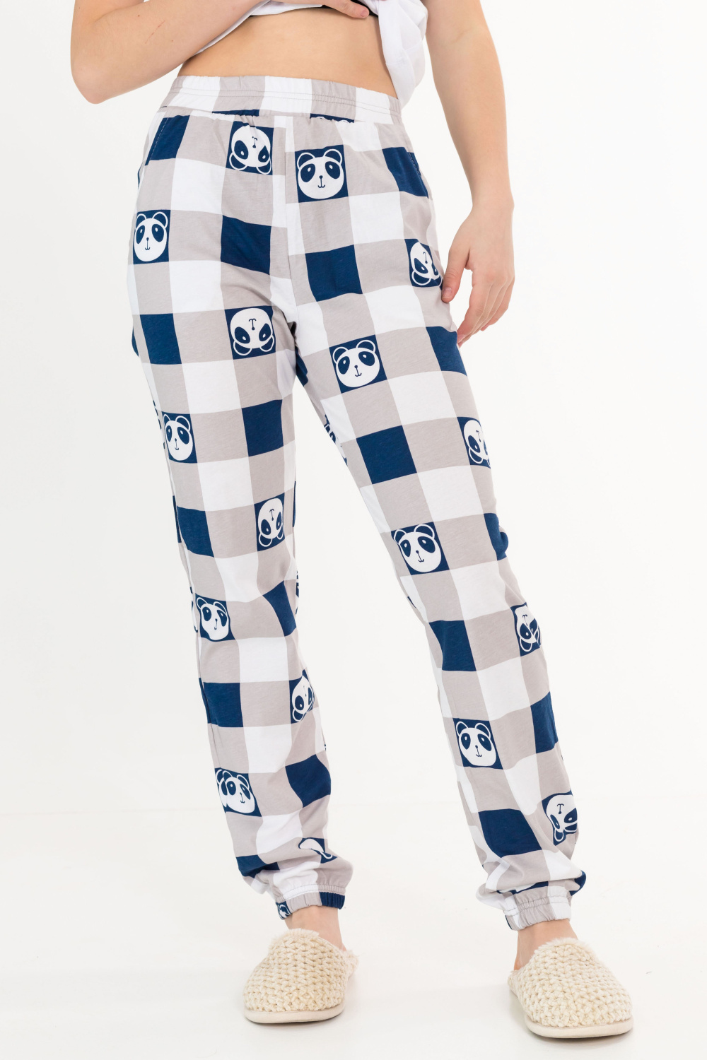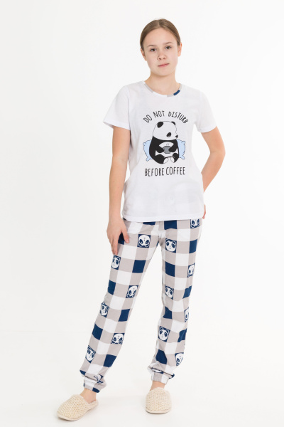 Футболка с принтом спереди, горловина обработана бейкой. Брюки с карманами по бокам, низ слегка присборен резинкой.