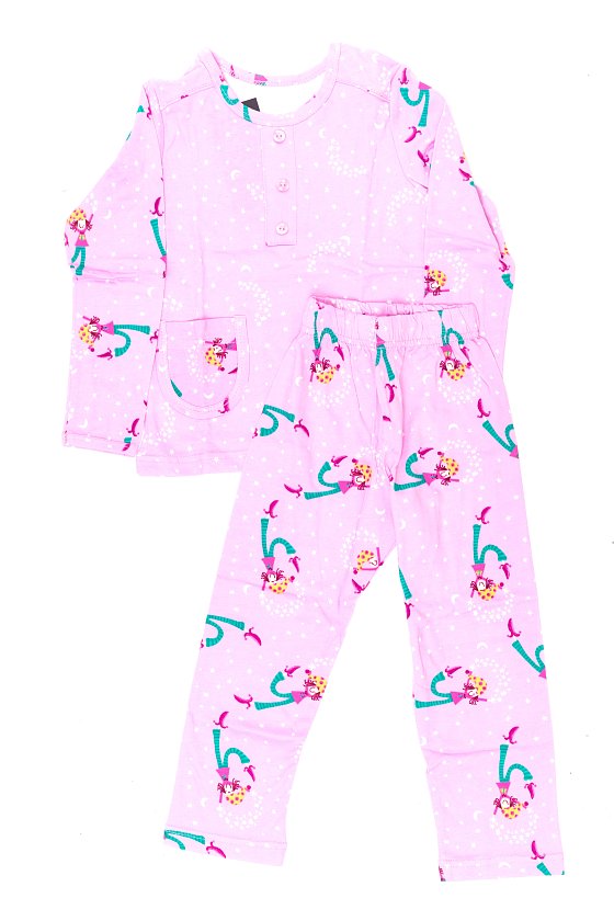 Пижама для девочек, выполнена из 100% хлопковой ткани. Футболка с длинным рукавом, спереди с карманами и планкой, имитирующей застёжку на пуговицы. Брюки прямого покроя на резине по поясу..