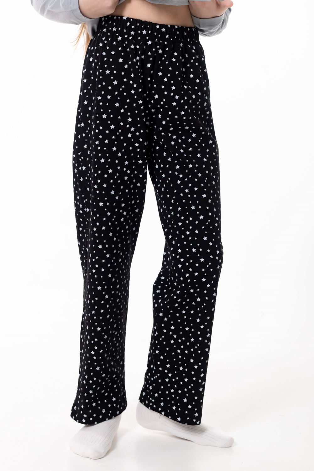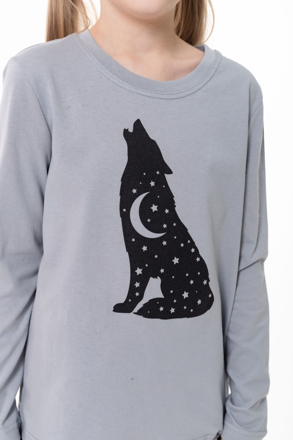 Детская пижама выполнена из однотонного хлопкового полотна, приятного к телу и комфортного в носке. Комплект состоит из лонгслива с круглым вырезом горловины, украшенного принтом, и брюк прямого кроя. Брюки имеют пояс на резинке и среднюю посадку, что обеспечивает удобство и свободу движений во время сна и домашнего отдыха.