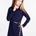 Платье выполнено из футера с лайкрой, силуэт слегка свободный, спереди настрочен декоративный пояс из репсовой тесьмы с принтом. Низ платья и рукавов оформлен притачными, чуть расклешёнными планками.